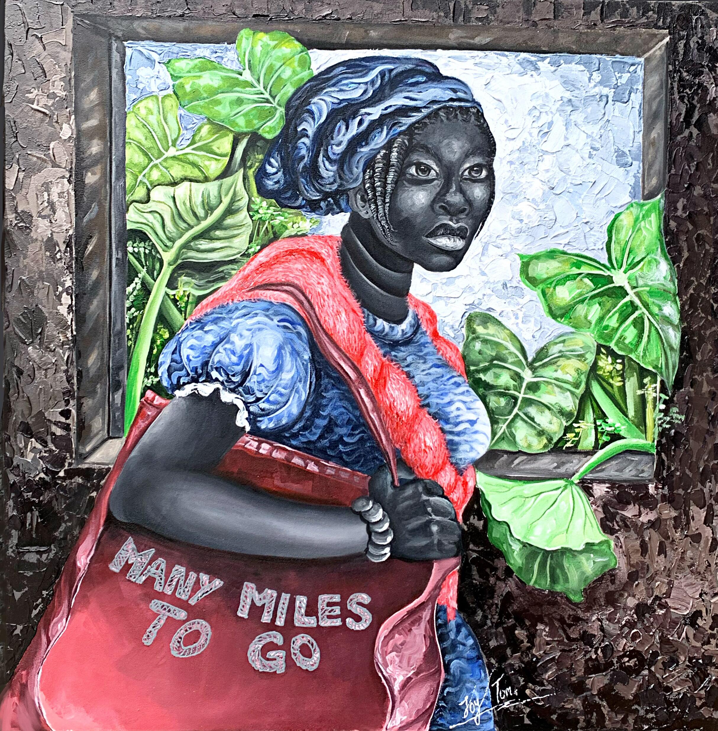 Je trouve le travail d'Idara Tom tout simplement magnifique. Chacune de ses peintures semble être une porte d'entrée vers un monde qu'elle a créé, un monde où les histoires humaines, les émotions et la nature se fondent dans une beauté évocatrice et texturée. Chaque fois que je regarde l'une de ses œuvres, mon imagination s'envole et je me retrouve plongée dans son langage visuel.