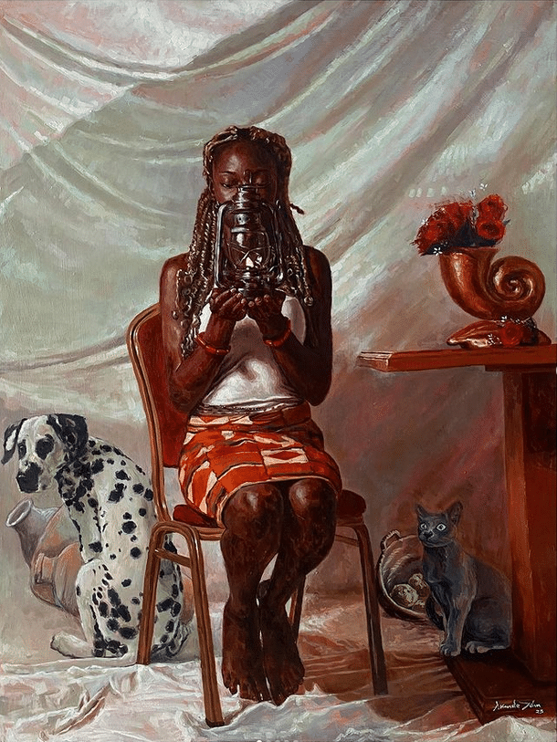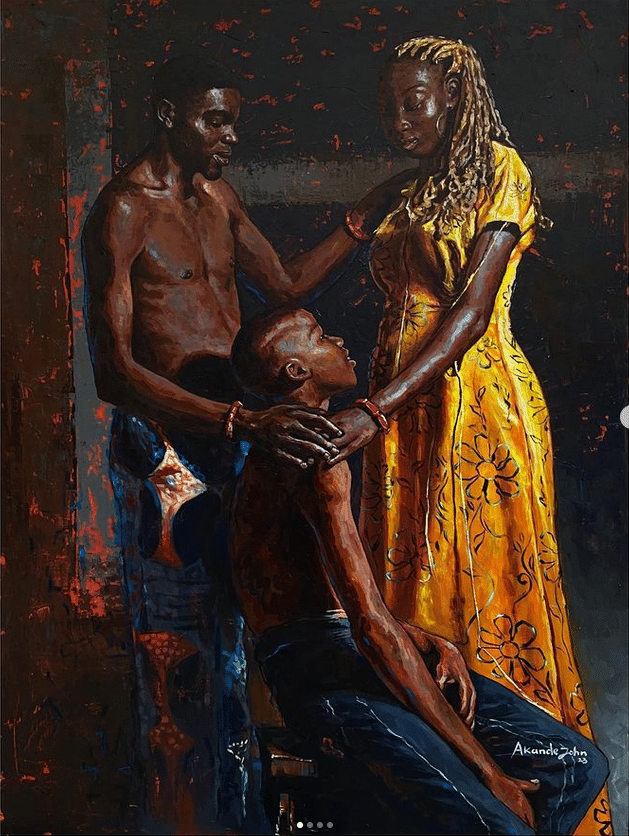 En tant qu'artiste, j'ai été immédiatement séduit par le travail de John Akande dès que je l'ai découvert. Ses œuvres dégagent une sincérité et une présence émotionnelle qui invitent à l'attention et à la réflexion. Ce sentiment m'a tellement marqué que j'ai fini par le contacter pour lui proposer de rejoindre l'ARTssemblée. Je lui ai envoyé un message sur Instagram et, à ma grande surprise, il m'a répondu en quelques minutes. Nous avons prévu un appel vidéo le lendemain, qui s'est transformé en un échange vraiment agréable et enrichissant.