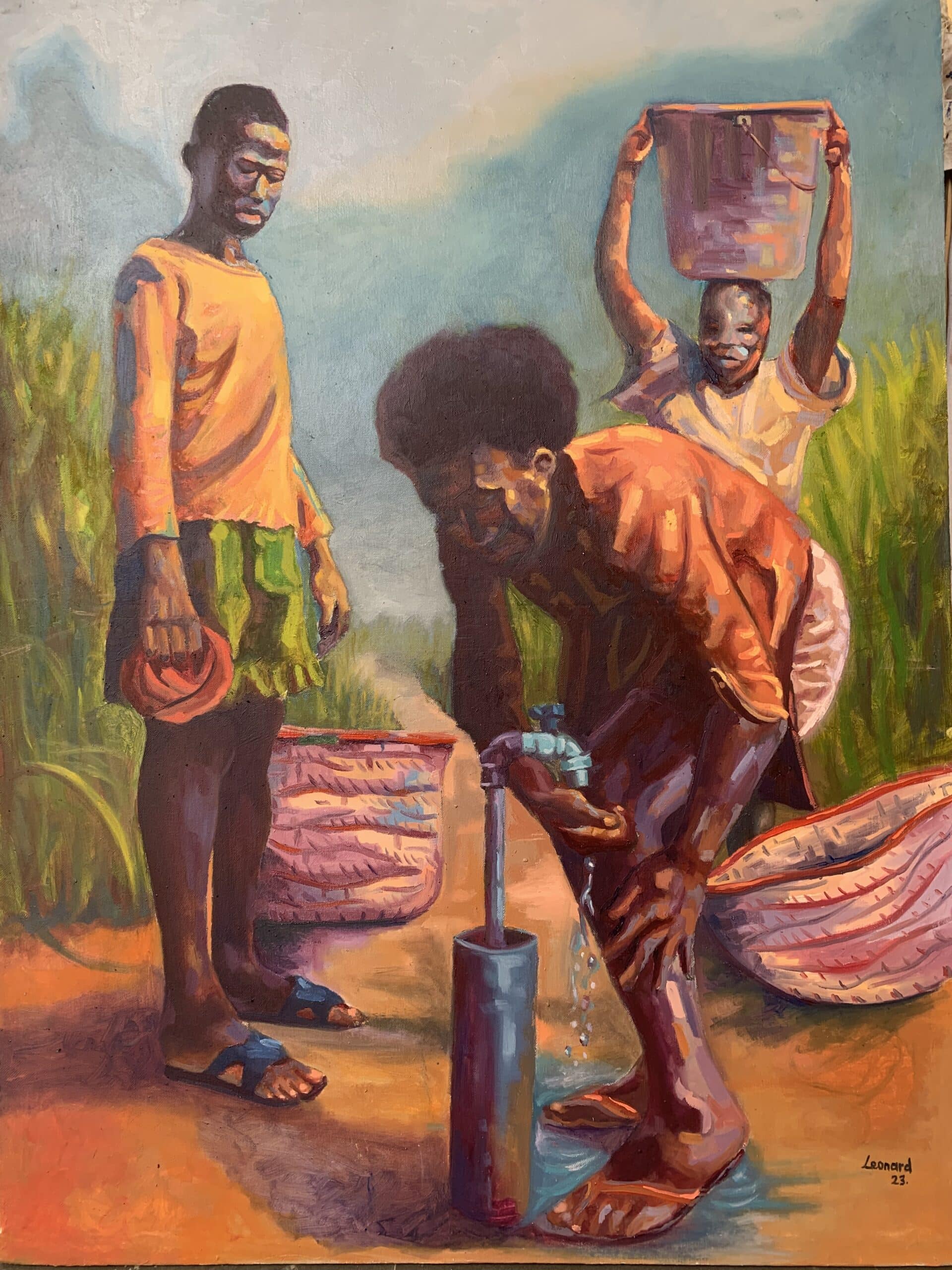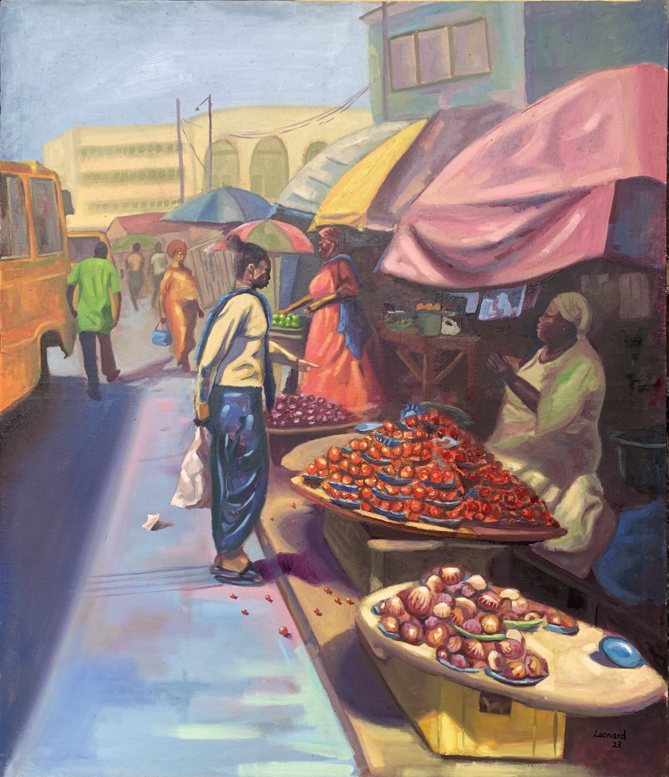 La première fois que j’ai découvert le travail de Leonard Ikechukwu Ogar, j’ai eu l’impression qu’il respirait la vie. Ses peintures ont ce pouvoir rare de m’absorber entièrement, grâce à un réalisme saisissant et une richesse chromatique qui attisent l’imagination et insufflent une énergie vibrante à chaque scène.
