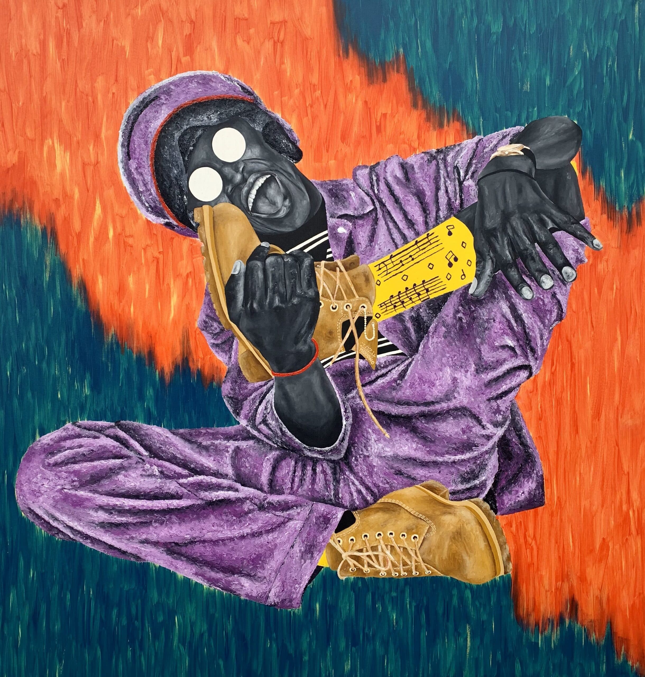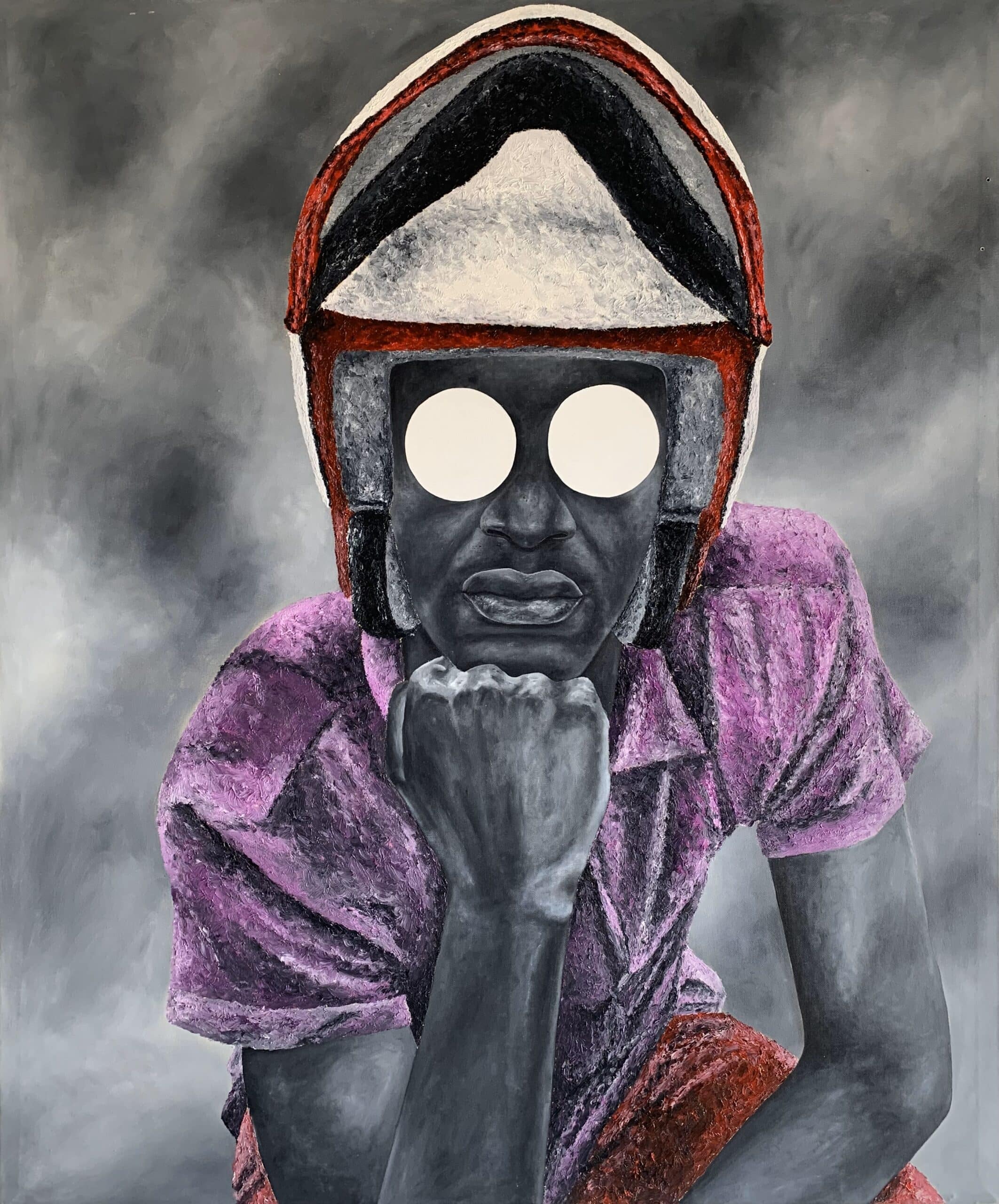 Au cours de notre conversation, Mouono m'a révélé l'origine de cette particularité. Des années auparavant, la trahison d'un ami proche l'avait laissé paralysé sur le plan créatif. Lorsqu'il a finalement repris le pinceau, les visages qu'il peignait étaient vides, comme pour effacer le « traître » de sa mémoire. Au fil du temps, les traits sont réapparus, mais les yeux sont restés absents, remplacés par des bulles blanches lumineuses. Ce qui était au départ une cicatrice est devenu un symbole, à la fois rappel de sa vulnérabilité et marque distinctive de la beauté dans son art.