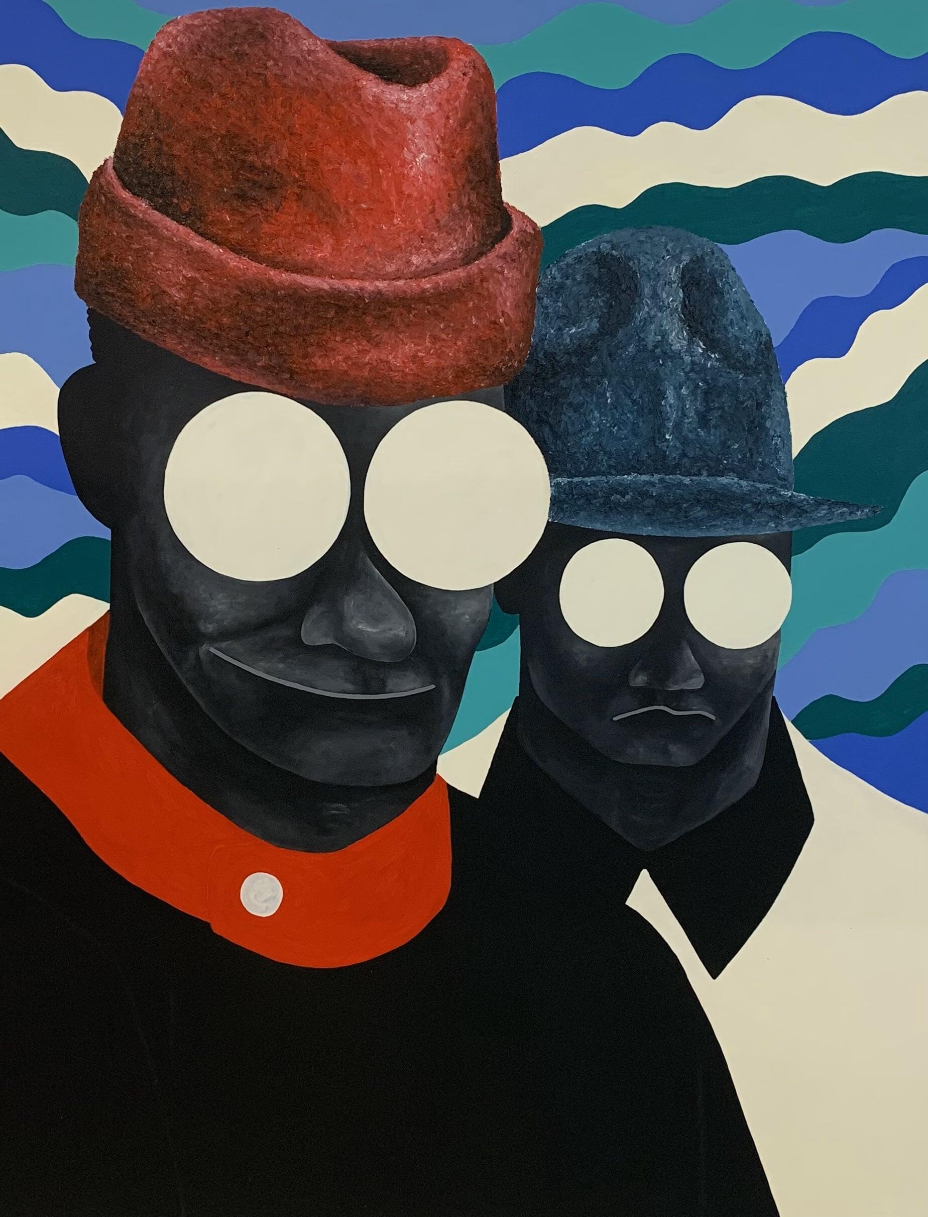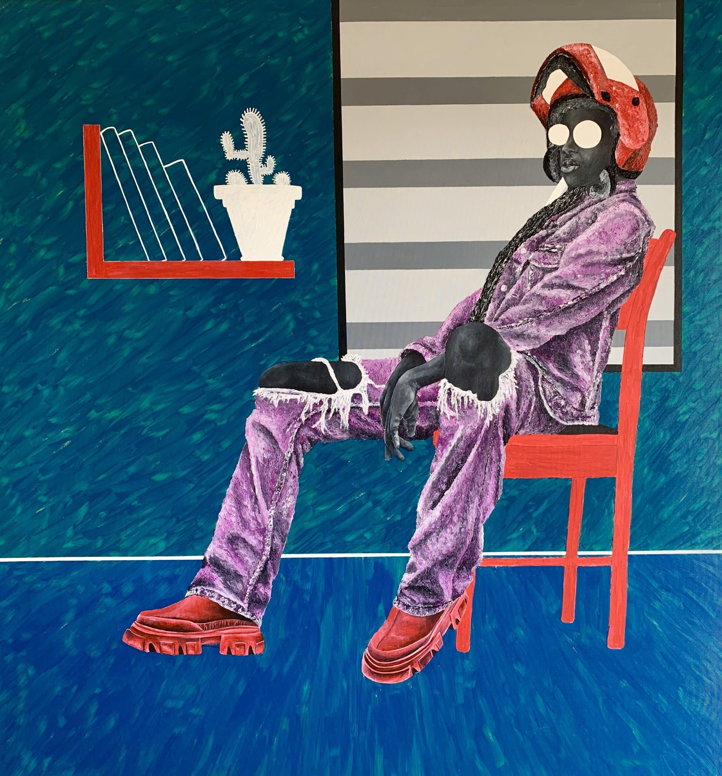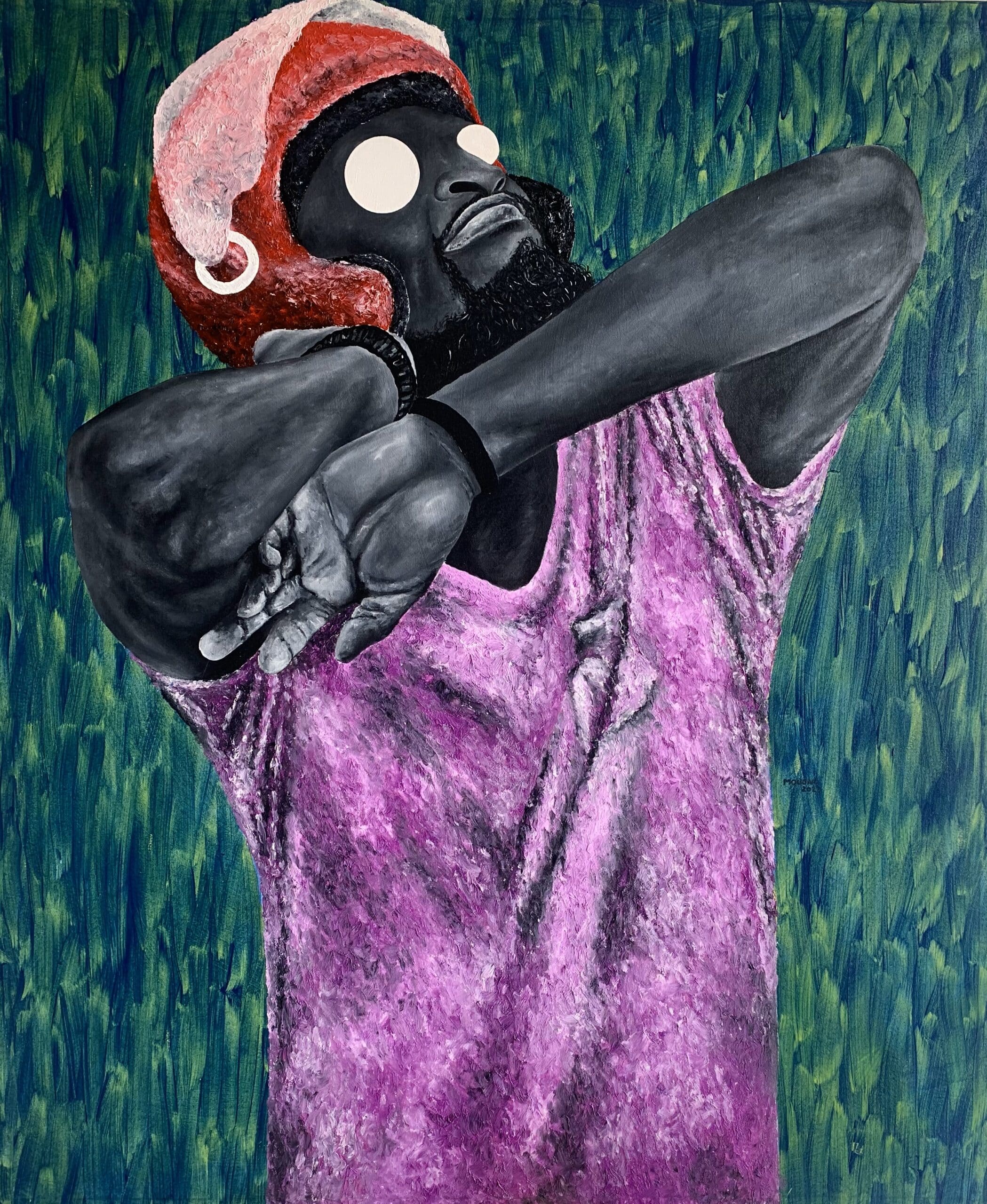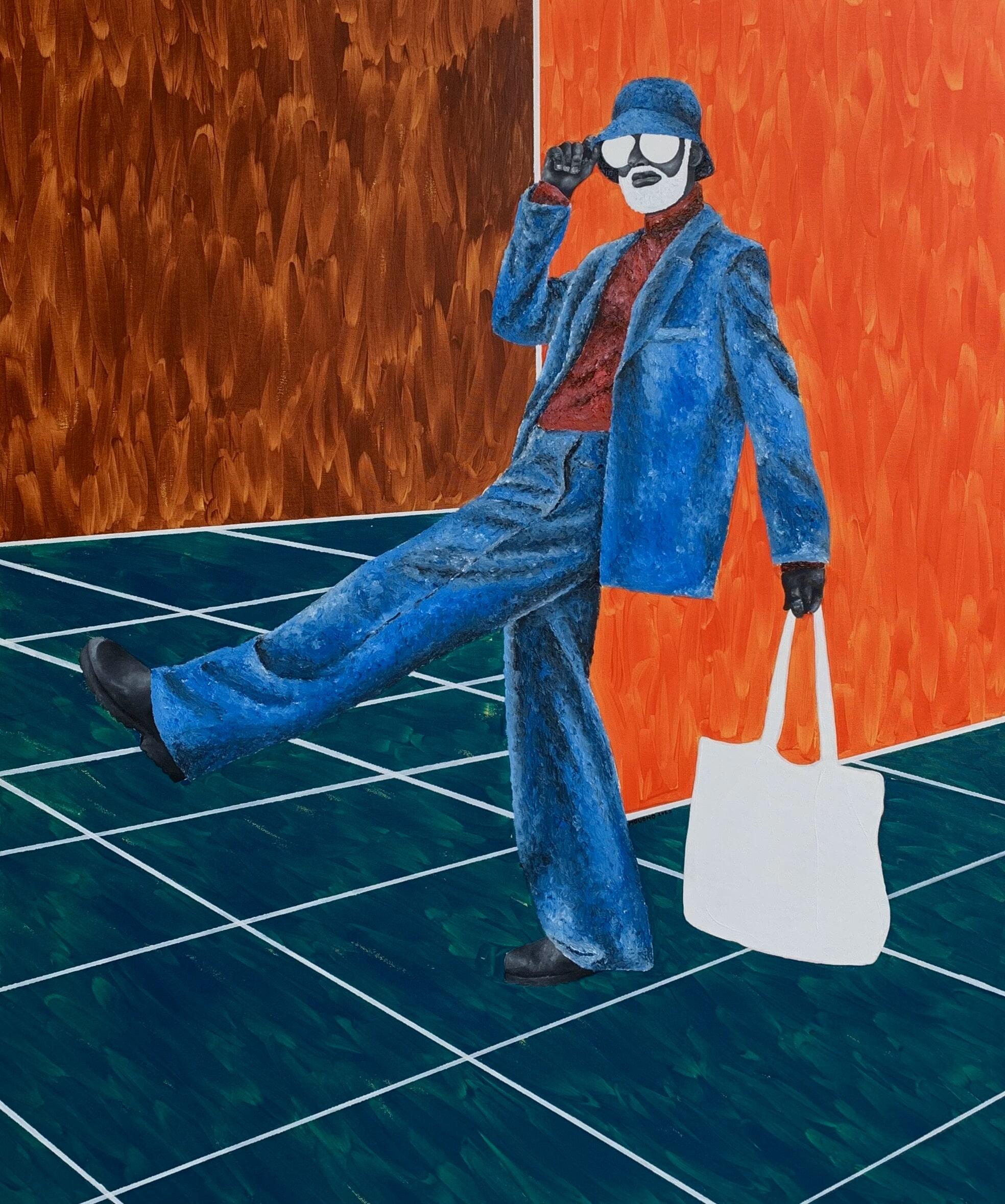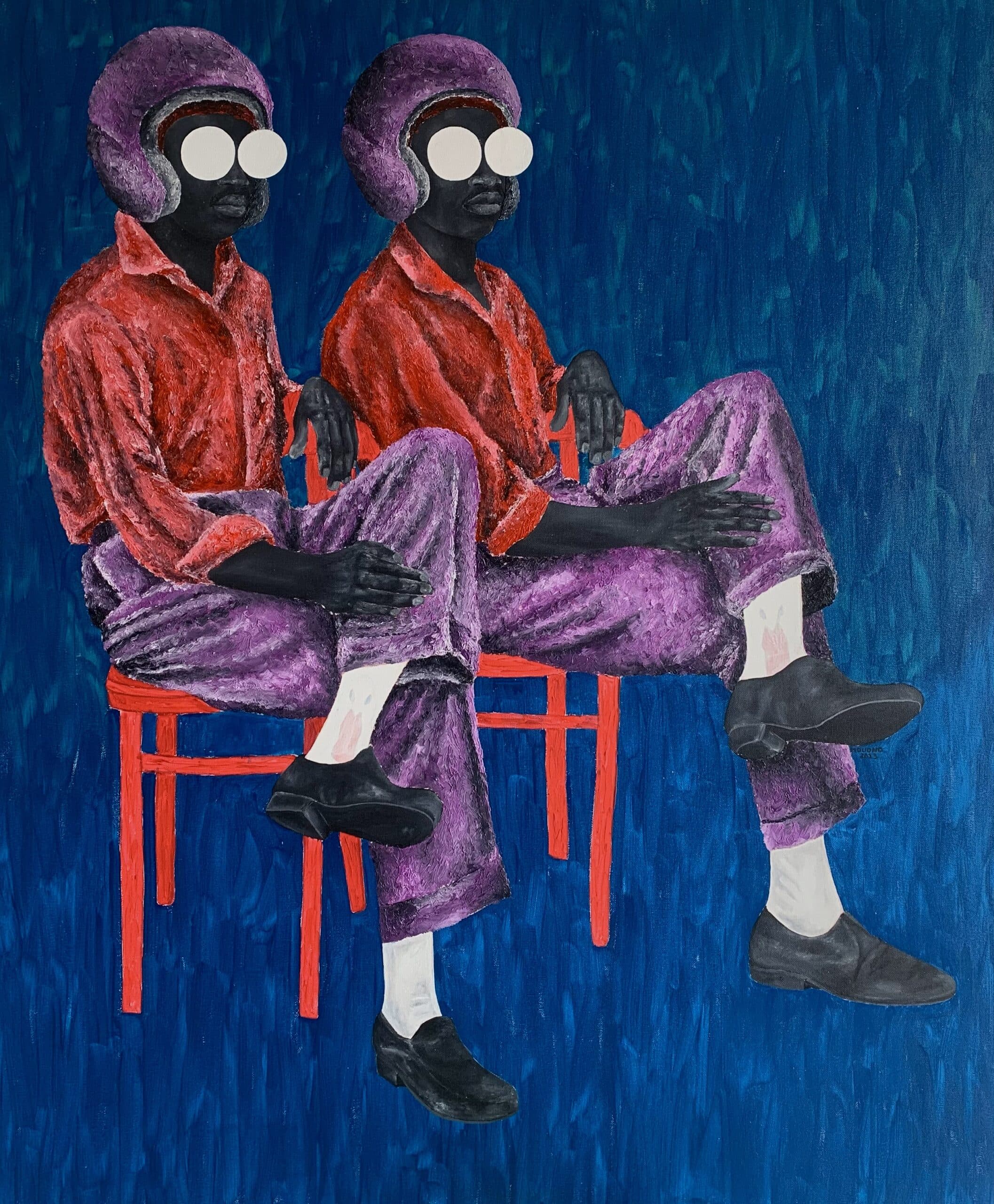 J'ai découvert le travail de Mouono sur Instagram, où ses toiles m'ont immédiatement frappé par leur excentricité magnifique, riche en mystère, en émotion et en élégance. Ses personnages, souvent dépourvus d'yeux, semblaient regarder directement dans l'âme, malgré l'absence apparente de regard.