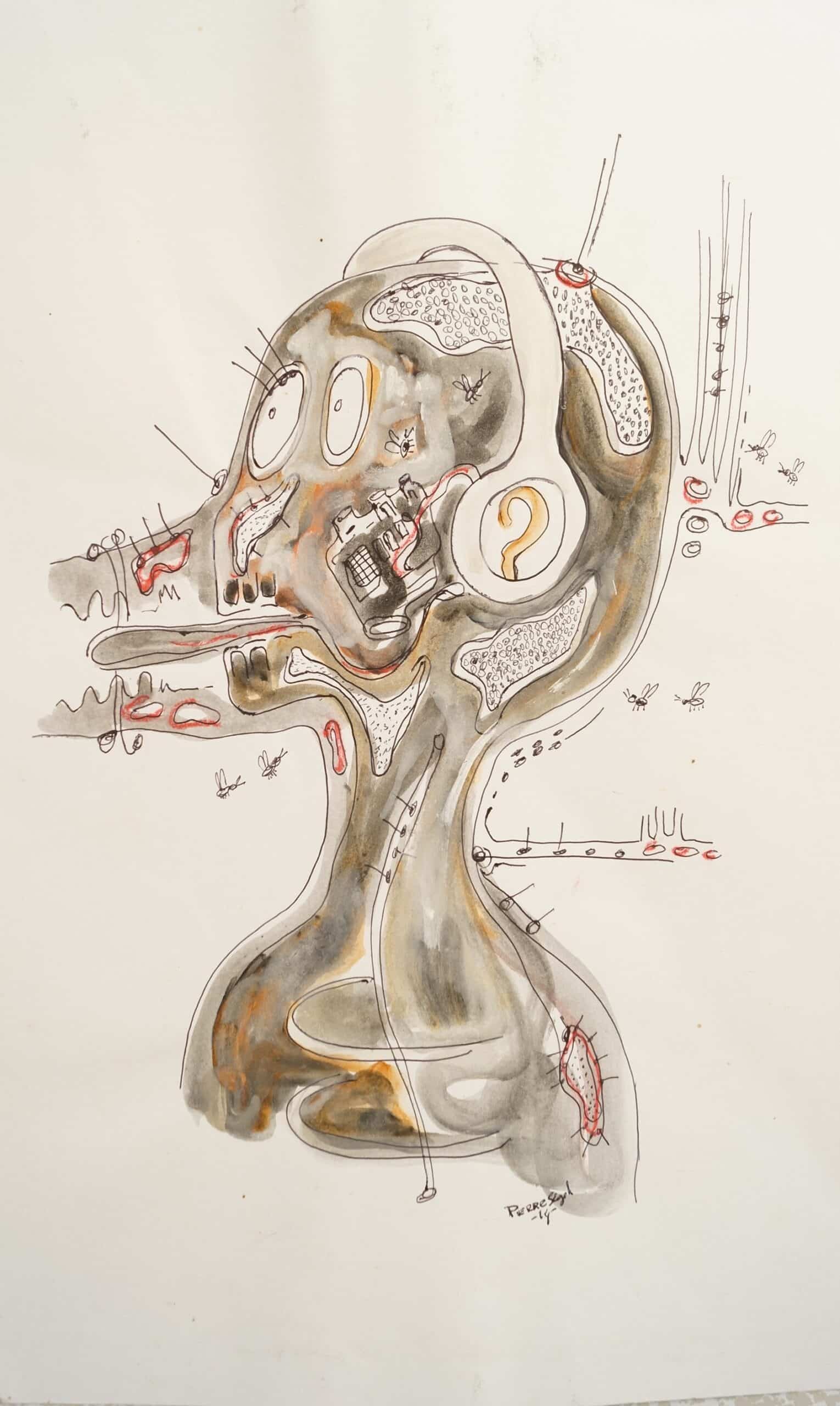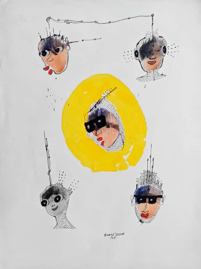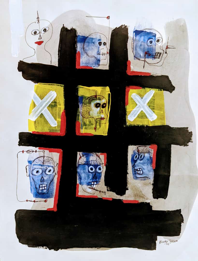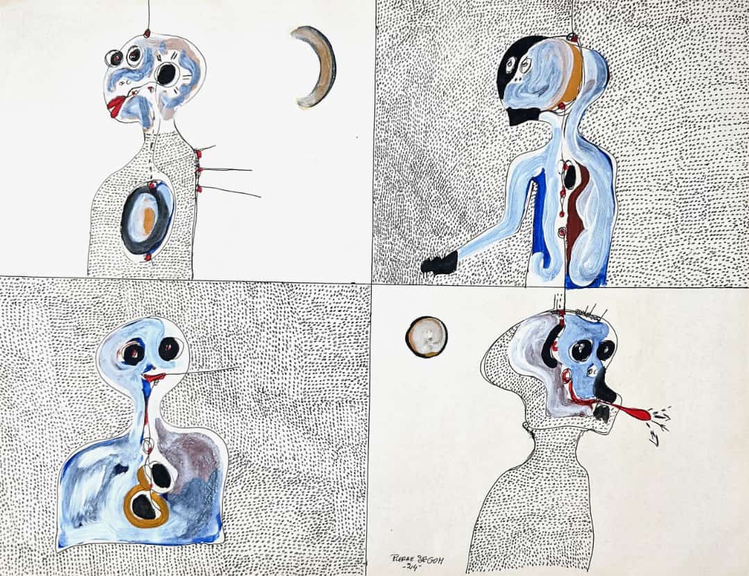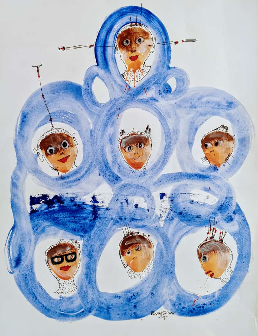 Travaillant principalement avec de la peinture et des stylos à bille sur toile et sur papier, Pierre navigue entre petits et grands formats pour explorer les multiples dimensions de la condition humaine. Pour lui, la première émotion qu'il ressent en réponse à une situation sert d'étincelle, d'ignition qui mène à la création.