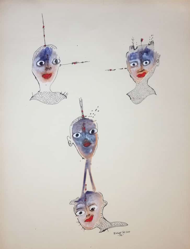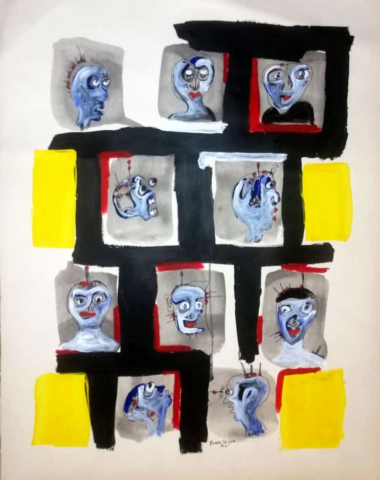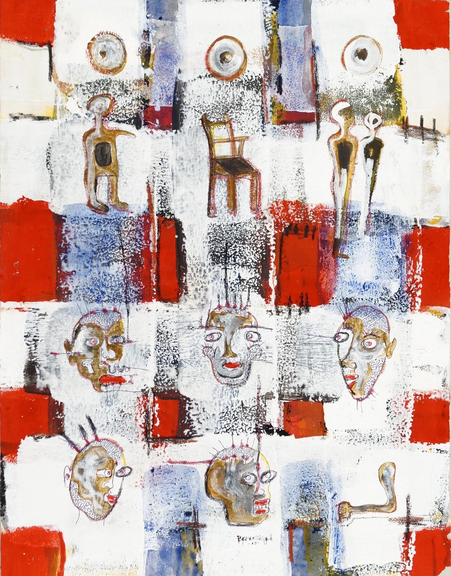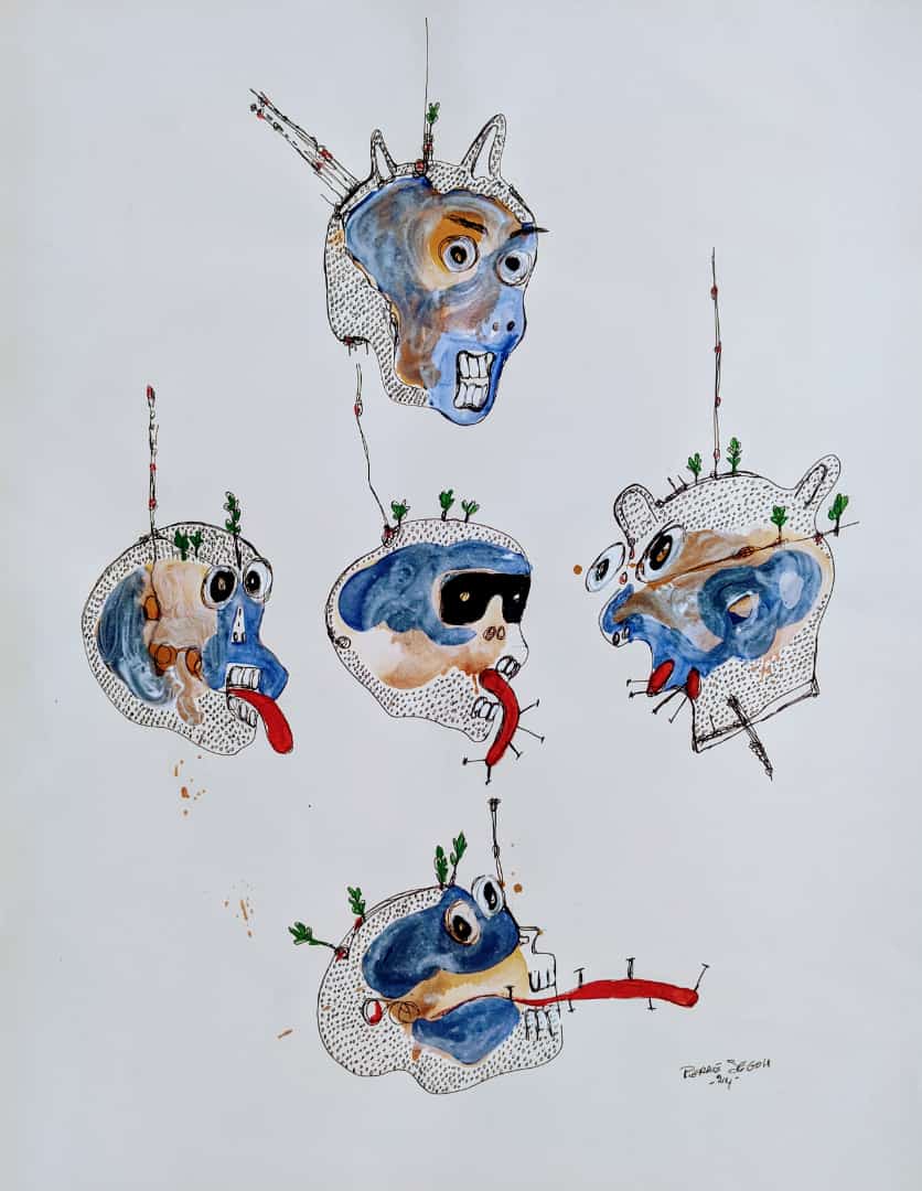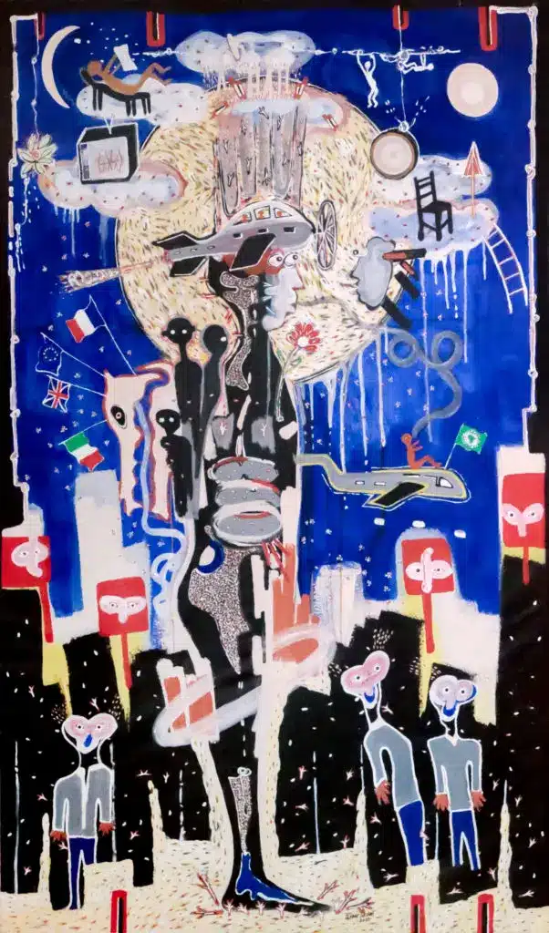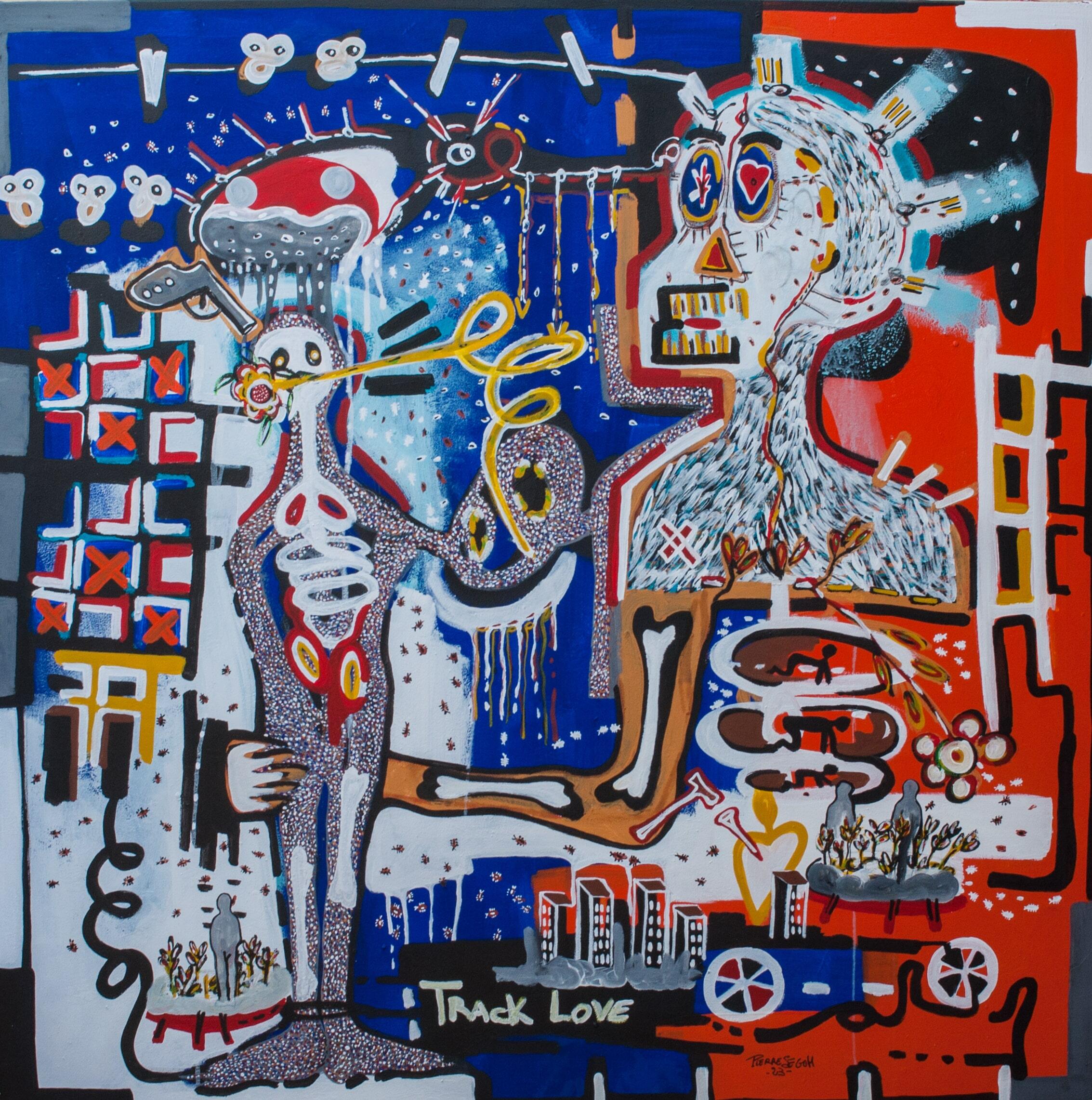 Travaillant principalement avec de la peinture et des stylos à bille sur toile et sur papier, Pierre navigue entre petits et grands formats pour explorer les multiples dimensions de la condition humaine. Pour lui, la première émotion qu'il ressent en réponse à une situation sert d'étincelle, d'ignition qui mène à la création.