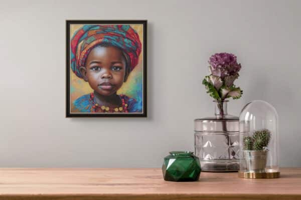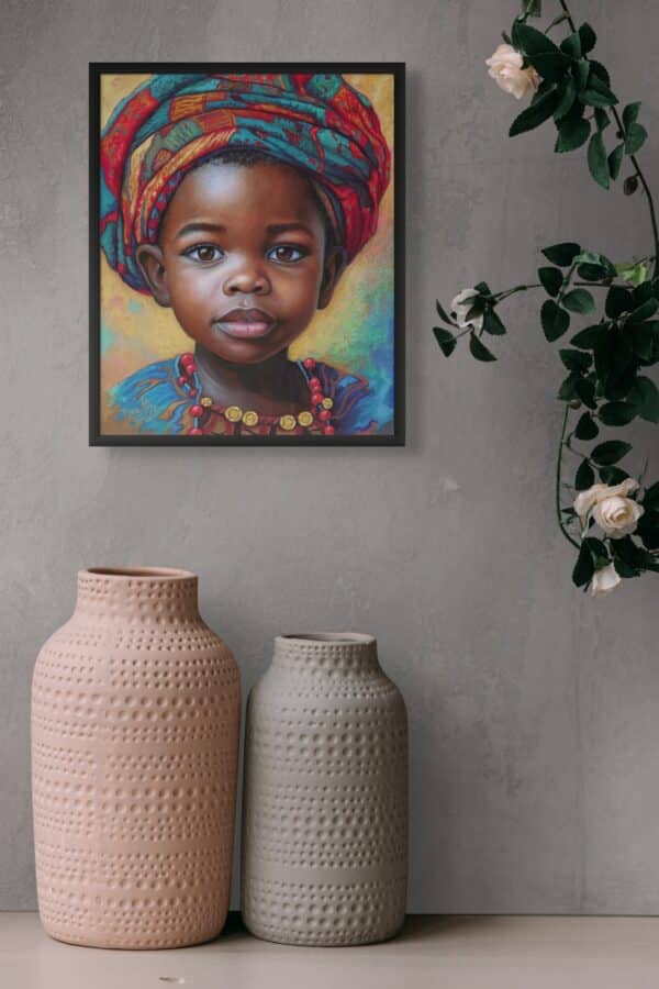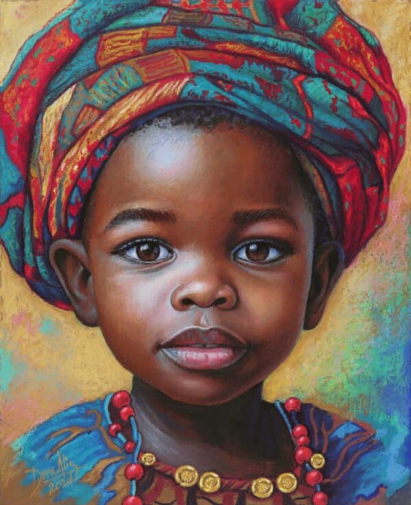 Cette œuvre est une célébration vibrante de couleurs et d'émotions, capturant l'essence de l'enfance et de la pureté. En utilisant des pastels à l'huile, j'ai capturé la délicatesse et la force du regard innocent d'un enfant, enveloppé dans de riches tissus traditionnels qui racontent des histoires de culture et de patrimoine. Chaque trait est imprégné de passion et de chaleur, dans le but d'apporter un esprit plein de vie et de beauté à tout espace où l'œuvre est exposée.
