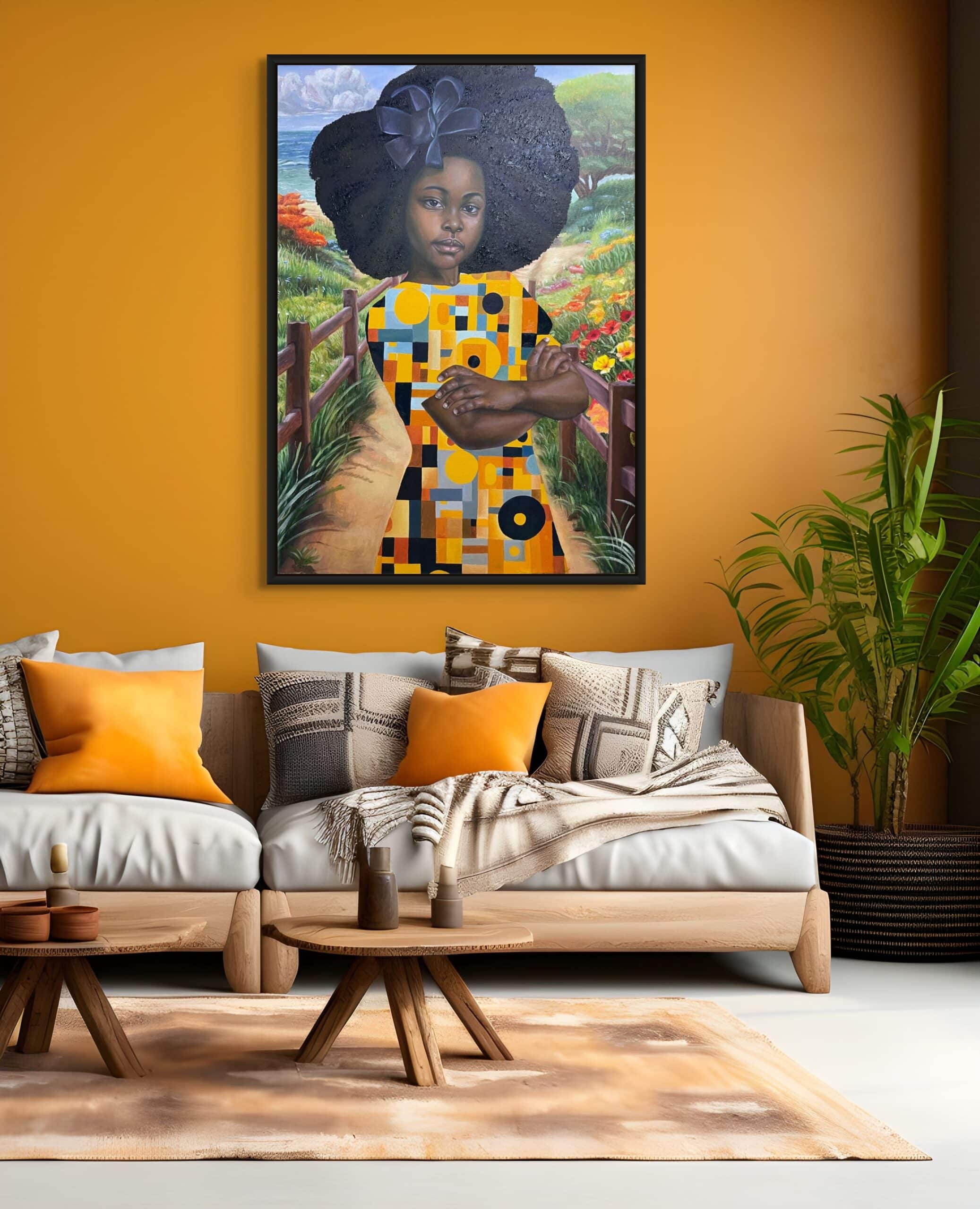 Derrière elle, le monde s’épanouit : des fleurs aux couleurs éclatantes, l’océan à perte de vue, un chemin sinueux qui s’étire comme une histoire encore en train de s’écrire. Tout semble lié. Comme si la nature la reconnaissait. Comme si elle l’encourageait.