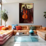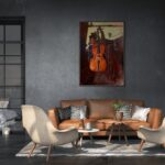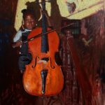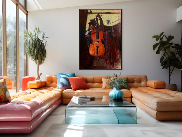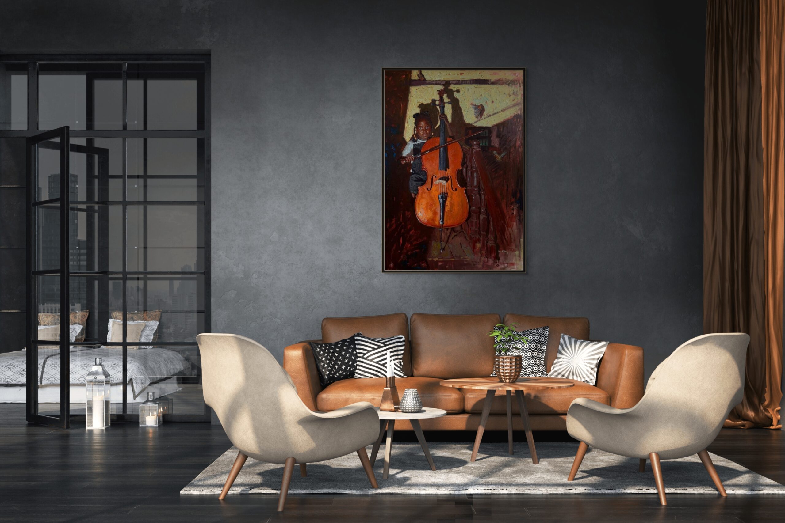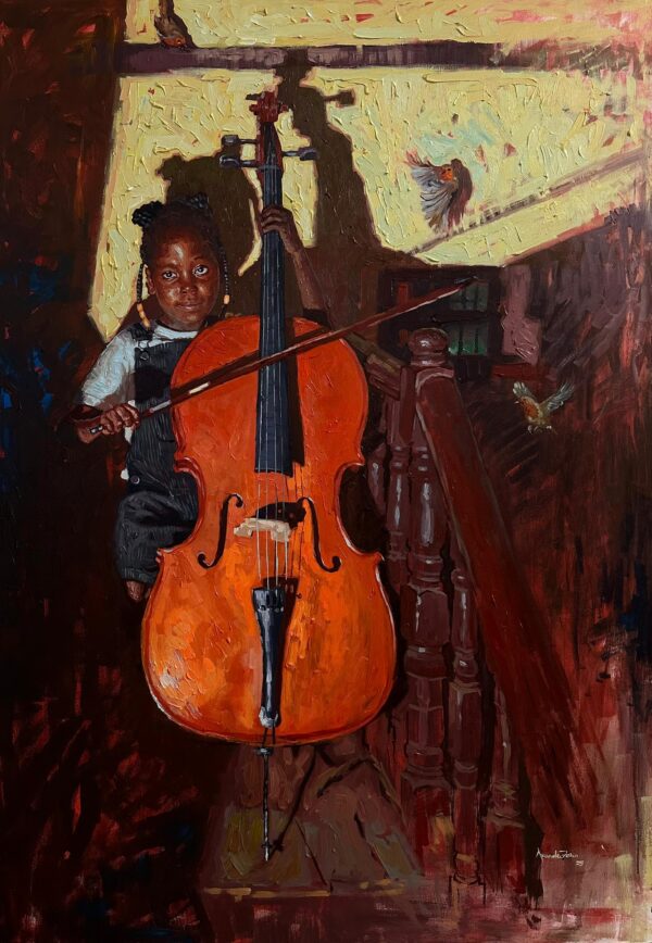 The painting captures a quiet moment of reflection, as she contemplates her next step. Will she find her own voice through the cello, or forge a path entirely her own?