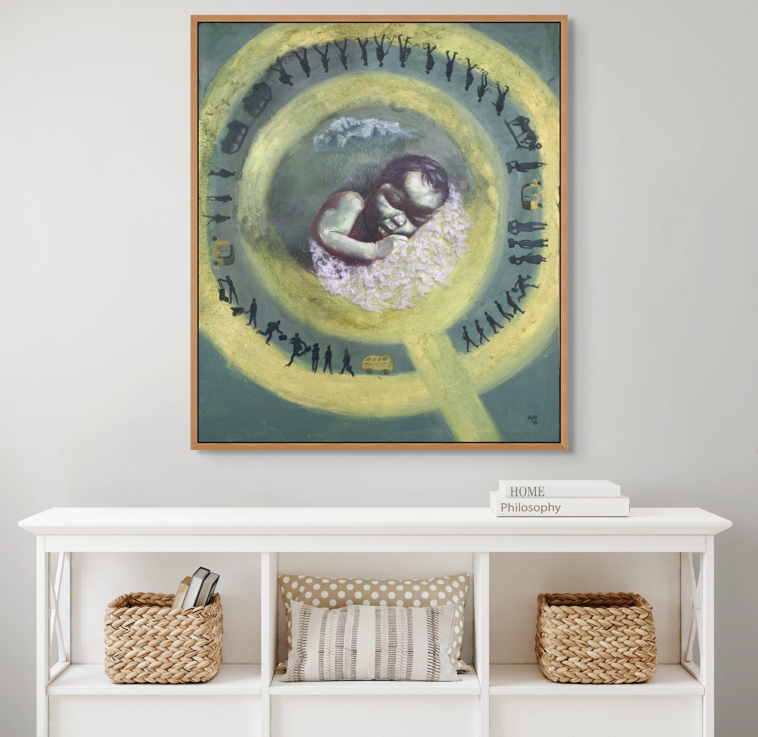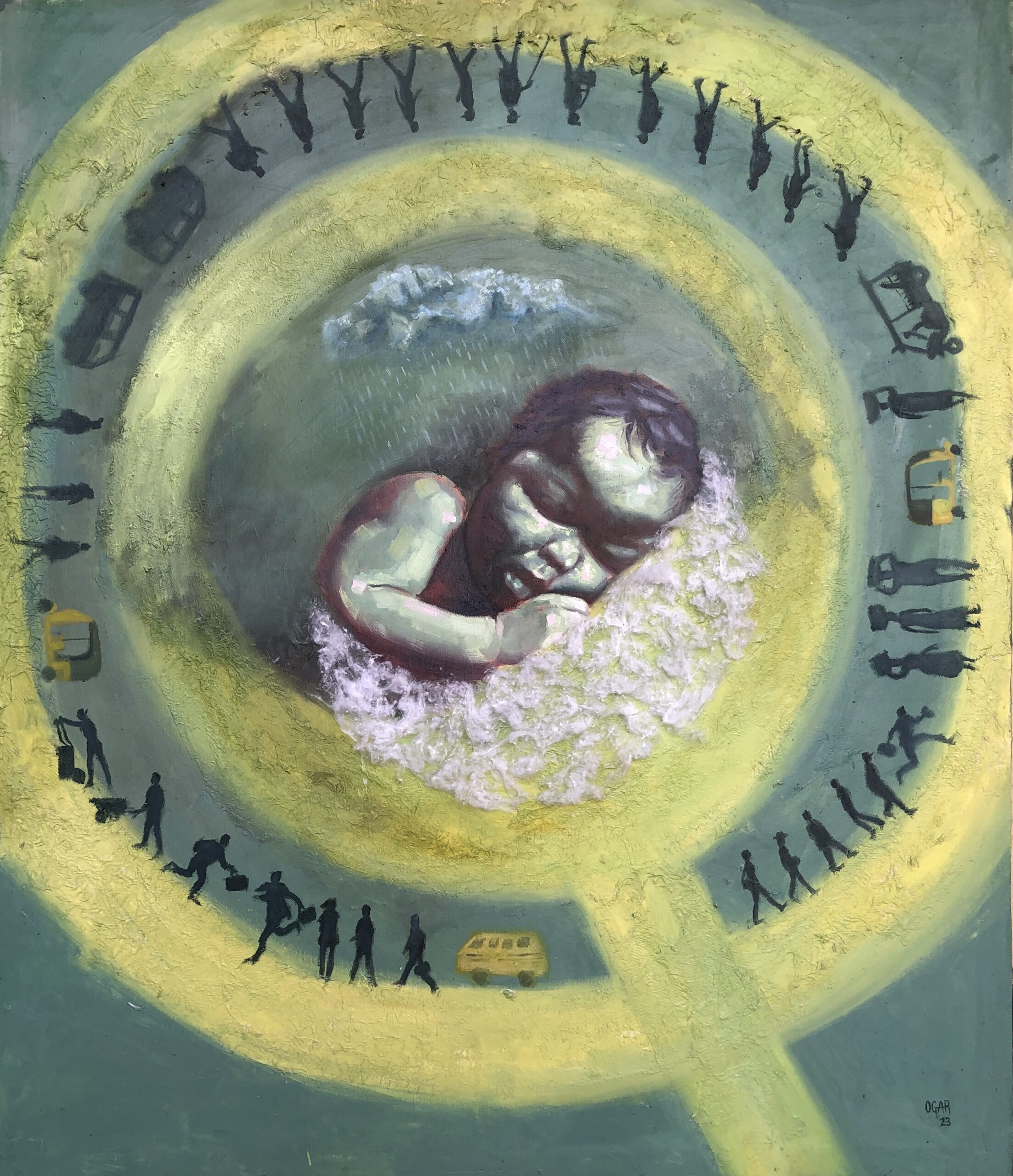 « Mon monde » est une réflexion sur le cycle continu de la vie et la quête humaine de paix et de tranquillité, à l'image du bébé représenté dans l'œuvre. Le plus souvent, le désir sous-jacent de chaque personne qui se présente chaque jour pour travailler, ou même de celles qui ont envie de jeter l'éponge, est l'espoir d'une vie et d'un quotidien meilleurs.