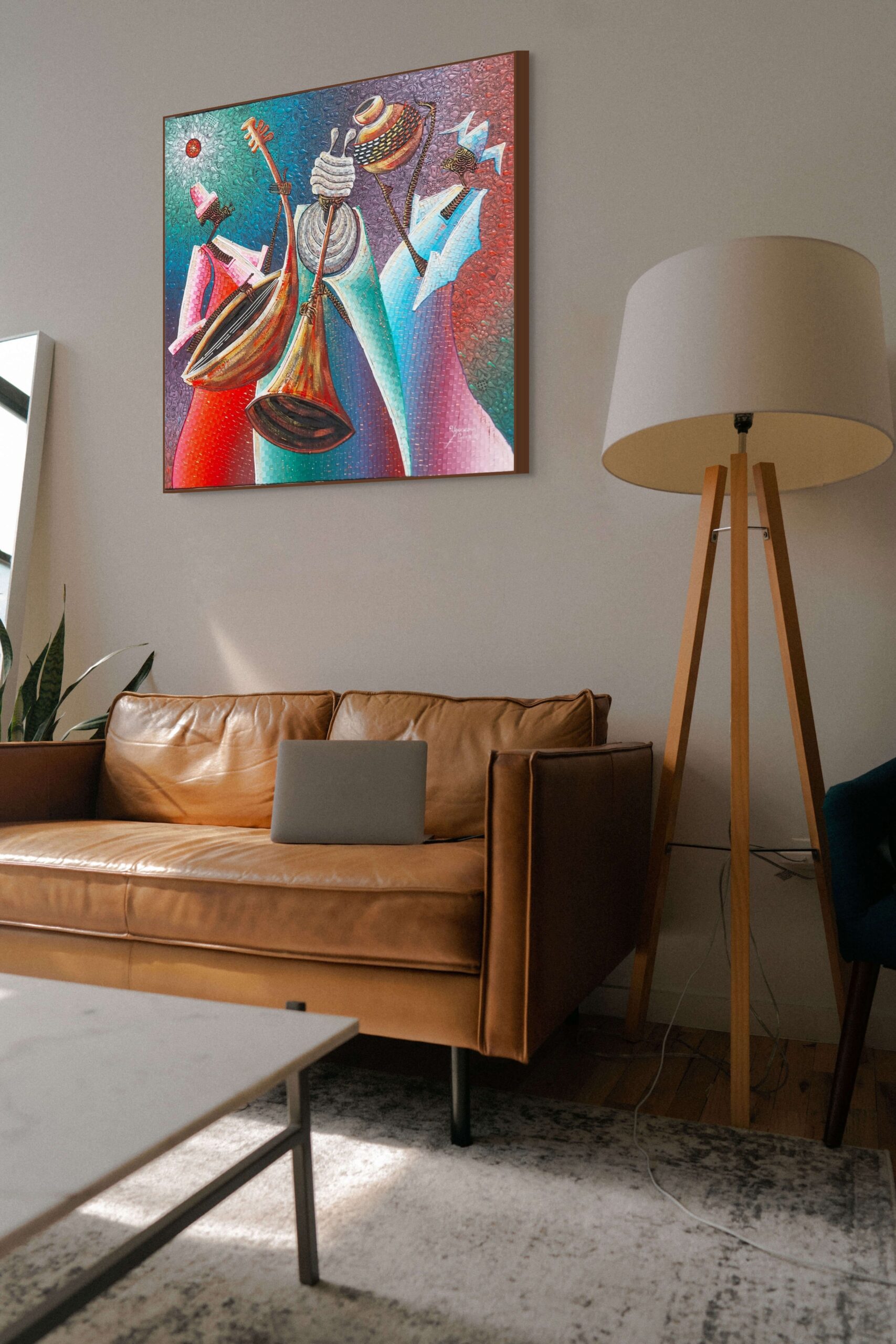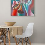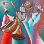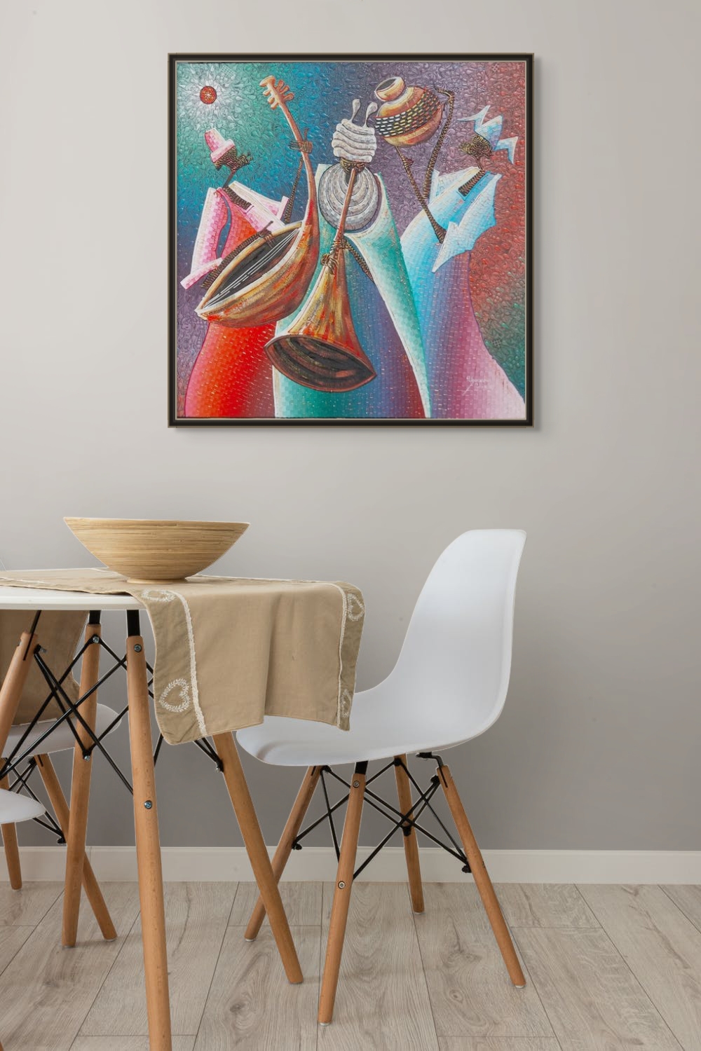 Les formes fluides et le fond texturé fusionnent le rythme et le mouvement, suggérant une harmonie au-delà de la diversité. Bien que différents dans leur expression et leurs traditions, les musiciens se tiennent côte à côte, créant une symphonie visuelle qui célèbre la riche mosaïque culturelle du Nigeria, où le son devient un langage unificateur entre les tribus.