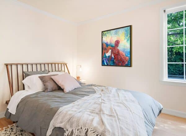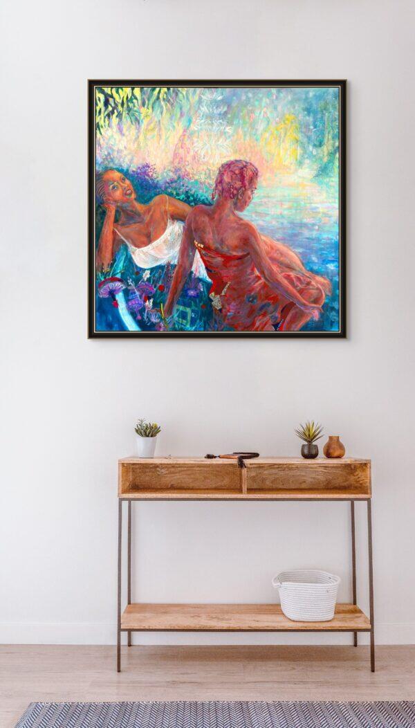 Cette peinture se situe entre le souvenir et le rêve, inspirée par des moments à la fois familiers et étrangers. Elle s'inspire de la chaleur étouffante et du calme des après-midis de mon enfance passés sur la pelouse de la maison familiale, du rythme des journées d'été sur l'île de Toronto et de l'énergie kaléidoscopique des nuits de la fête nationale du Canada.