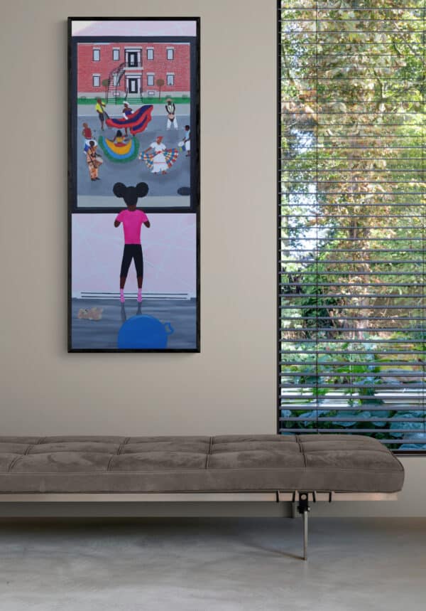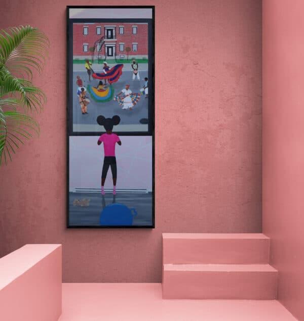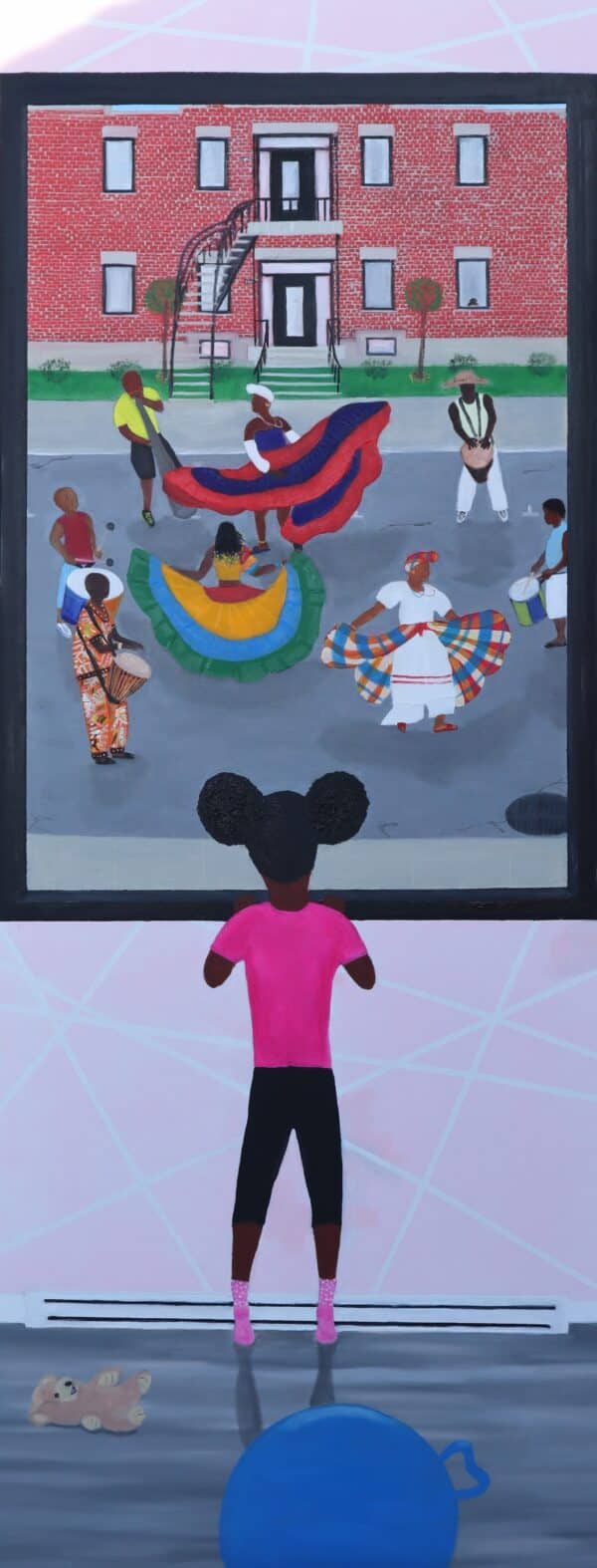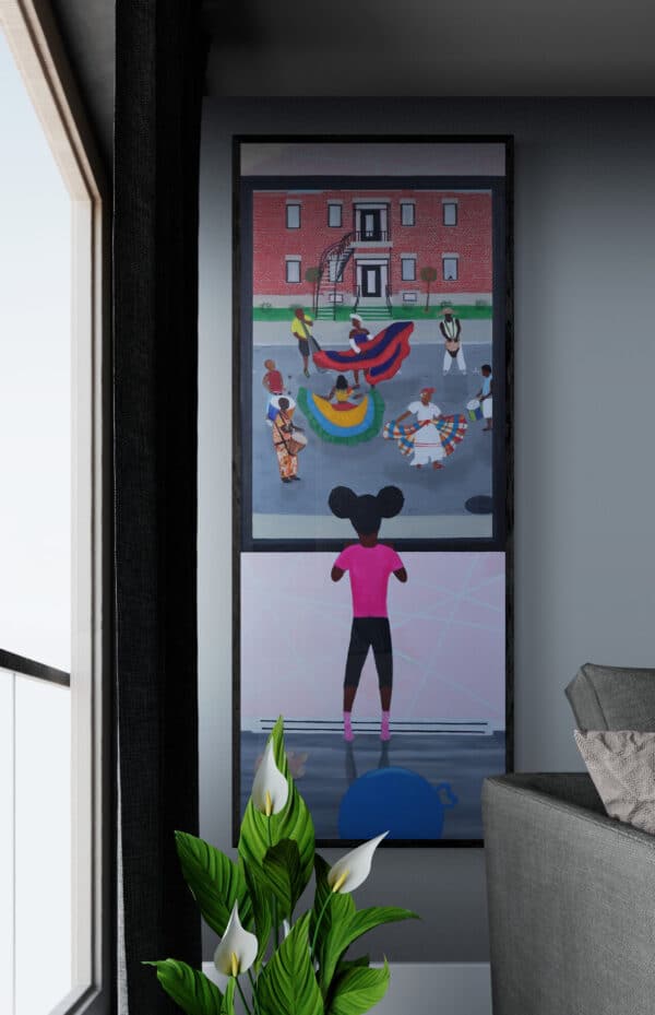 J’ai créé cette œuvre pour le Festival Afro Urbain (3e édition) qui célèbre l’art et la culture des afrodescendants à Montréal (Canada). Par cette œuvre, j’ai voulu illustrer l’influence culturelle et musicale des afrodescendants dans la ville de Montréal. Cette influence se ressent particulièrement lors de festivals estivaux populaires tels que Nuits d’Afrique, Haïti en Folie et Carifiesta, qui mêlent musique, parade et danse dans un ensemble de couleurs flamboyantes.