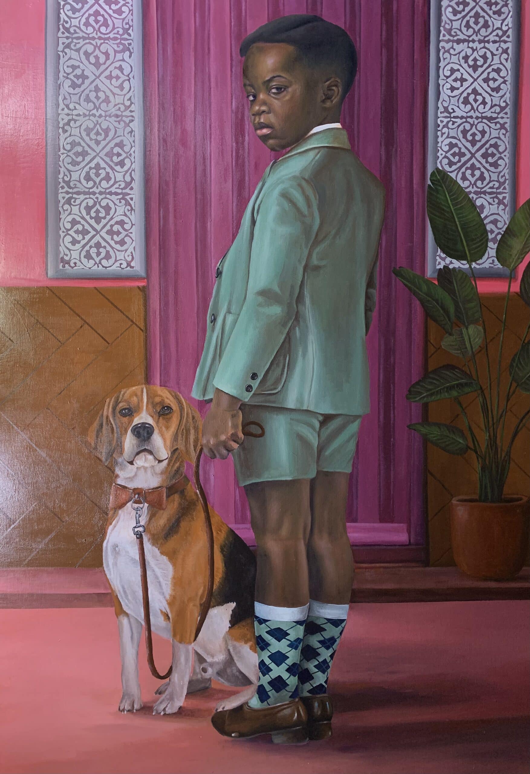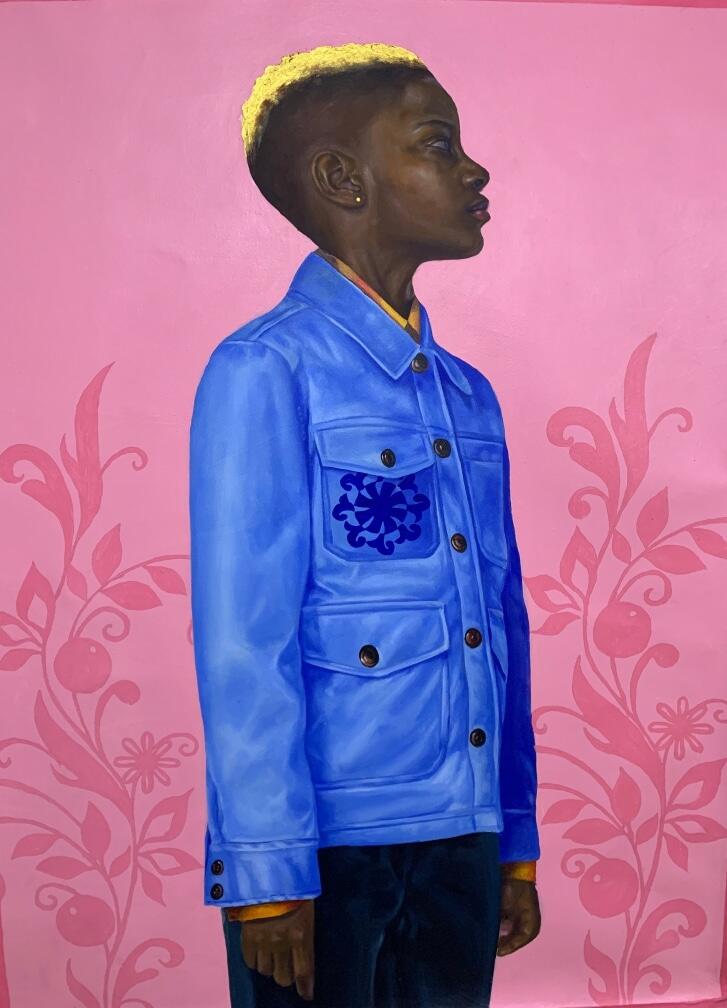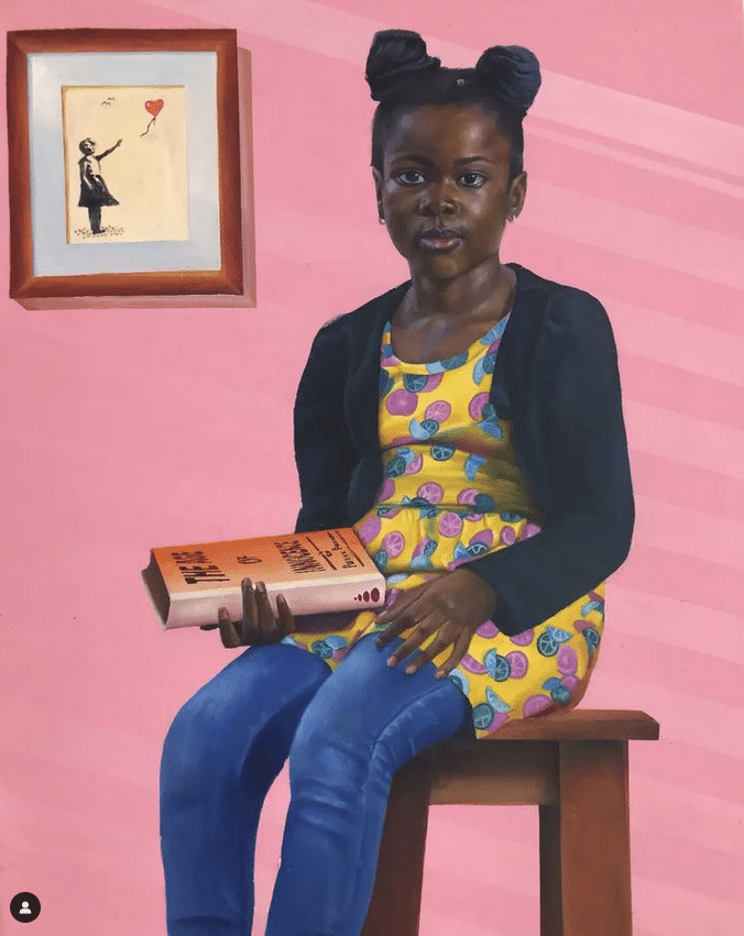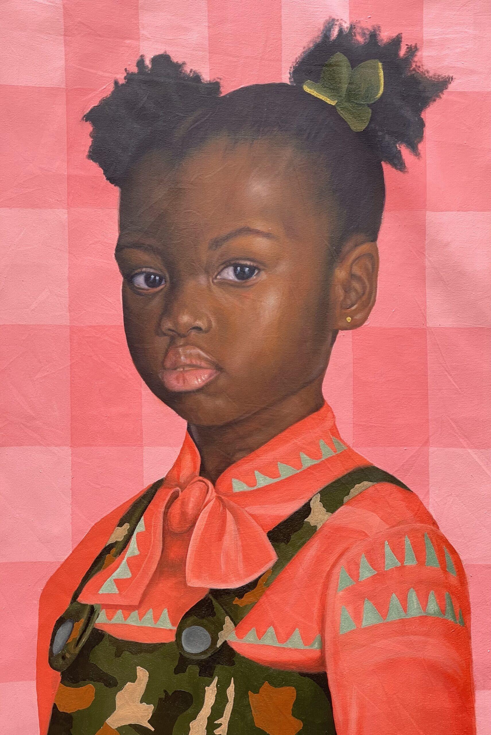 Afeez’s creative world centers on childhood—not in a sentimental or romanticized way, but as a profound lens through which to view society. “Children are not passive subjects,” he told me, “but carriers of strength, vulnerability, and unspoken wisdom.” In his paintings, children often appear alone, suspended in bold, patterned spaces that evoke both quietude and narrative tension. These geometric and symbolic backgrounds draw inspiration from traditional African textiles and artists like Gustav Klimt, yet are reimagined to tell stories grounded in the present.