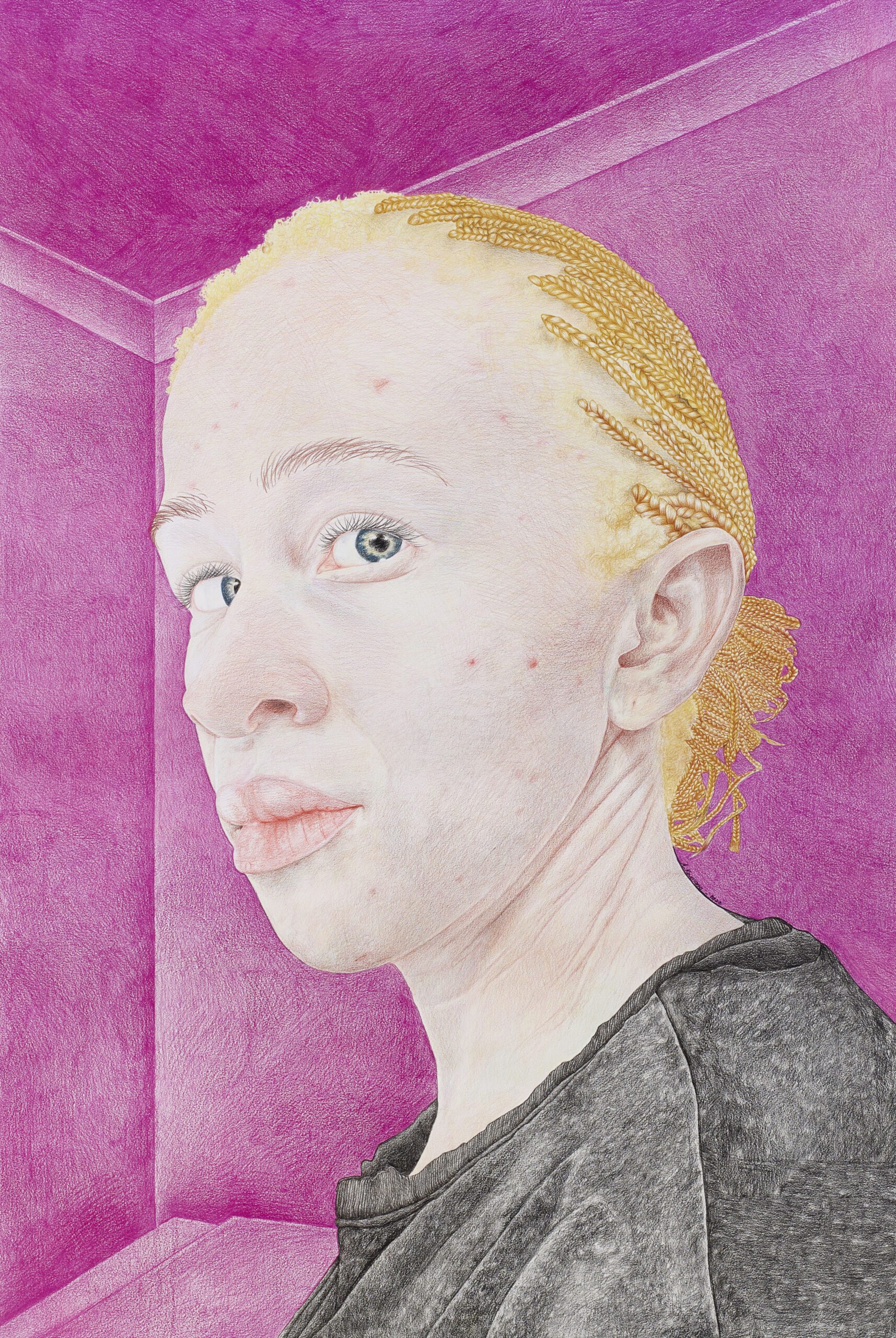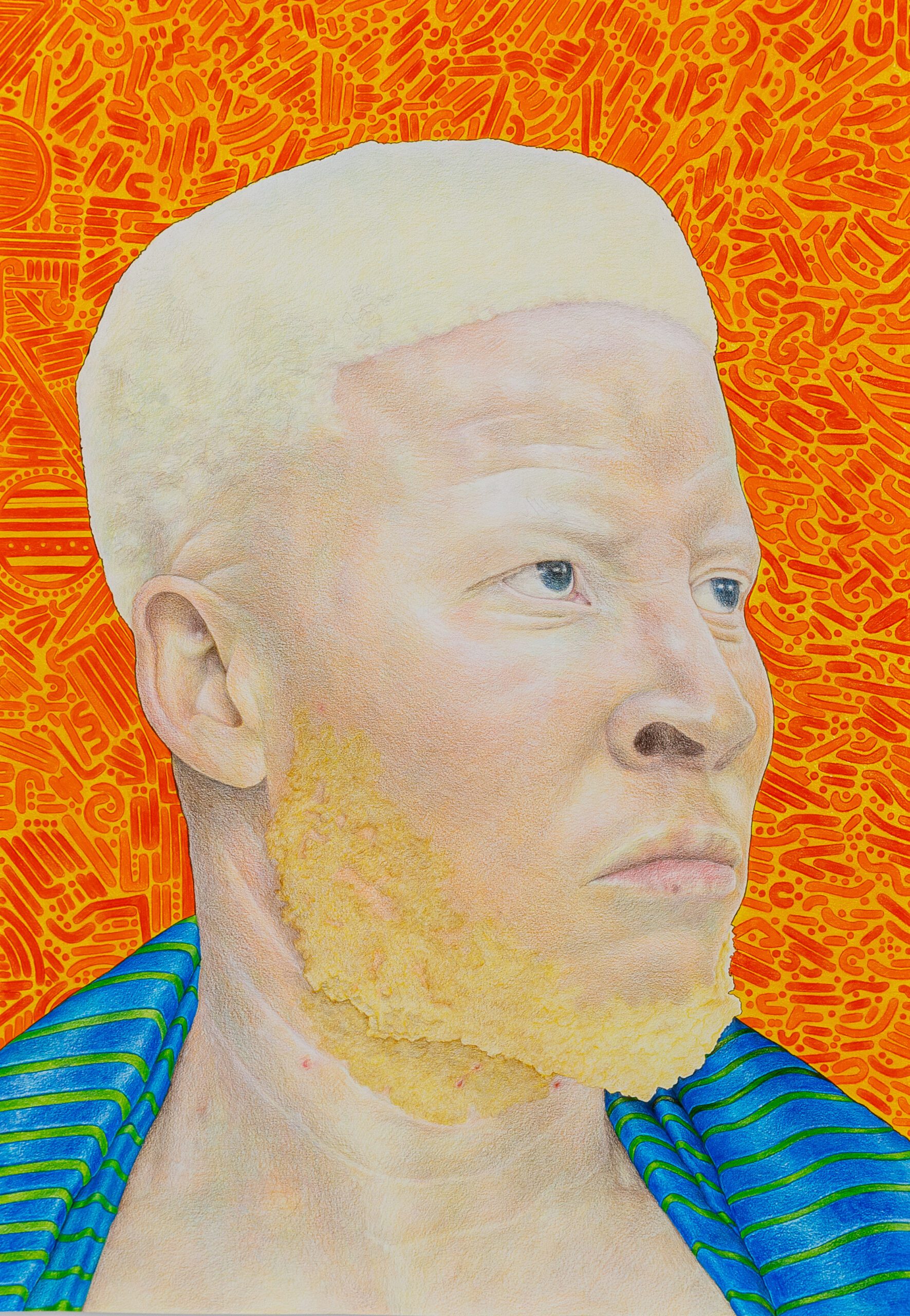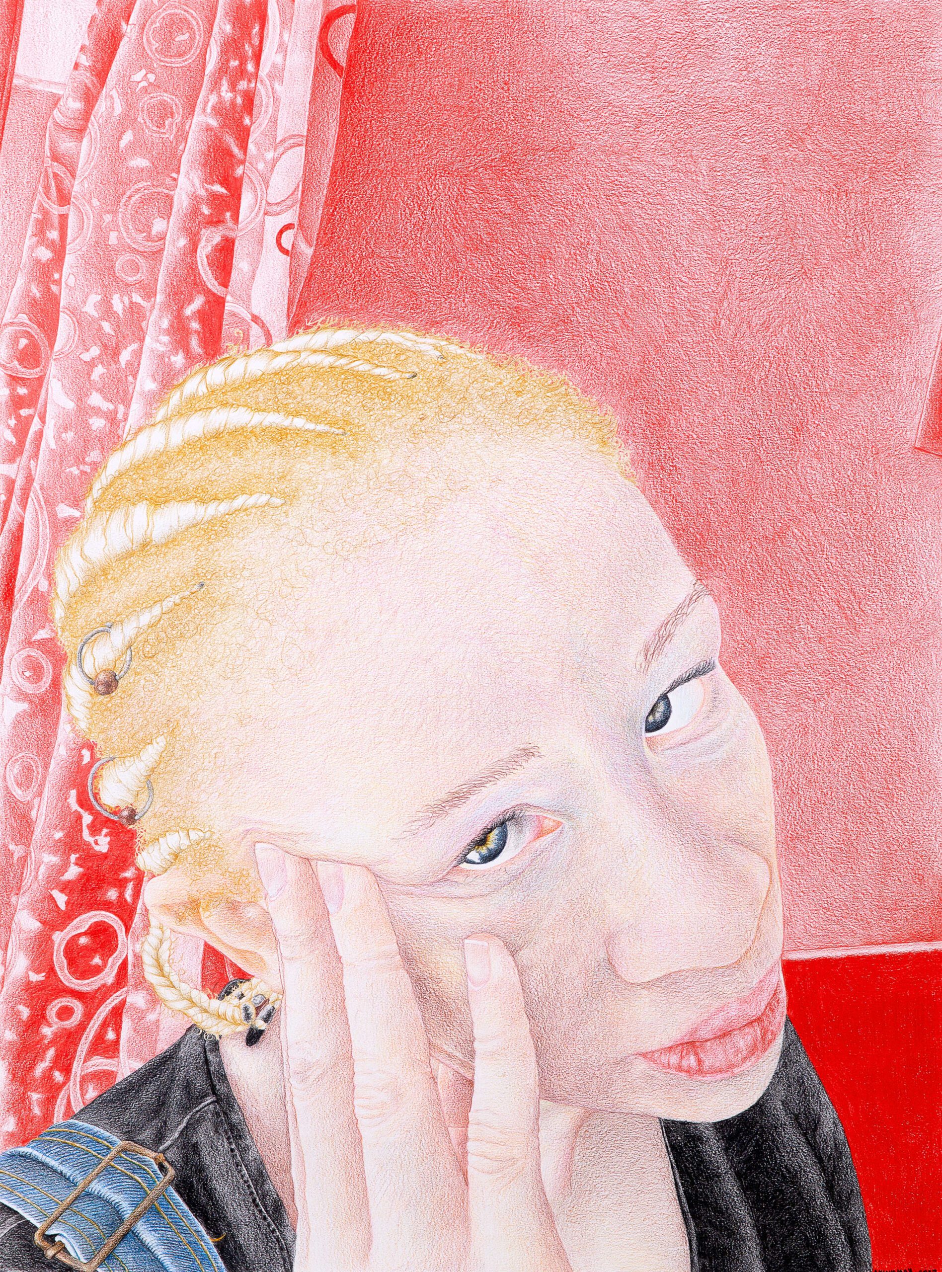 As a person with albinism, Athenkosi’s art is both personal and political. Her work examines how people with albinism are seen — and too often unseen — within Black South African communities. Through her practice, she explores the layers of prejudice, gender-based perception, and cultural stigma that have long shaped these representations. She seeks not only to document this reality but to transform it, reimagining the image of albinism in African contemporary art and beyond.