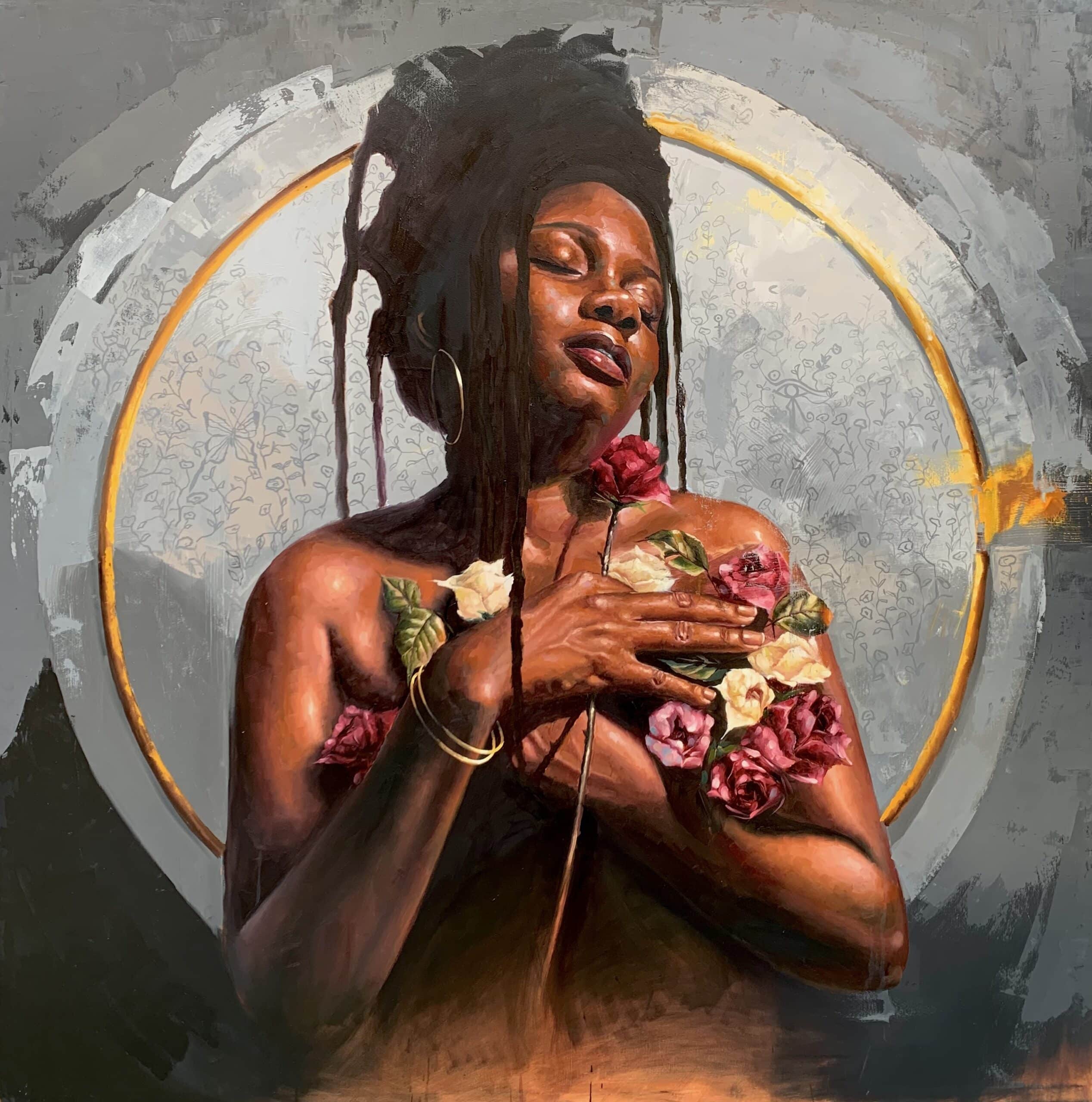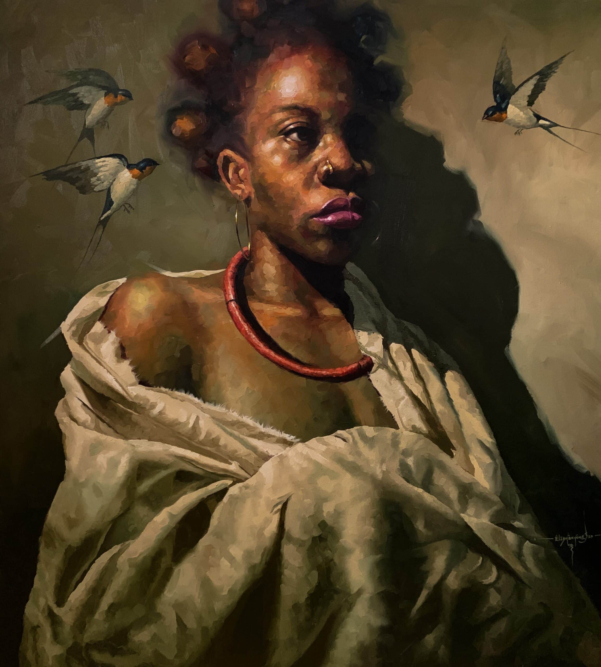 A graduate of Fine and Industrial Arts from the University of Uyo, Elisha’s style matured through mentorship and experimentation—drawing from Akan David’s symbolic Surrealism, Pan-African themes, and time spent at the Universal Studios of Art in Lagos. Today, his work is a bold synthesis of realism, impressionism, and surrealism—anchored in both ancestral heritage and universal inquiry.