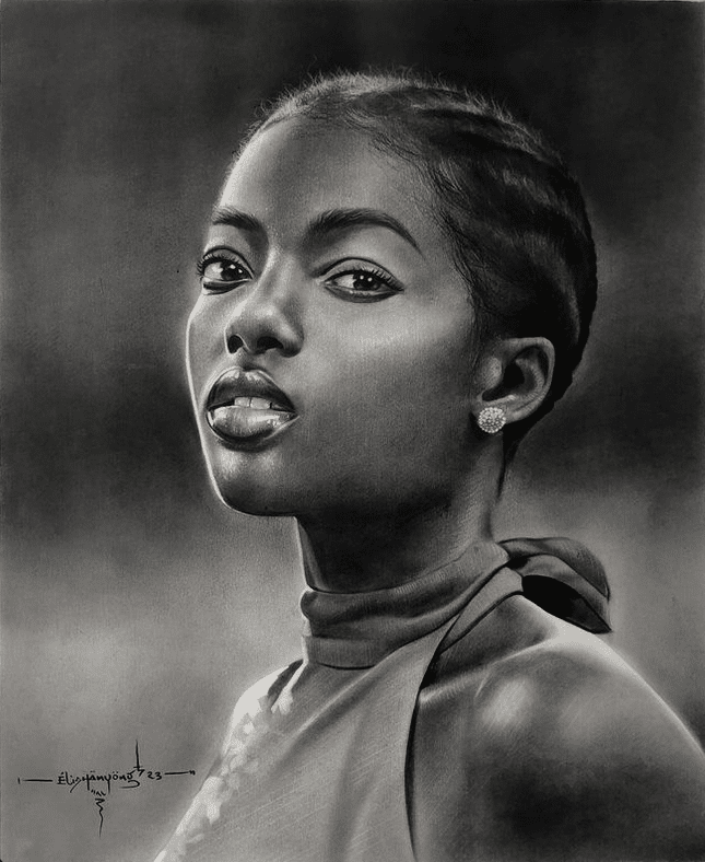 Born in the late ’90s in Lagos and raised in Akwa Ibom, Elisha’s artistic journey began with childhood sketches inspired by his mother’s biology books and evolved through portraiture and local art competitions. At just 14, he won the jury prize in the international “Art for Guns” competition, affirming his path in art.