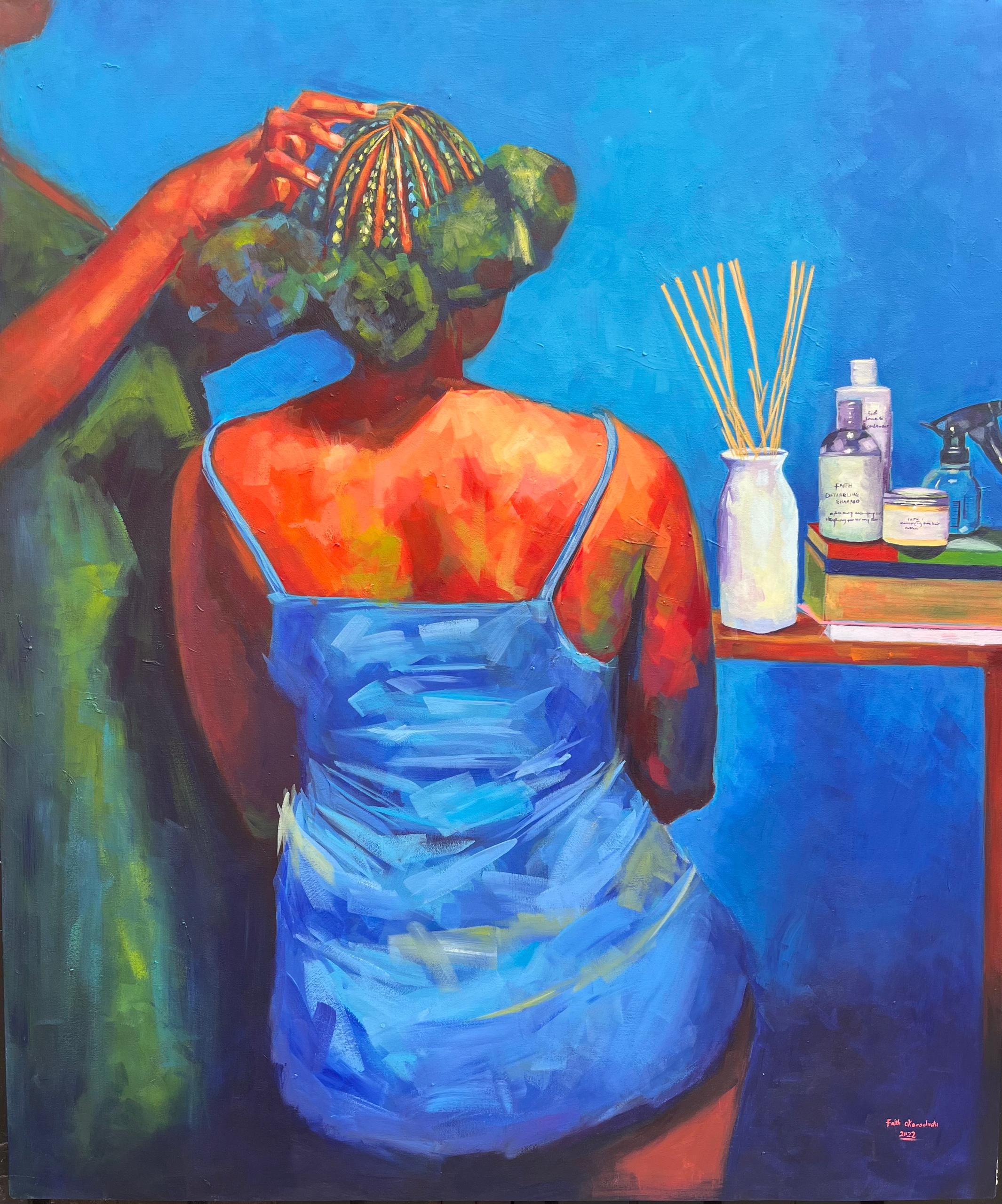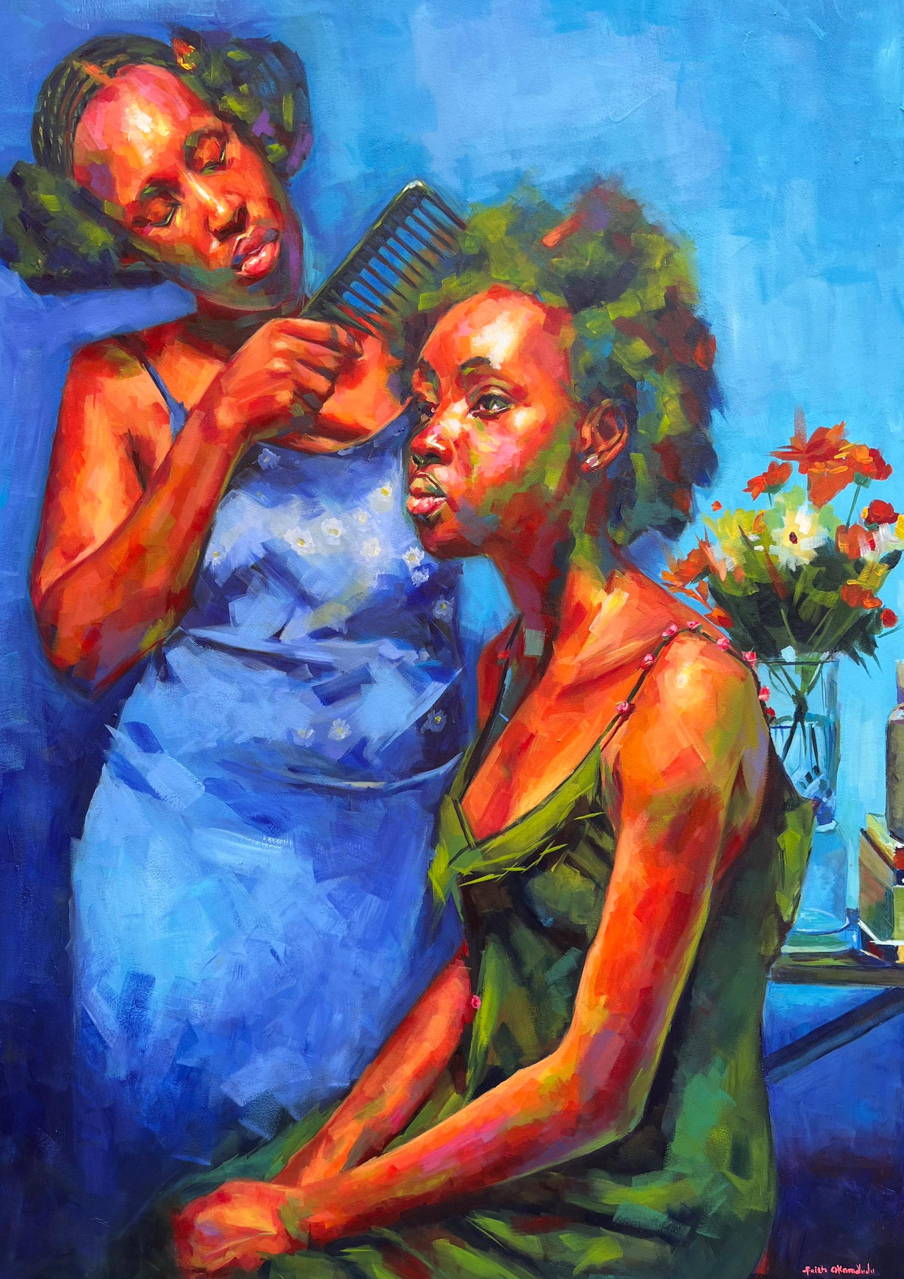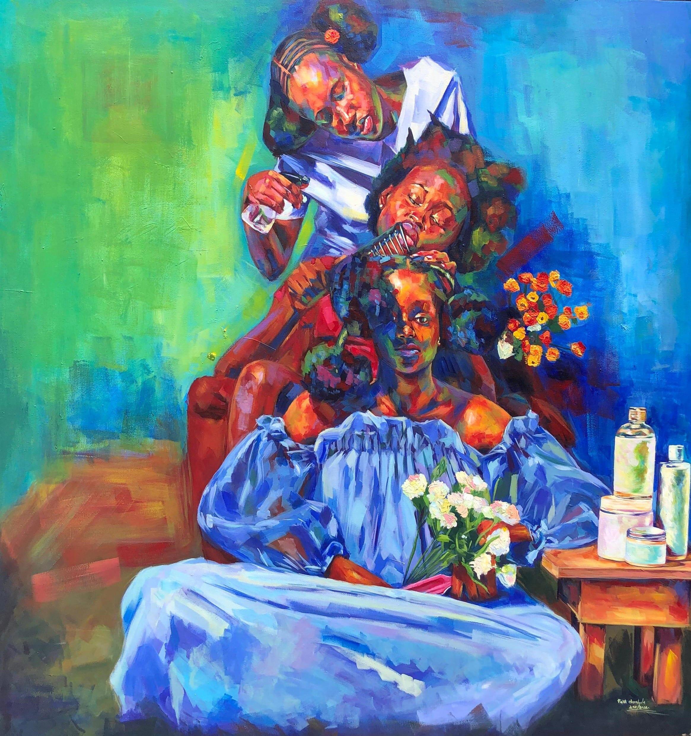 A turning point came during an interview at Nigeria’s renowned Rele Gallery, when Faith was asked: “What do you want to say through your art?” That question became her compass. Through deep introspection and relentless practice, she refined her artistic voice — one grounded in truth, emotion, and pride in her African heritage. Her art now celebrates the complexity of African life: its traditions, aesthetics, contradictions, and beauty. She paints both the tender and the grotesque, weaving together themes of culture, family, and self-awareness with extraordinary authenticity.