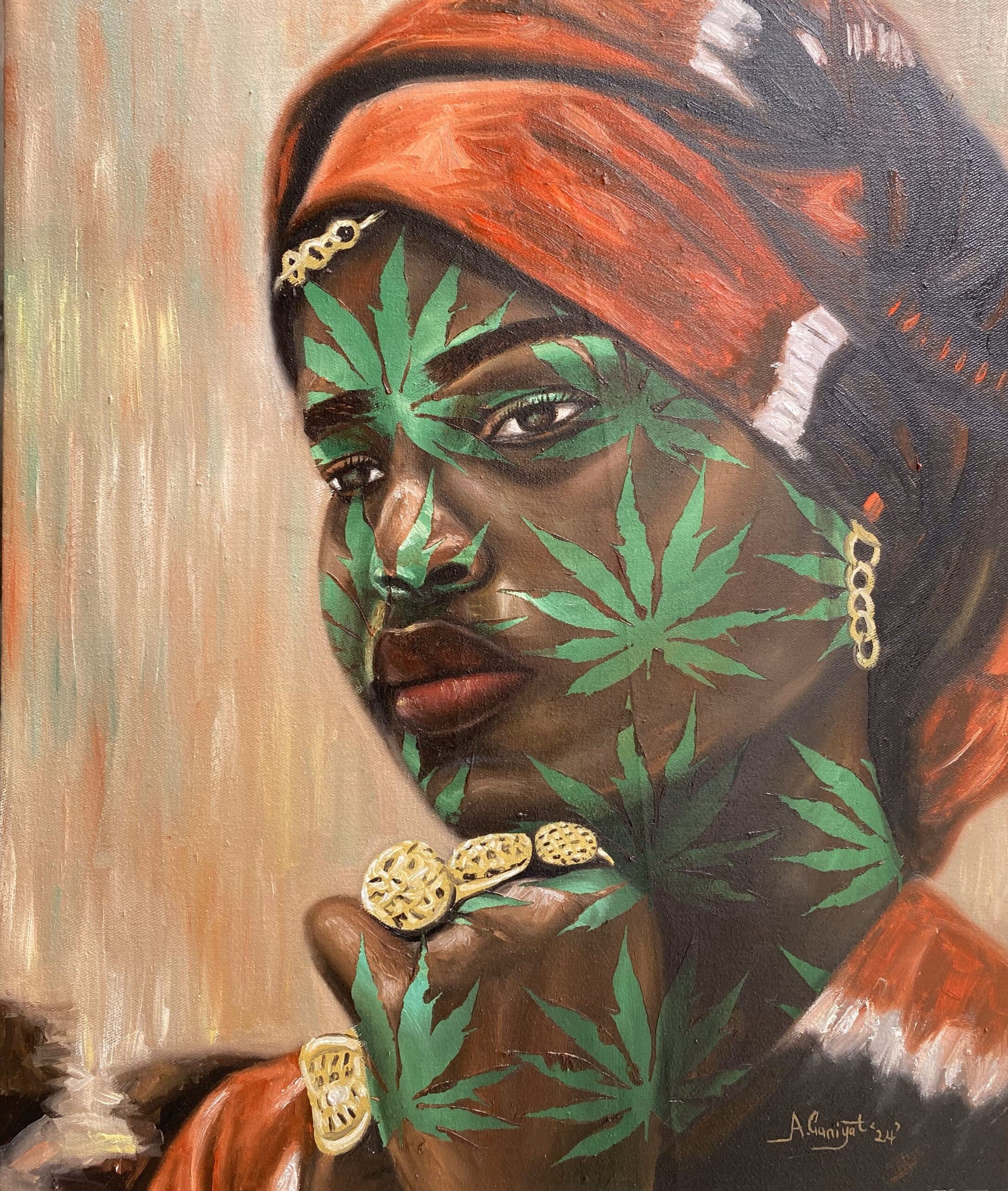 Ganiyat draws inspiration from her own experiences and from the lives of those around her. Her art is a tribute to the restorative power of nature, especially the vitality found in plants and herbs. Her breathtaking figures are often adorned with floral motifs such as the coral plant (Jatropha multifida) and the clover leaf, symbols of the deep connection between beauty and healing.