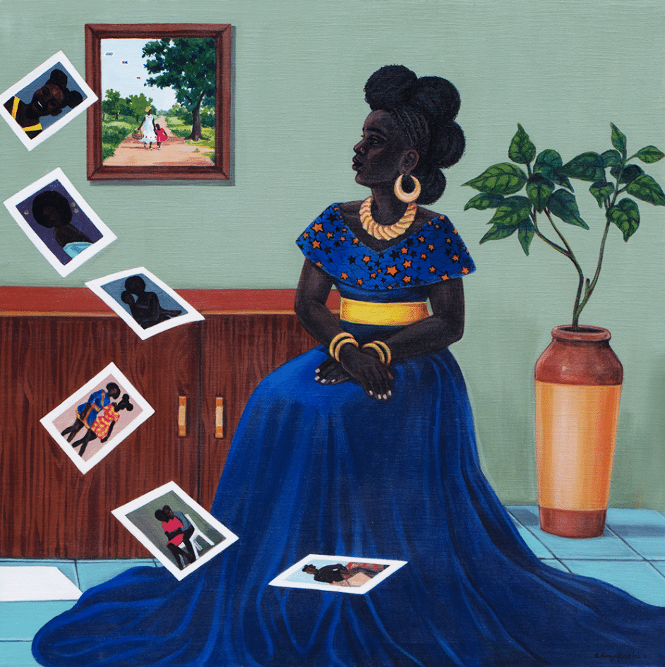 Courage’s work is a vivid blend of imagination and realism, often infused with surreal elements that evoke emotional depth. He draws from his environment and society, capturing inner moments that often escape the lens of a camera. His current medium of choice is acrylic, which he uses to create layered scenes of introspection and vulnerability. His art centers on the quiet, often unseen experiences of individual reflection—the solitary spaces where people confront their memories, struggles, and truths.