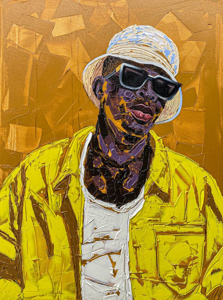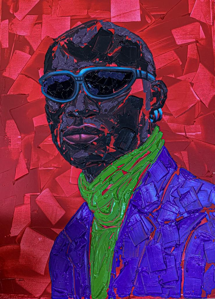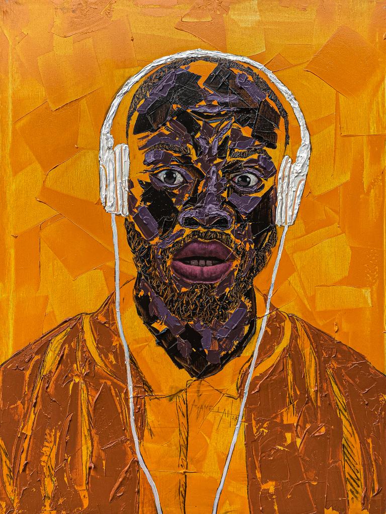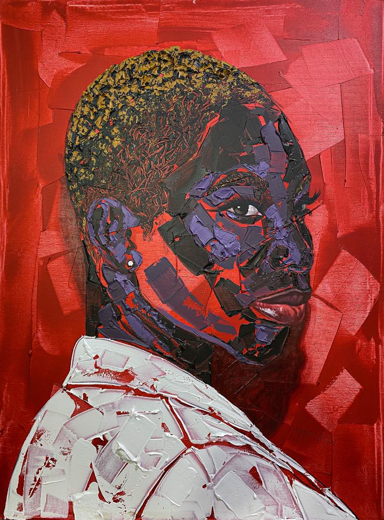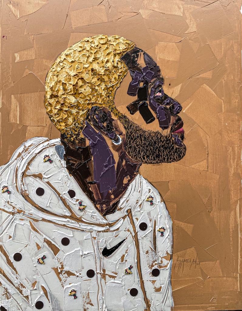 Our meeting via video call got off to a flying start. First, Selorm gave me a tour of his magnificent studio, where I could contemplate both finished pieces and others in the process of being created. I was spellbound as he explained his creative process, from recruiting models from everyday life, photographing them in his studio, creating the piece based on the photo, and finally paying the model a portion of the profits from the sold artwork. Selorm also showed me the tools and types of products he uses to give his pieces different tones and levels of thickness.