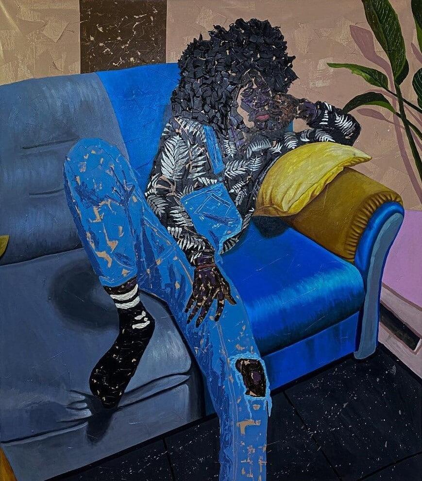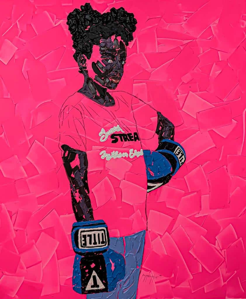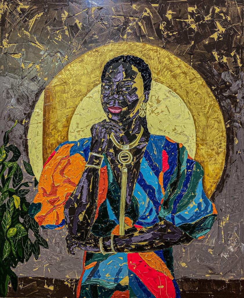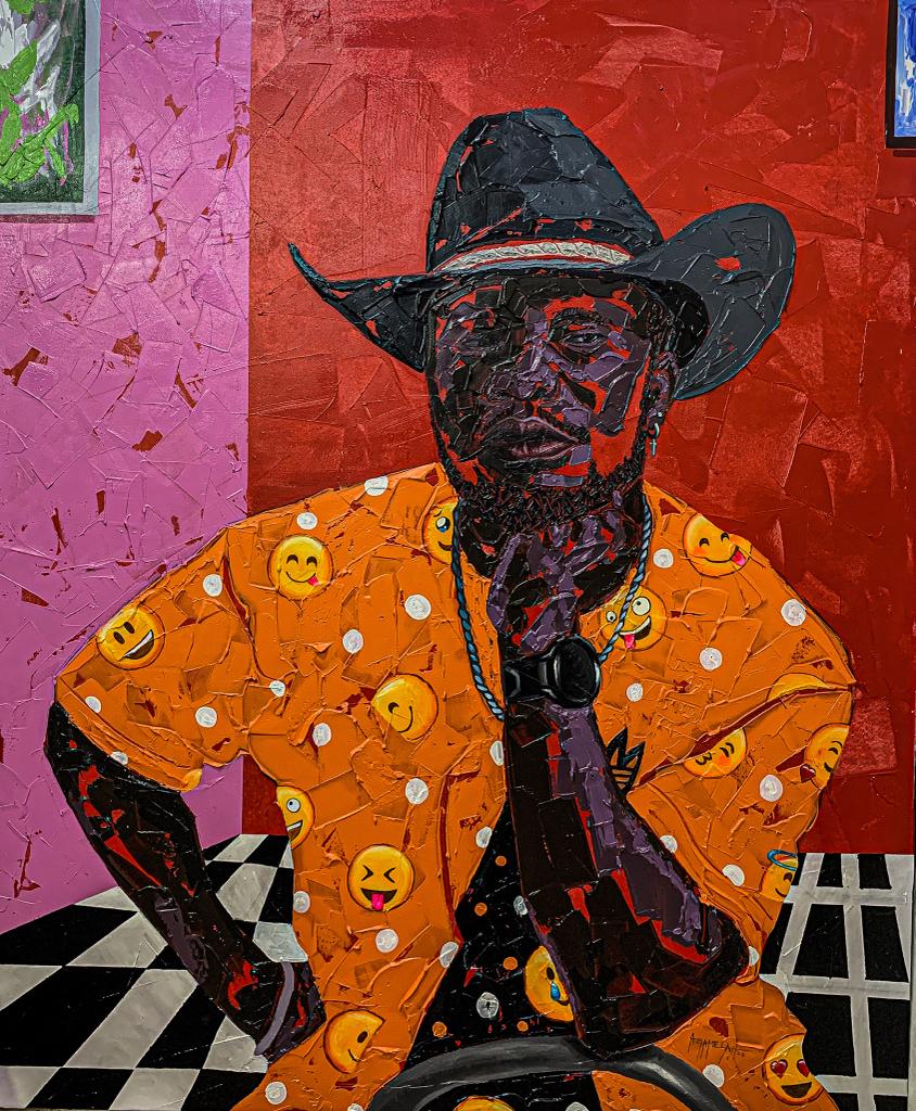 Our meeting via video call got off to a flying start. First, Selorm gave me a tour of his magnificent studio, where I could contemplate both finished pieces and others in the process of being created. I was spellbound as he explained his creative process, from recruiting models from everyday life, photographing them in his studio, creating the piece based on the photo, and finally paying the model a portion of the profits from the sold artwork. Selorm also showed me the tools and types of products he uses to give his pieces different tones and levels of thickness.