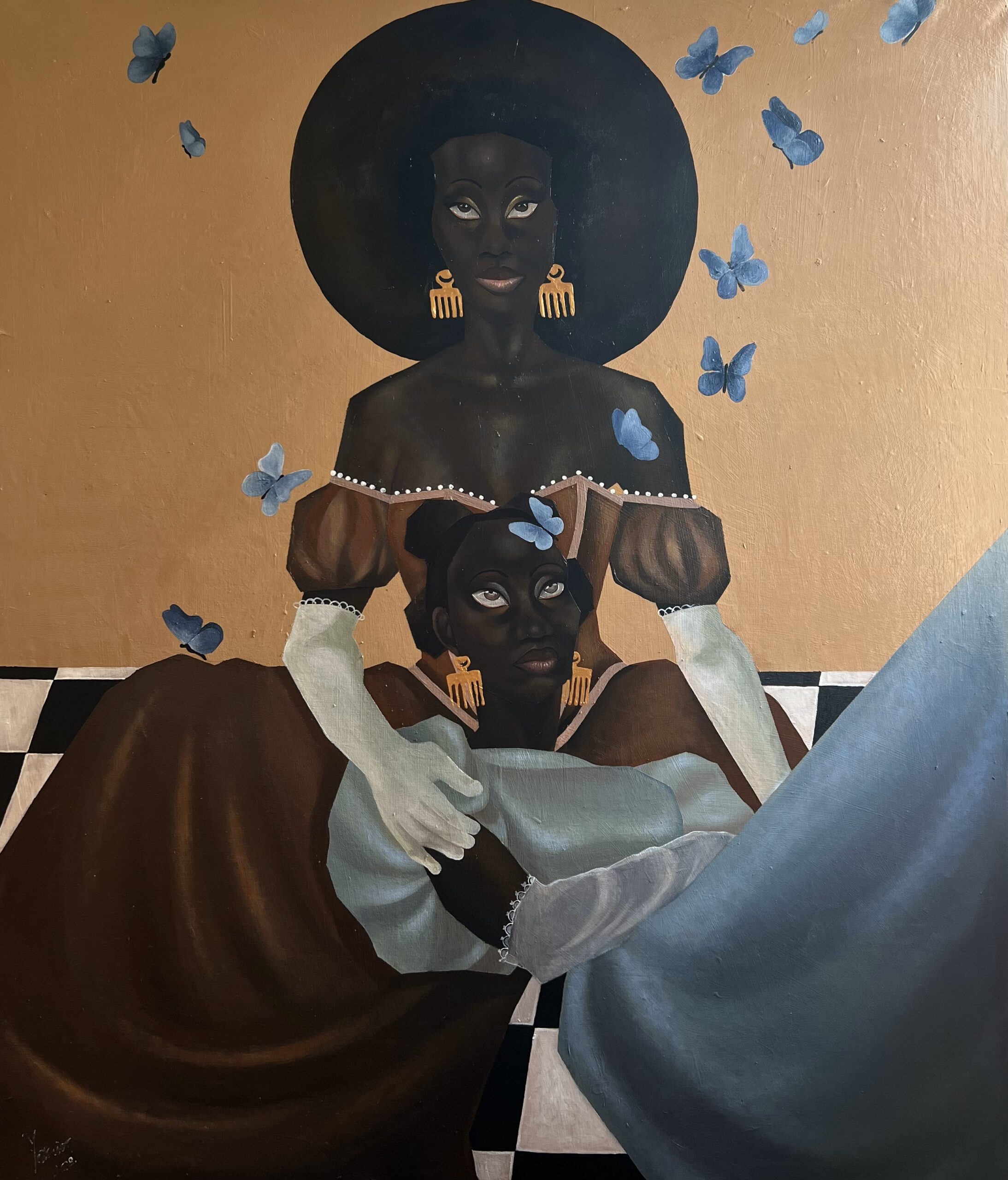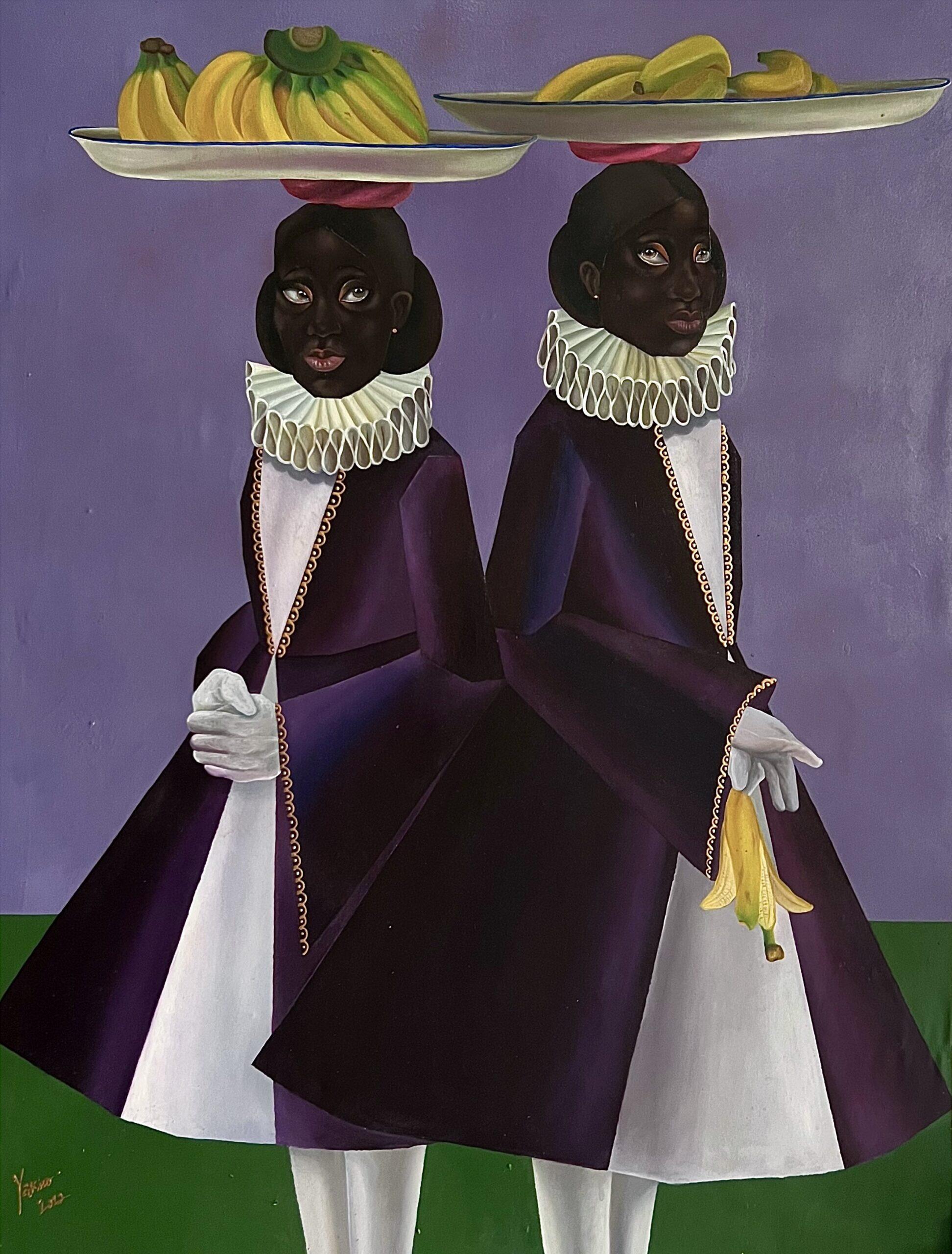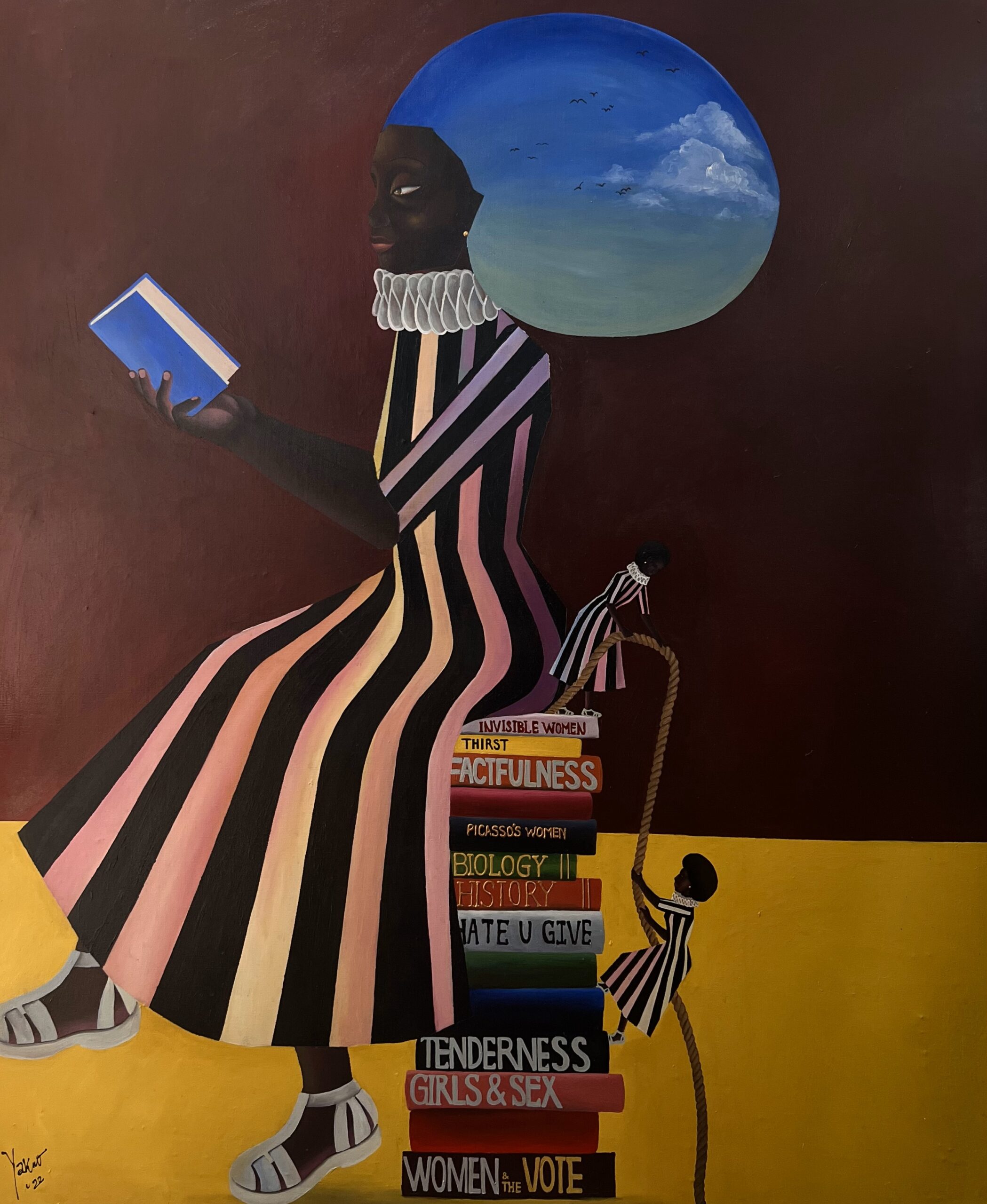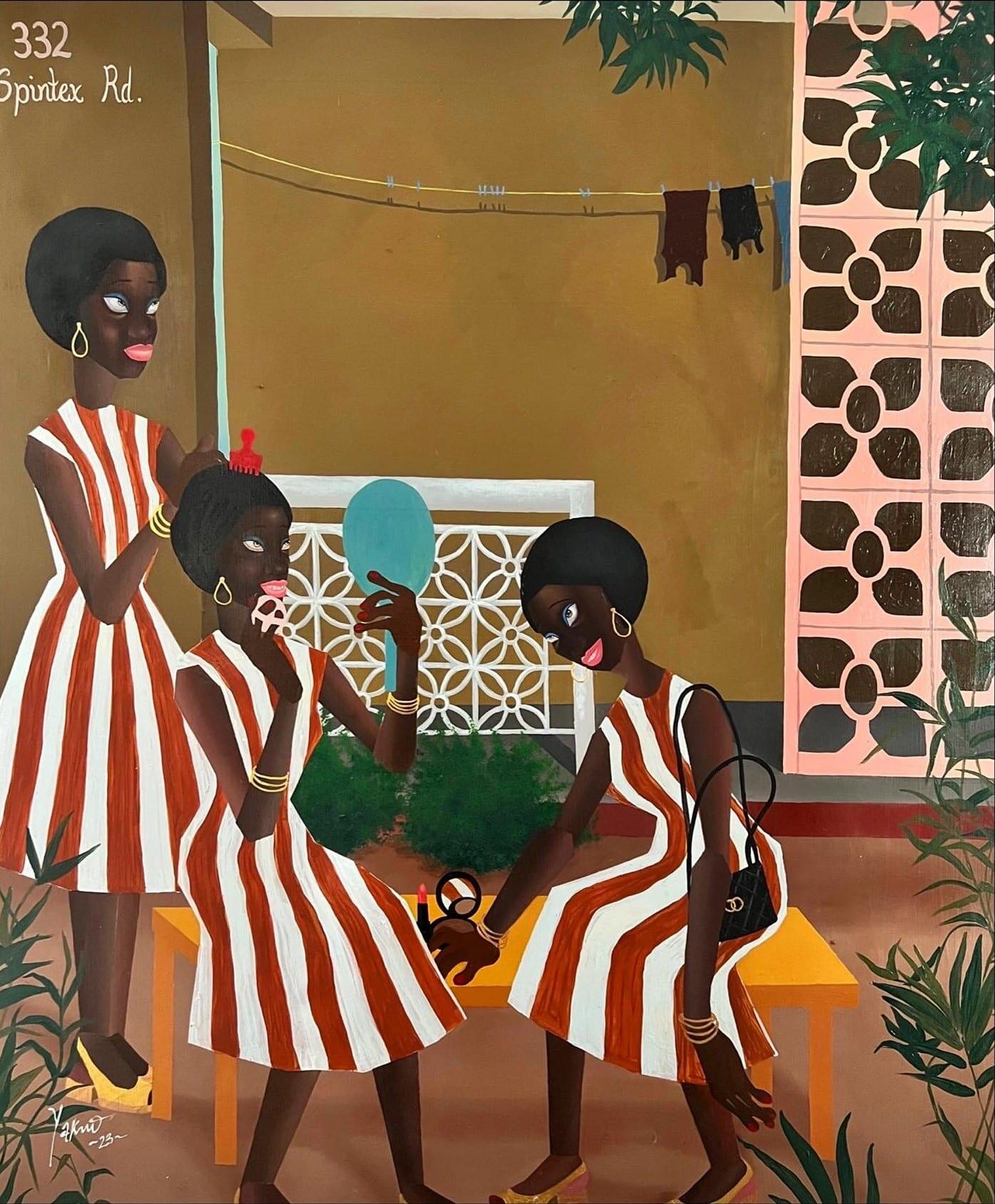 Yakno’s art reflects her exploration of sisterhood, female empowerment, and the divine feminine. Growing up in a family of women profoundly shaped her artistic vision. She draws inspiration from her environment, her lived experiences, and her imagination, seeking to convey memory and knowledge in an idealistic way. Her works spotlight the vital roles women play in society, the challenges they face, and the importance of self-development within the social framework.