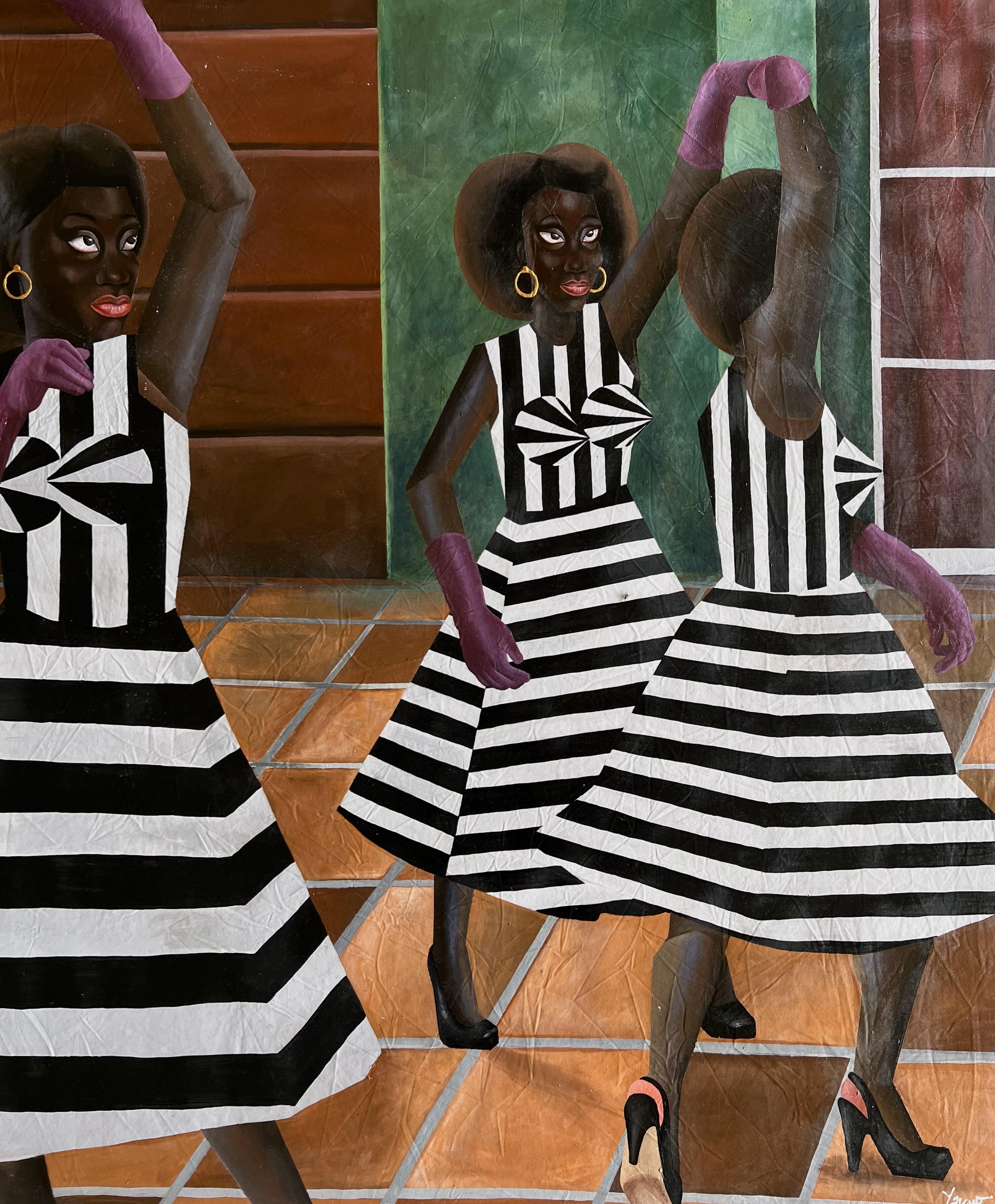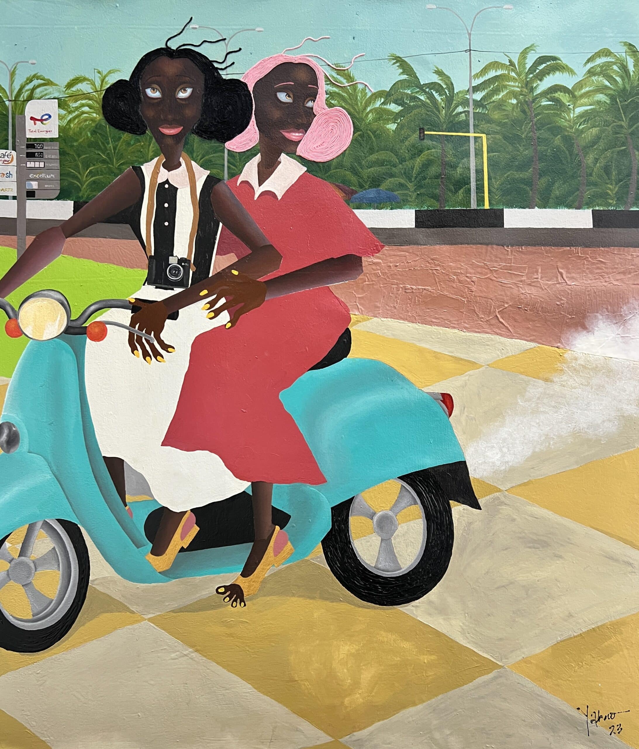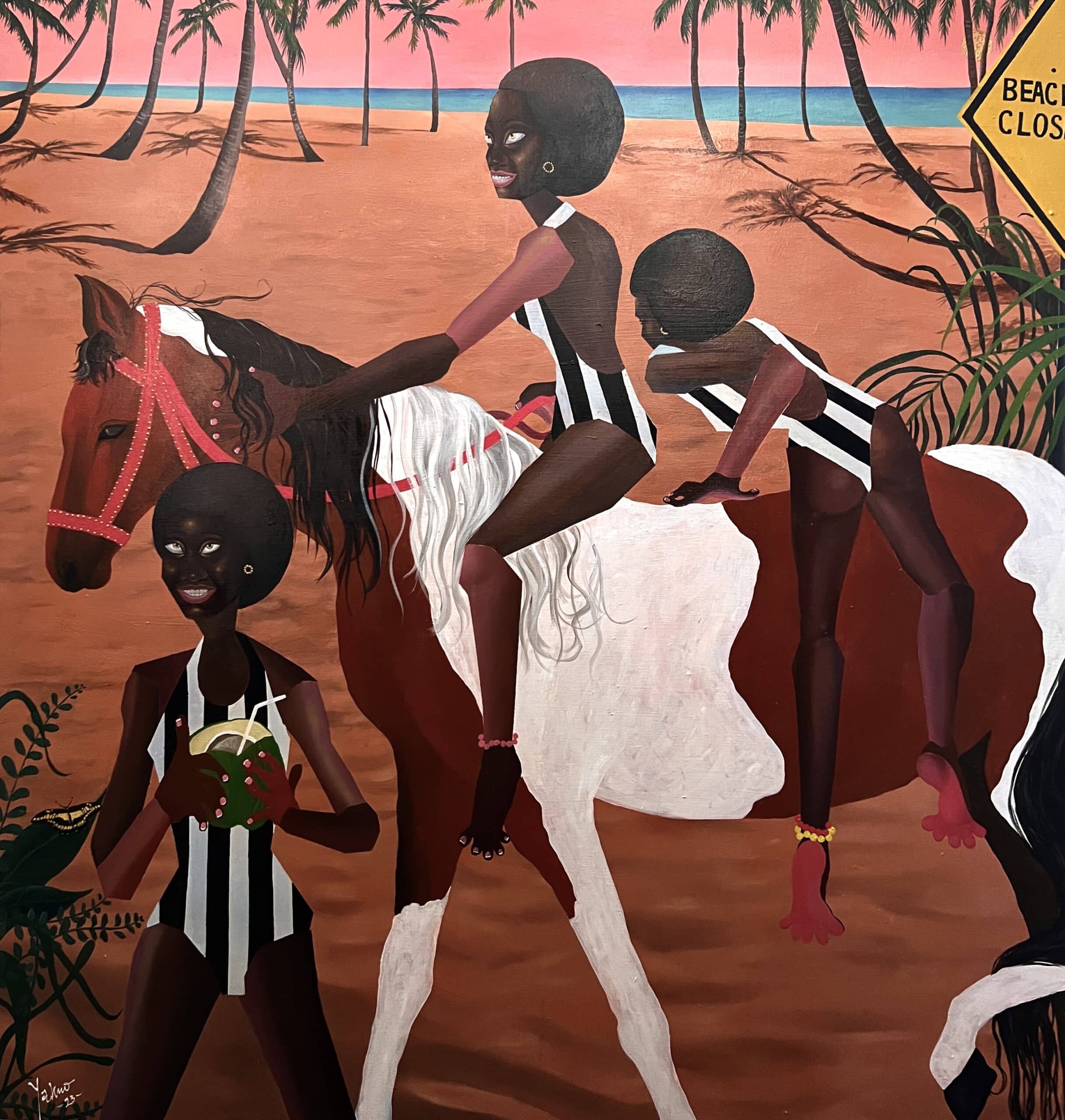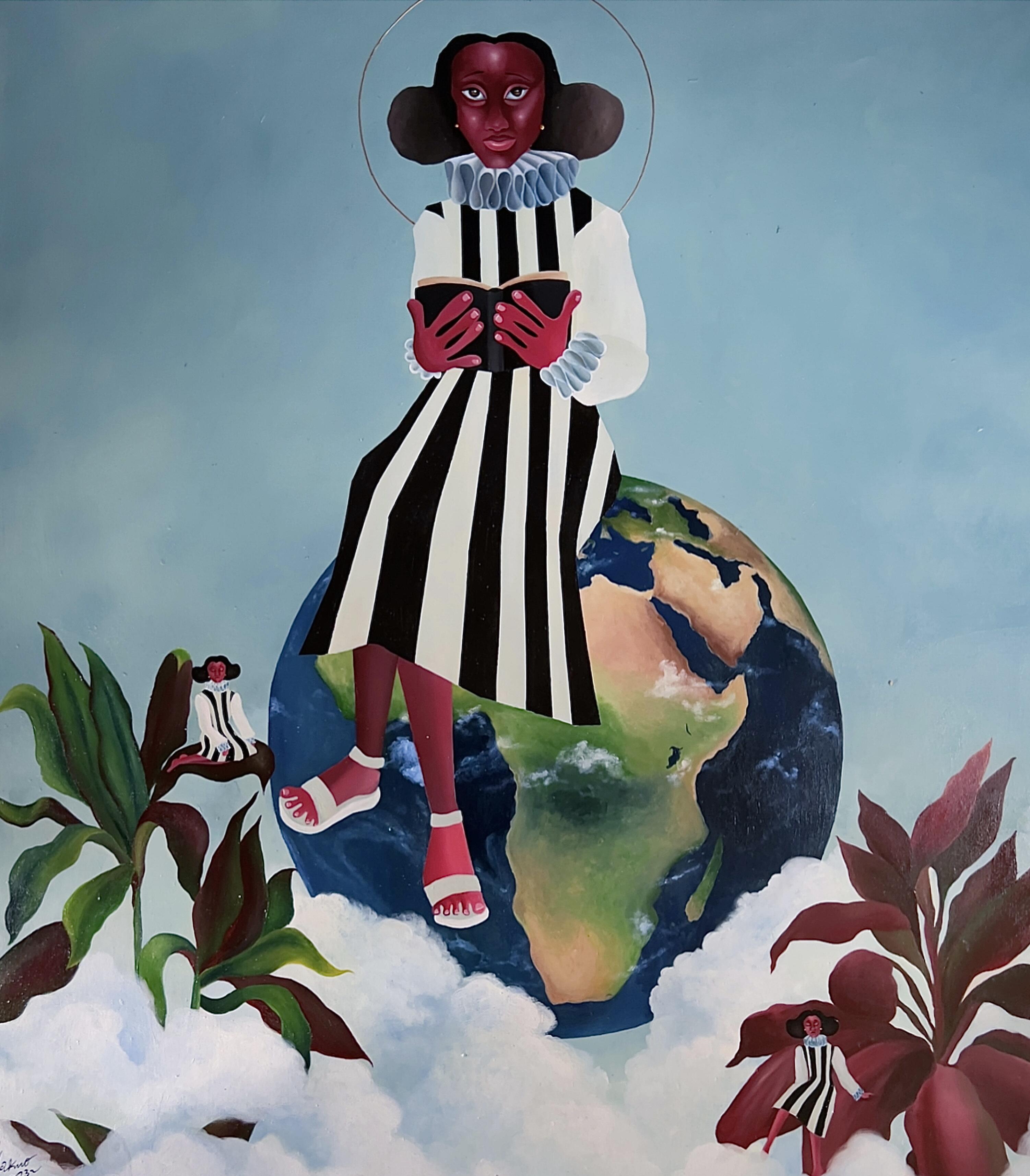 Yakno’s art reflects her exploration of sisterhood, female empowerment, and the divine feminine. Growing up in a family of women profoundly shaped her artistic vision. She draws inspiration from her environment, her lived experiences, and her imagination, seeking to convey memory and knowledge in an idealistic way. Her works spotlight the vital roles women play in society, the challenges they face, and the importance of self-development within the social framework.