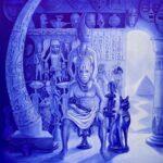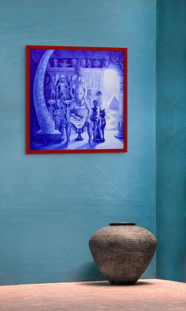 The stool on which the character in the middle sits is from Congo. The statue from Côte d’Ivoire is beside his right hand. The hieroglyphic inscriptions, cat statue, and pyramid are from Egypt on his left side. The man’s head is a mask from Nigeria/Benin. The head of a woman, “queen mother,” is also from Nigeria/Benin. The baby-like sculpture he holds is an “Akuaba doll” from Ghana Ashanti.