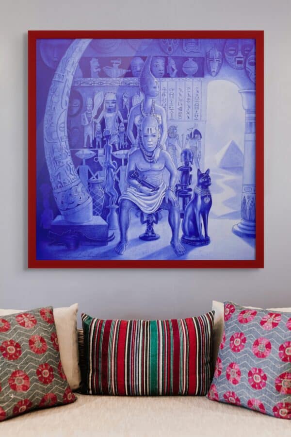 The piece is a tribute to celebrate our ancestors’ hard work and treasures. It is an inspirational guiding principle for our knowledge and wisdom, giving us the power to understand and invent our future. It is an imaginary composition that depicts the intriguing wonders and treasures of diverse African cultures, as seen in the drawing.