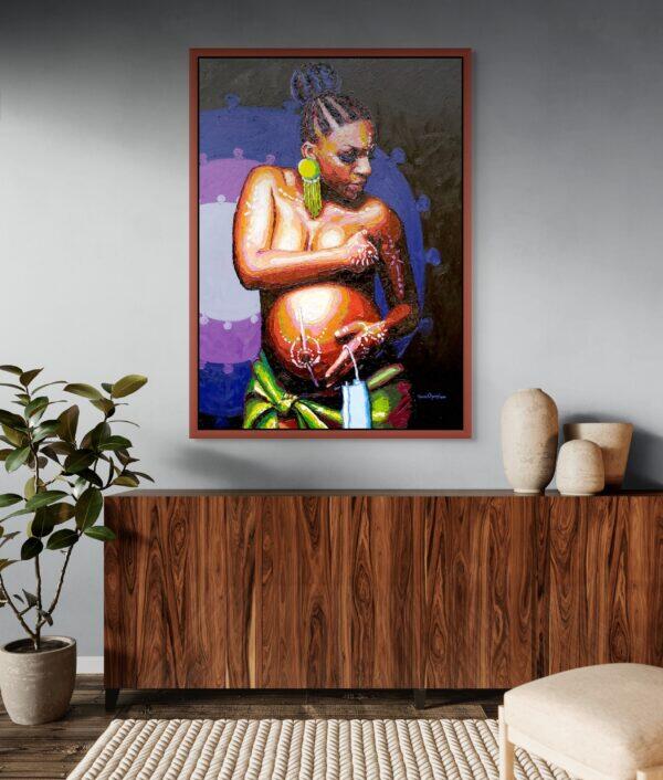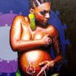 The woman represents the present, while the unborn child embodies the future. The future depends on the choices we make today—it is shaped by our actions, our resilience, and our care. The brown-skinned woman, with her intricately plaited African hairstyle and green flowing earring, highlights the beauty and richness of African culture.
