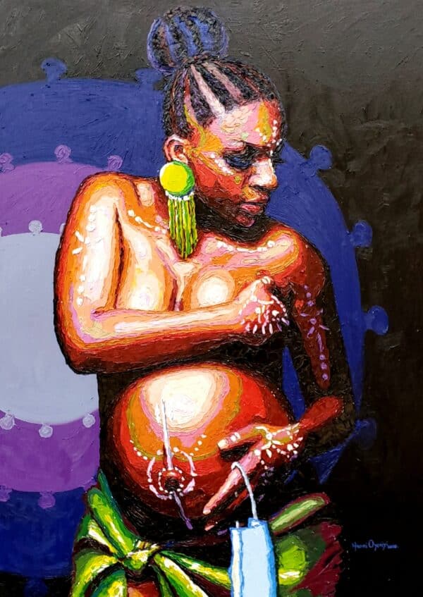 This painting portrays an expectant mother holding a face mask—an emblem of protection. The mask, covering the nostrils that bring breath to the soul and the mouth that nourishes the body, symbolizes the fragile balance between life and survival. The woman shields one of her breasts with her hand, emphasizing the importance of nurturing and sustaining her unborn child, while her other hand gently rests over her stomach, sending a silent, heartfelt message to her baby: Don’t worry, there is hope.