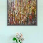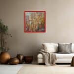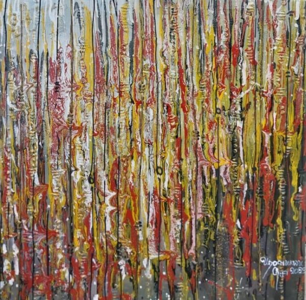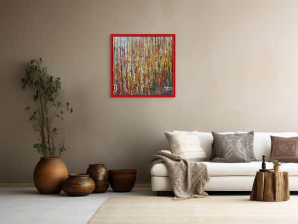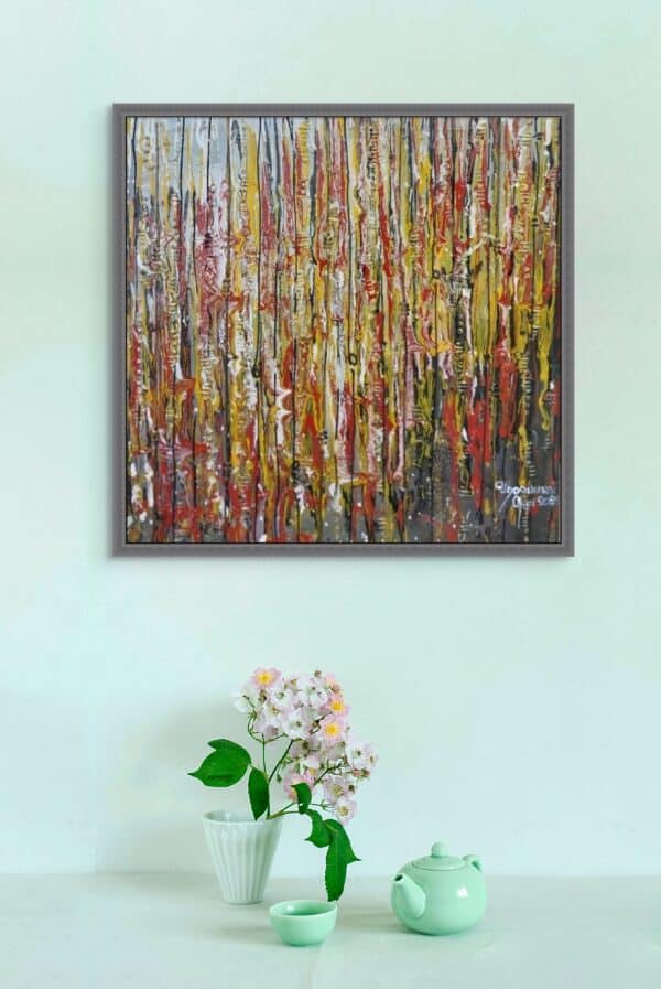 This vibrant abstract painting is infused with a warm palette of yellow, red, and brown. Bold strokes of fiery red intertwine with golden yellow, radiating energy and warmth, while earthy brown tones ground the composition with depth and balance. The dynamic interplay of colors creates a sense of movement, evoking the essence of autumn, fire, or the rich textures of nature. The piece exudes passion, vitality, and a deep connection to the natural world.