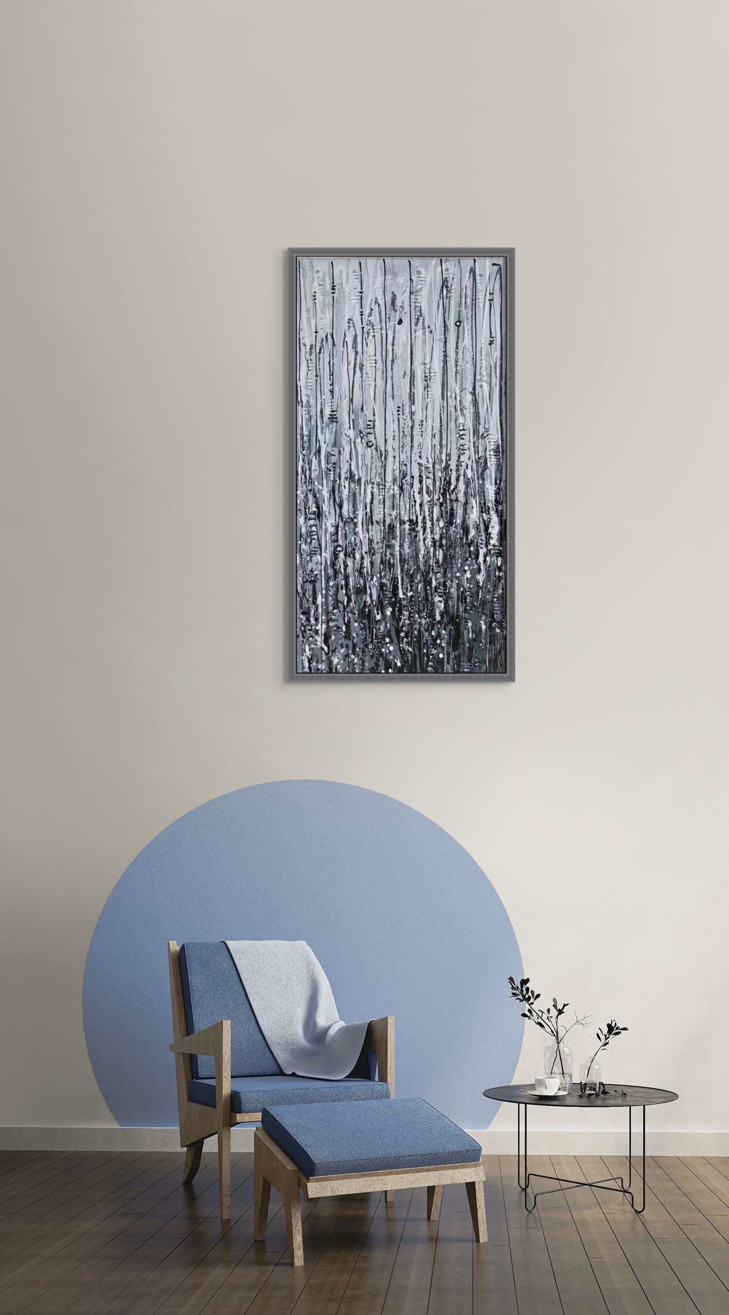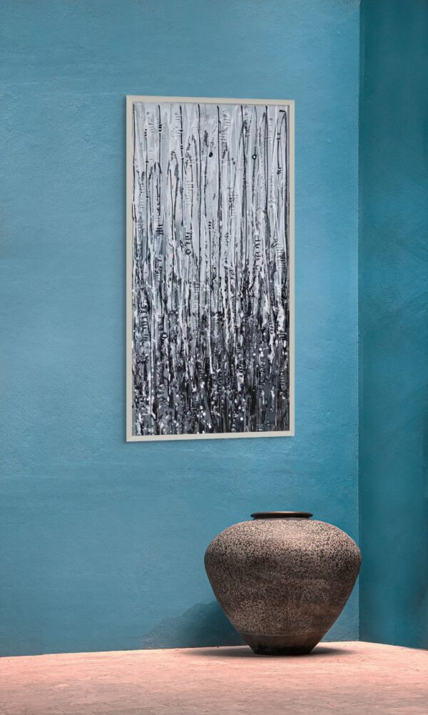 This striking abstract painting features a rich grey palette, blending deep charcoal, soft silver, and muted ash tones. Layers of texture and fluid brushstrokes create depth and movement, evoking a sense of mystery and contemplation. Subtle contrasts of light and shadow add dimension, drawing the viewer into a space that feels both serene and enigmatic. The monochromatic harmony exudes sophistication and introspection.