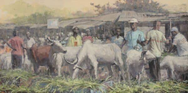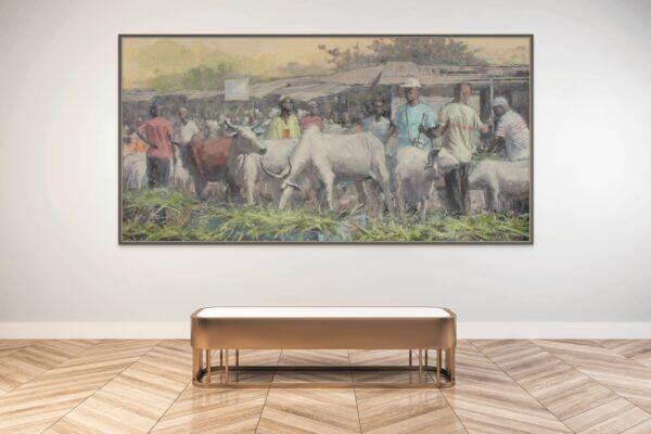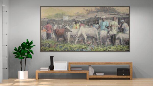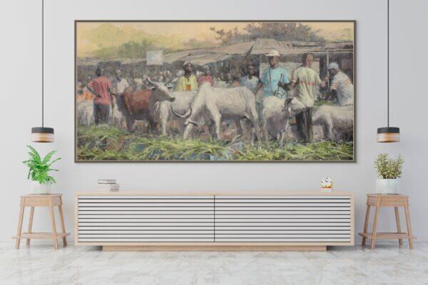 This vibrant painting brings to life the bustling energy of the traditional cattle market in Ivory Coast, where farmers carefully tend to their cattle, preparing them for sale. The scene captures the deep connection between the farmers and their animals, each movement filled with purpose and pride.
