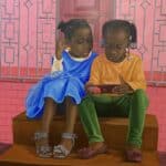 With bright, curious eyes and gentle smiles, the children seem completely absorbed in their own quiet adventure. Though they sit together, each appears to be lost in thought, as if discovering hidden treasures within themselves. The soft, golden light that surrounds them adds a sense of calm and peace to the scene.