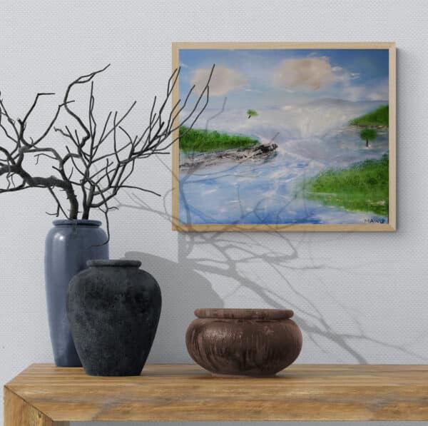 This is the first piece of my new series entitled ESCAPE (which I’m launching along with the KONECTIONS series). This series stems from my deep need for adventure and freedom, and my insatiable desire to discover nature in all its beauty and peacefulness. It was inspired by my recent vacation in the wilderness of Quebec’s National Capital Region, where I felt detached from city life and completely in tune with the artist in me.