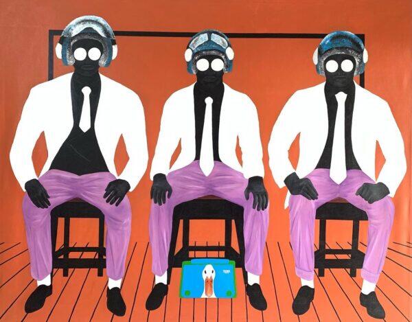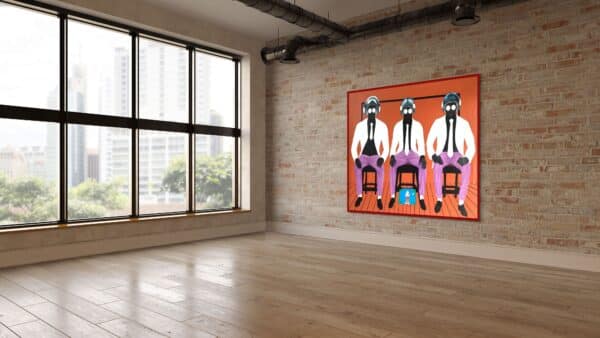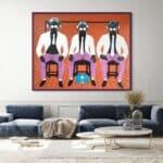 Heirs of Memory is a powerful portrait that captures a moment of quiet resilience. Three figures sit side by side, their postures commanding yet unassuming, as they gaze directly at the observer.