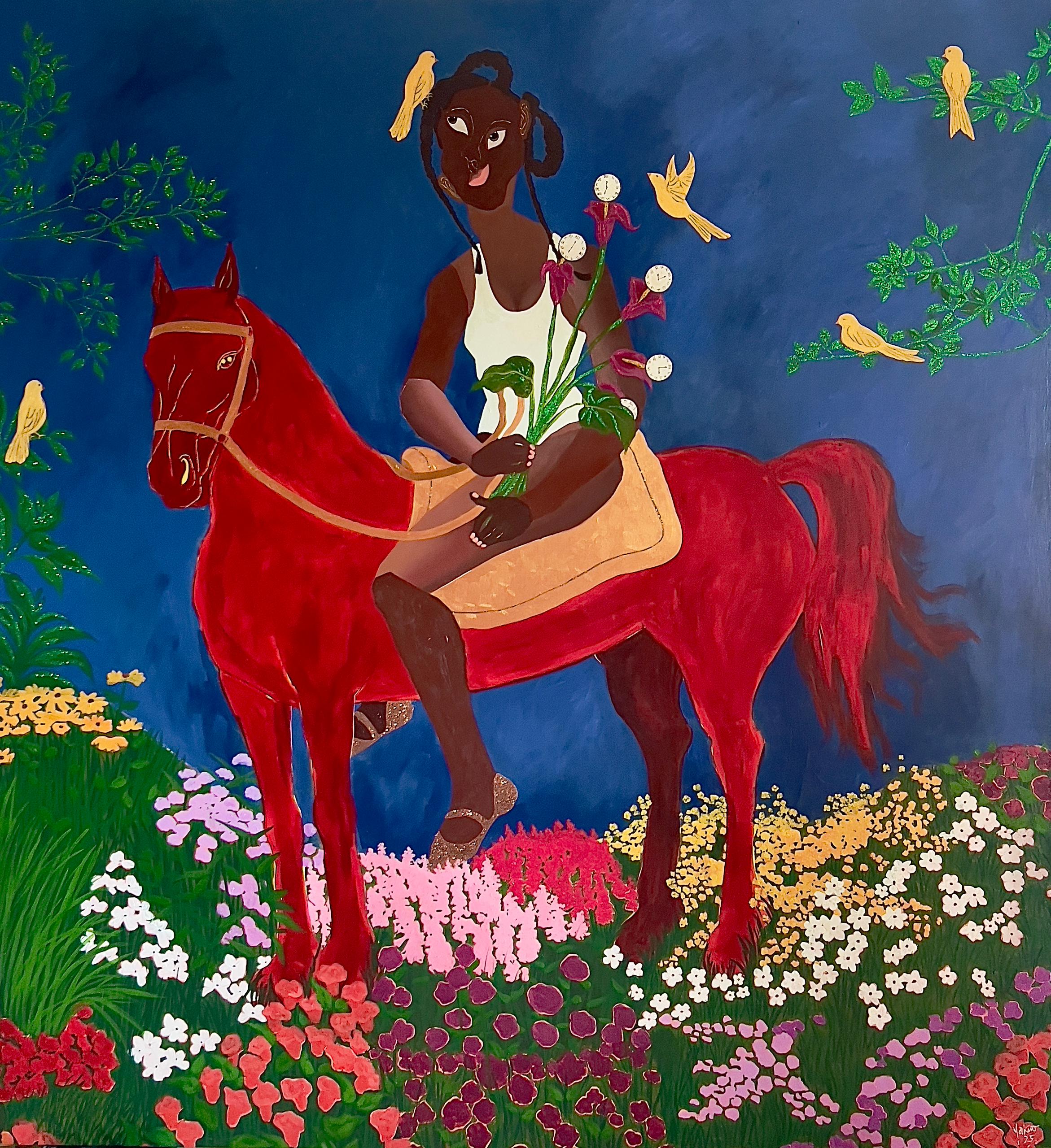 This painting is not about conquest — it is about presence without performance. Seated upright on a horse, the figure holds her own center not through dominance, but through calm. She is composed and self-defined, a woman no longer reshaping herself to ease the discomfort of others. Her poise is not decoration; it is a declaration.