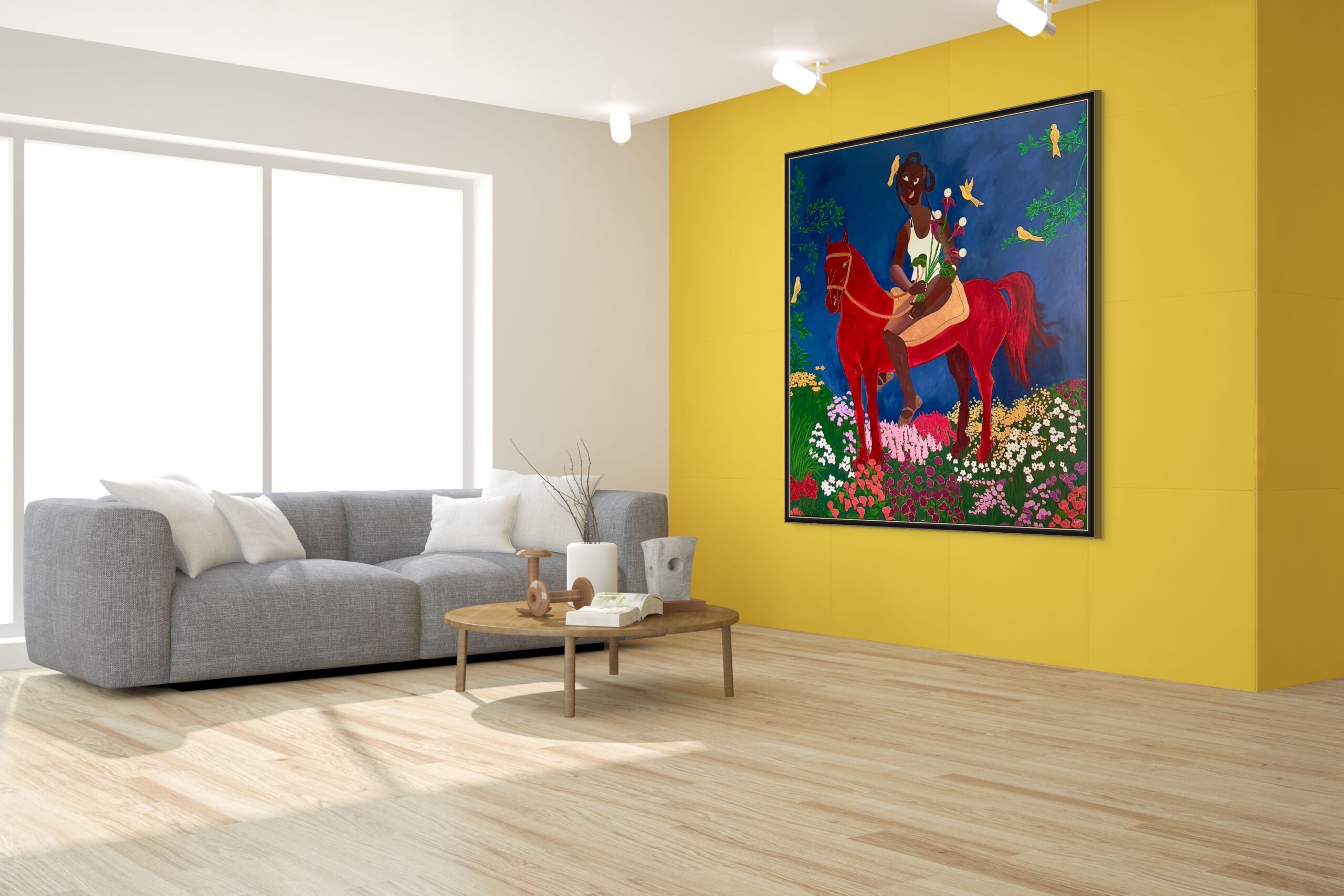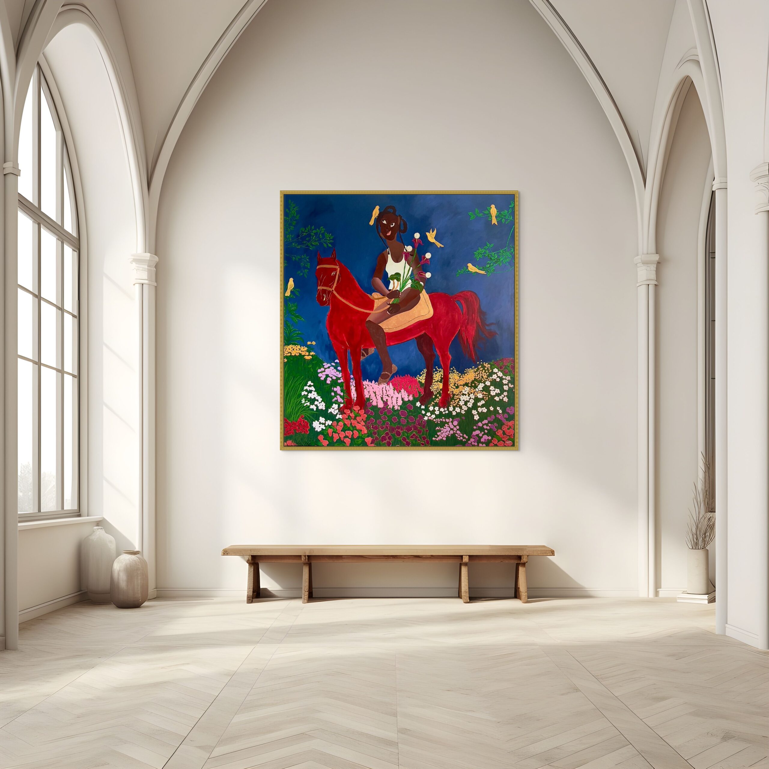 Surrounded by wild blooms and soft yellow birds, she is embraced by nature rather than judged by it. The untamed garden beneath her mirrors her refusal to be pruned into societal ideals. She rides not to escape, but to remain grounded within herself — astride a creature once symbolizing control and warfare, now reimagined as softness and grace.
