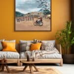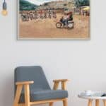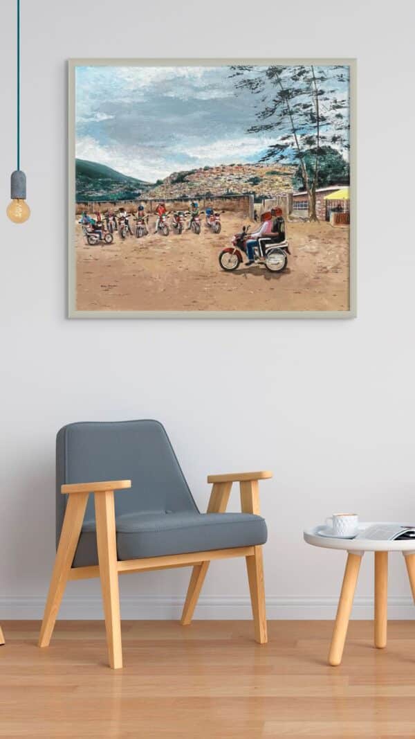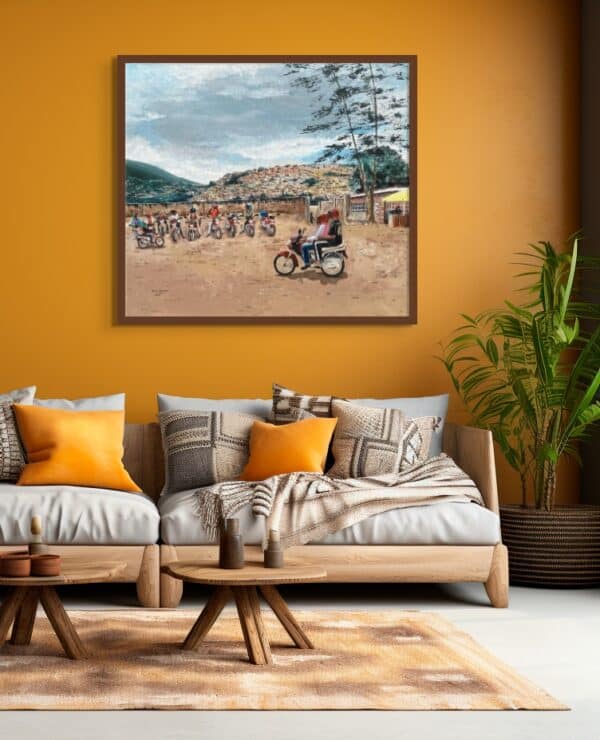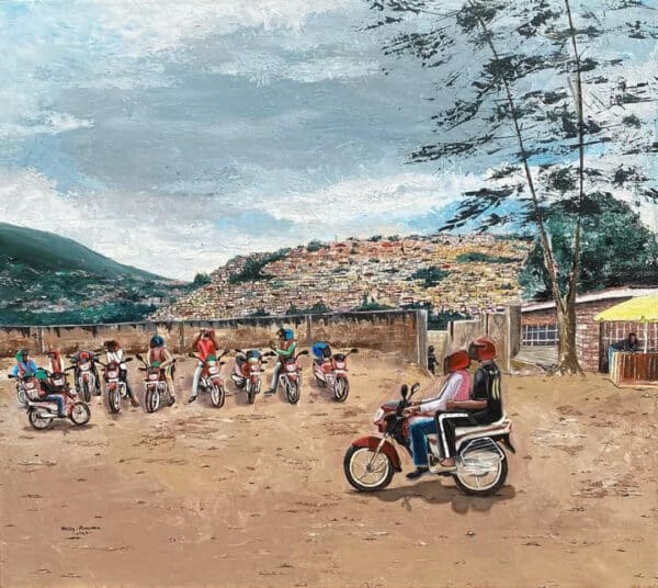 This original, one-of-a-kind painting, created in the Impressionist style, captures the landscape of Kigali, Rwanda, with its rolling hills. It was inspired by motorcycles waiting for passengers, with riders encouraging each other to remain patient through the wait.