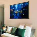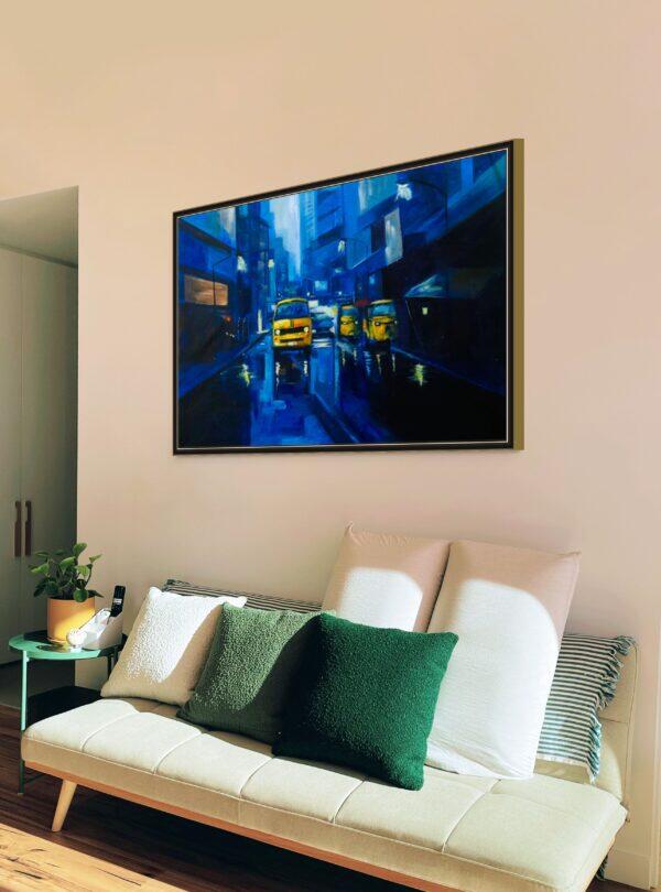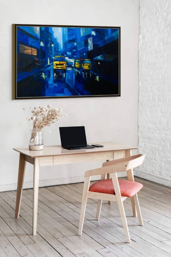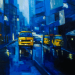 This artwork captures the essence of a rainy evening in Lagos, affectionately known as “Lasgidi” to its locals. Set against the backdrop of towering buildings, the iconic yellow danfo buses glide through slick, wet streets, their headlights reflecting off the shiny asphalt. Cool, calming shades of blue dominate the scene, symbolizing the often-overlooked serenity within the bustling chaos of Lagos. Despite the rain, life in the city moves forward—portraying the resilience and spirit of its people.