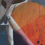 Learning to Let Go is part of the Emotional Distress/Resilience and Coping series. The curled line represents an abstracted hand, painted over warm orange tones symbolizing fire. Black squares appear to fall from the hand into a deeper shade of orange.