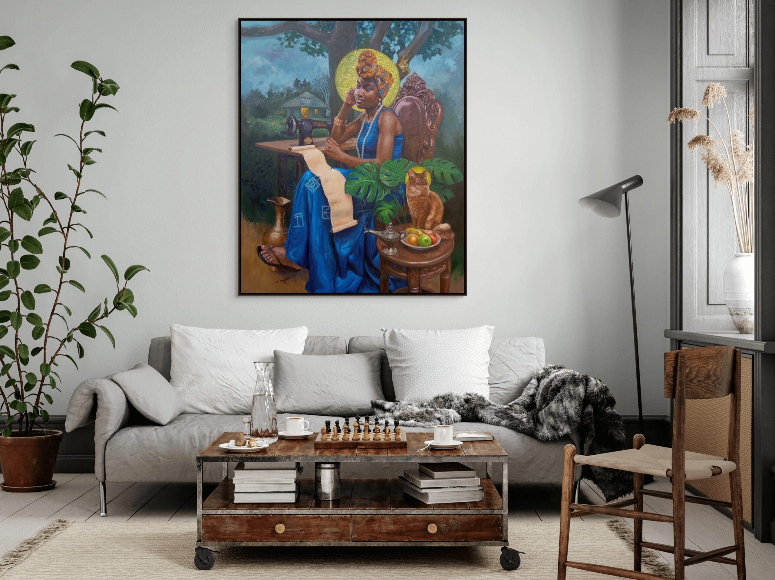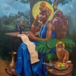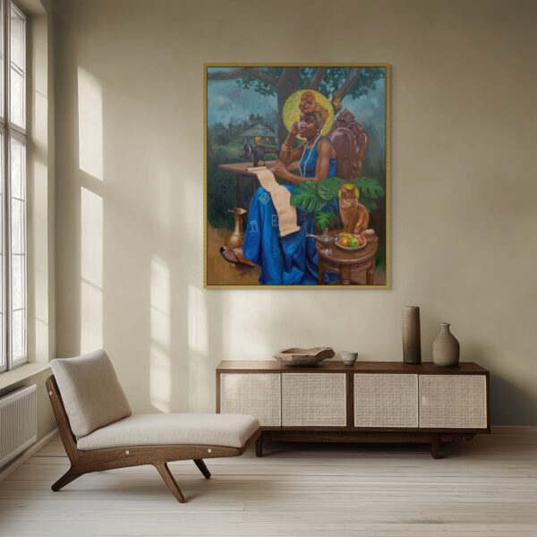 The central figure is the seeker, majestically adorned, her flowing dress bearing ancient African symbols of royalty and divinity. Her expression conveys anticipation, softened by a quiet calm—as though suspended between nostalgia and expectancy.