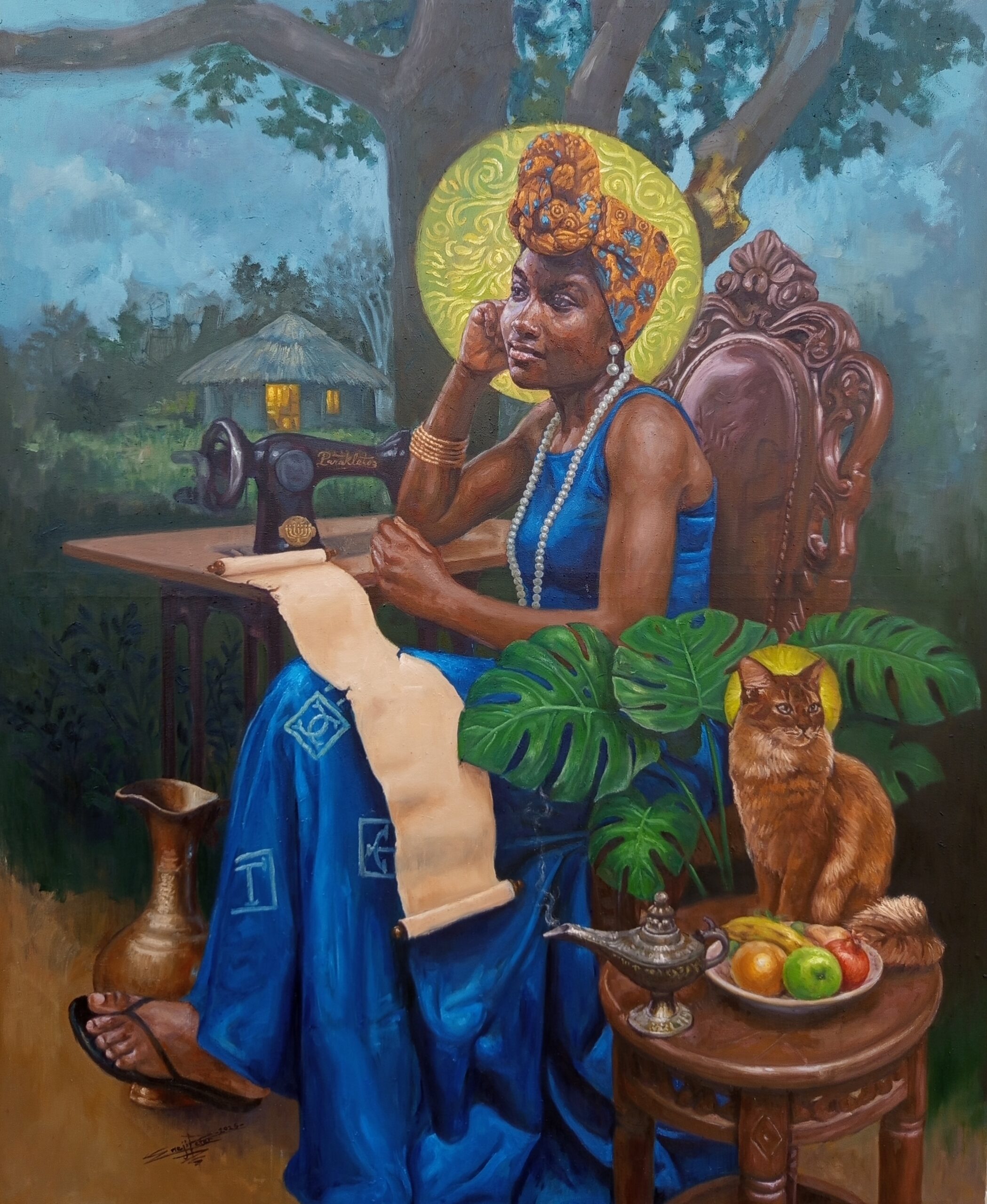 Beside her, the sewing machine serves as a powerful metaphor: on one hand, the unfolding process of life’s journey; on the other, an endowment of potential, capacity, and creativity.