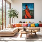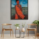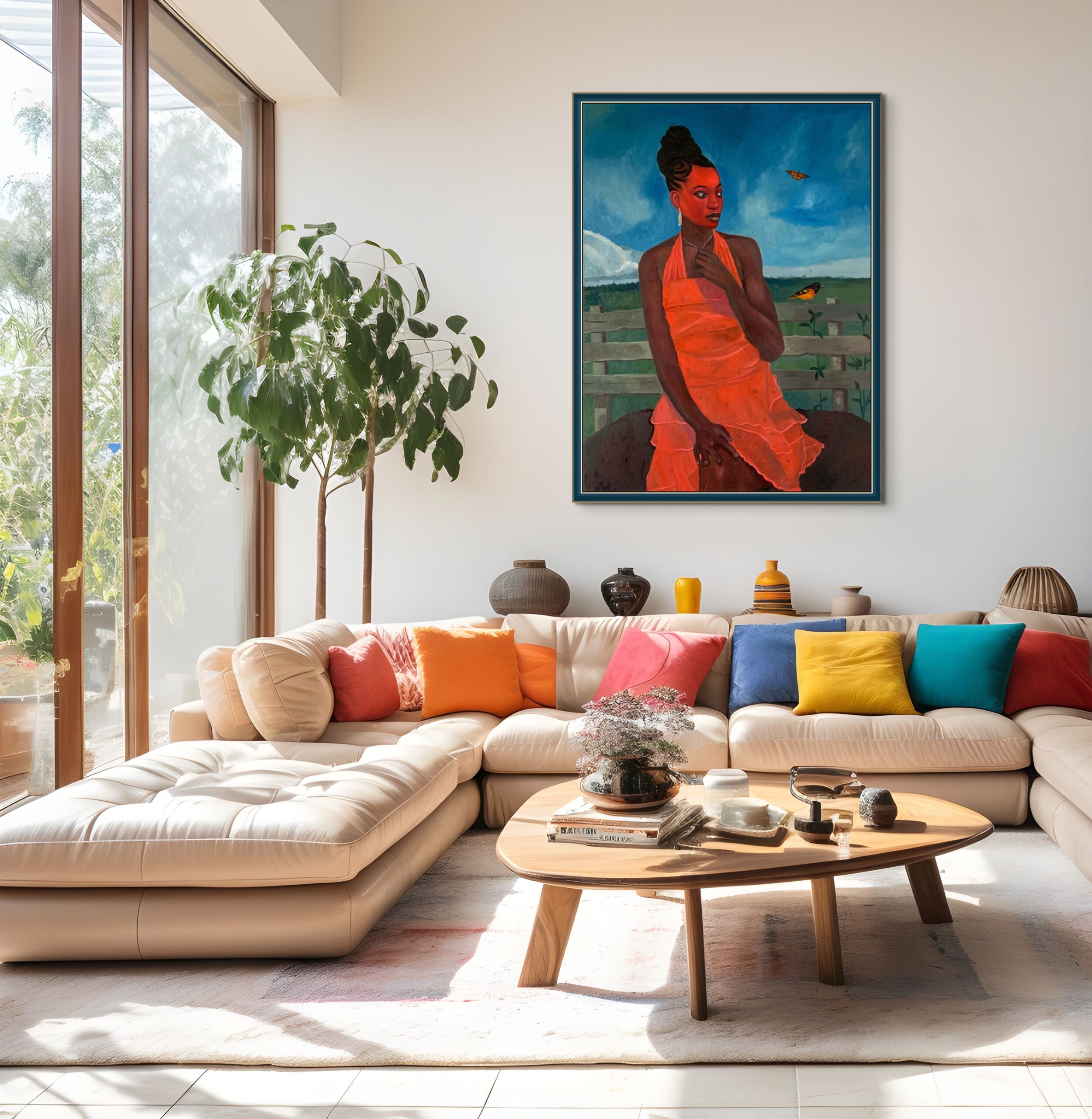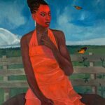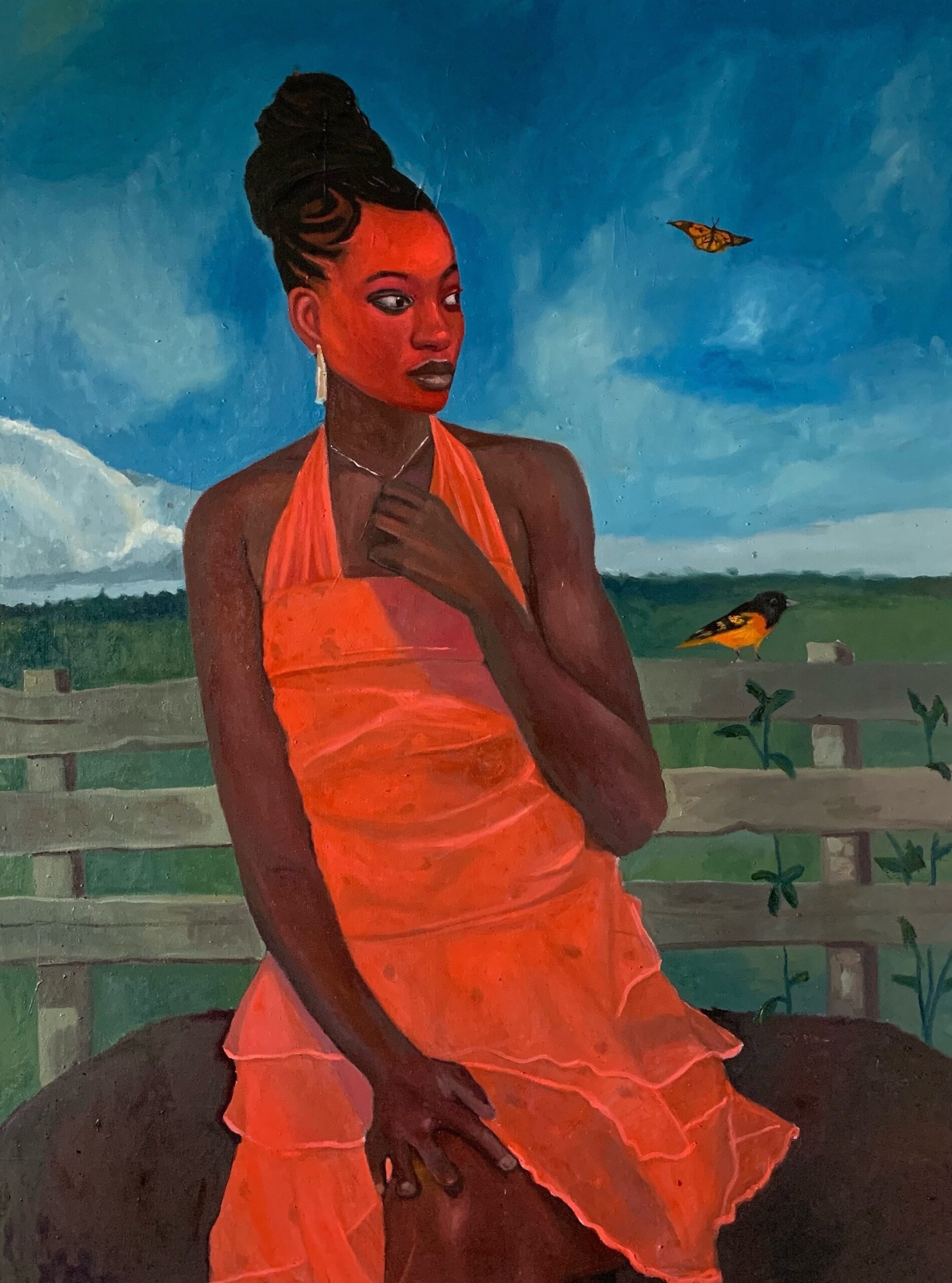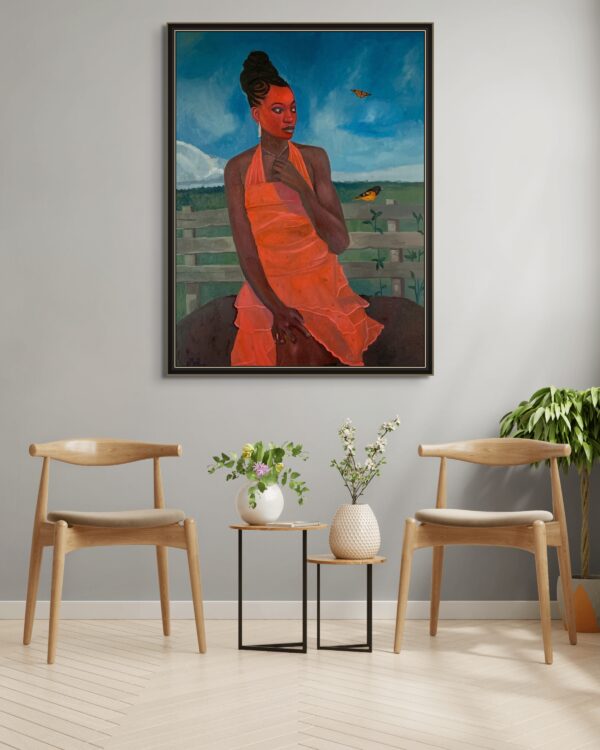 This painting is a reflection on beauty, presence, and the quiet power of connection with nature. The central figure, adorned in a striking orange dress, stands confidently against a serene rural backdrop, her gaze directed into the distance—suggesting contemplation, resilience, and self-awareness. Her rich, radiant skin tone contrasts beautifully with the vibrancy of the dress and the vastness of the blue sky, creating a powerful visual harmony that speaks to both strength and elegance.