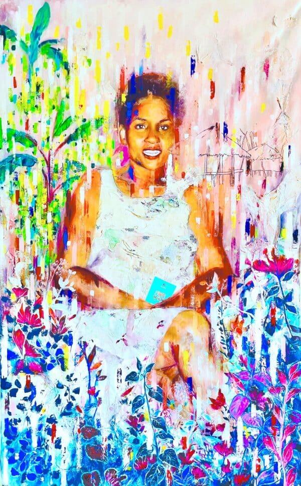 Her background is fully abstract: a cascade of chromatic gestures that suggests not just a loss of form, but a transformation into something new. In this interplay between realism and abstraction, the painting explores how we hold ourselves together—and, just as often, let ourselves become something else.