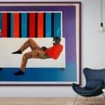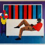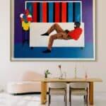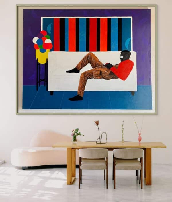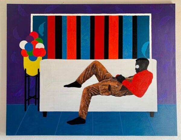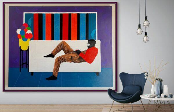 In this serene and thought-provoking painting, a man relaxes effortlessly on a white couch, his posture slouched yet peaceful, embodying a quiet contentment. The soft, flowing lines of the couch contrast with the gentle curves of his body, creating an atmosphere of calm, as if time itself has slowed down around him.