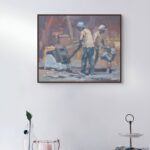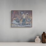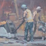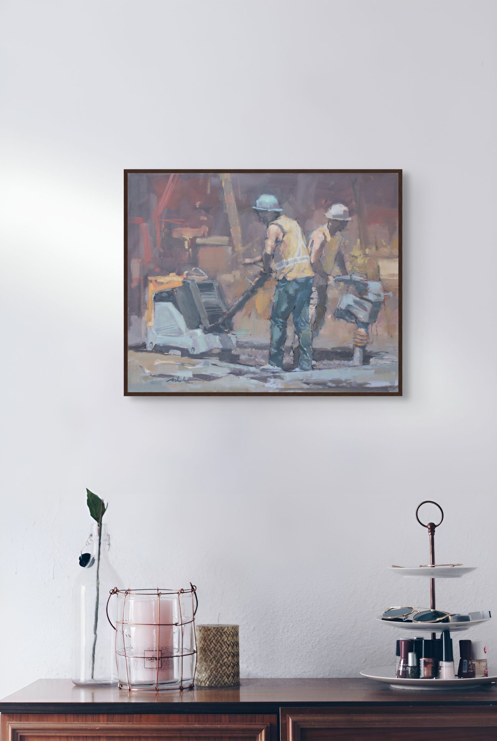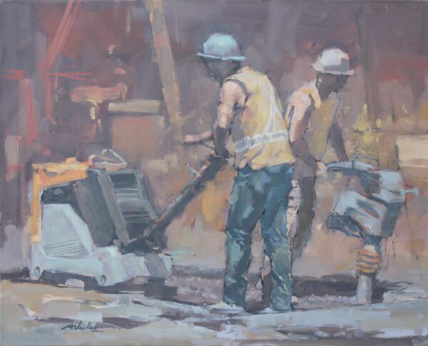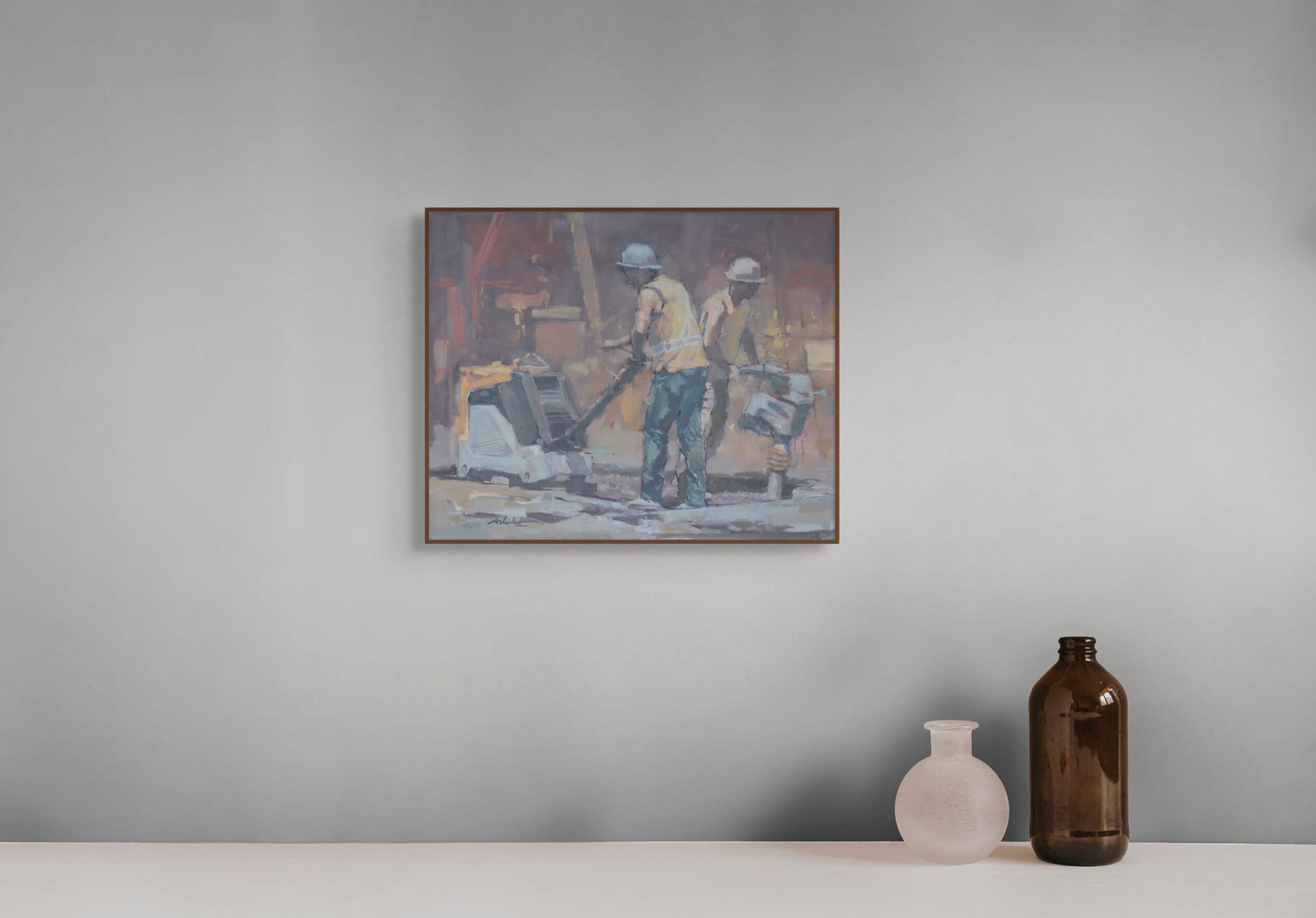 Evening settles softly over the street as two workers continue their task, their movements steady and purposeful amid the dust and fading light. The scene hums with the quiet intensity of labor—tools striking the ground, muscles engaged, the city slowly reshaped beneath their hands. Warm tones and subdued shadows wrap the moment in a sense of time passing, where effort becomes rhythm and the ordinary reveals its quiet grandeur. Here, the street is not just repaired; it is lived, built, and carried forward by those who shape it.