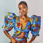 Her thoughtfully designed attire embraces her form, with bold, structured sleeves that frame her silhouette like the wings of a queen. The striking interplay of warm and cool tones creates a captivating contrast, making her presence almost luminous against the muted backdrop. Her hands rest gently against her body, and her poised movement radiates quiet power, anchoring her in the present while honoring the strength of her heritage.