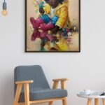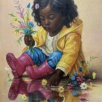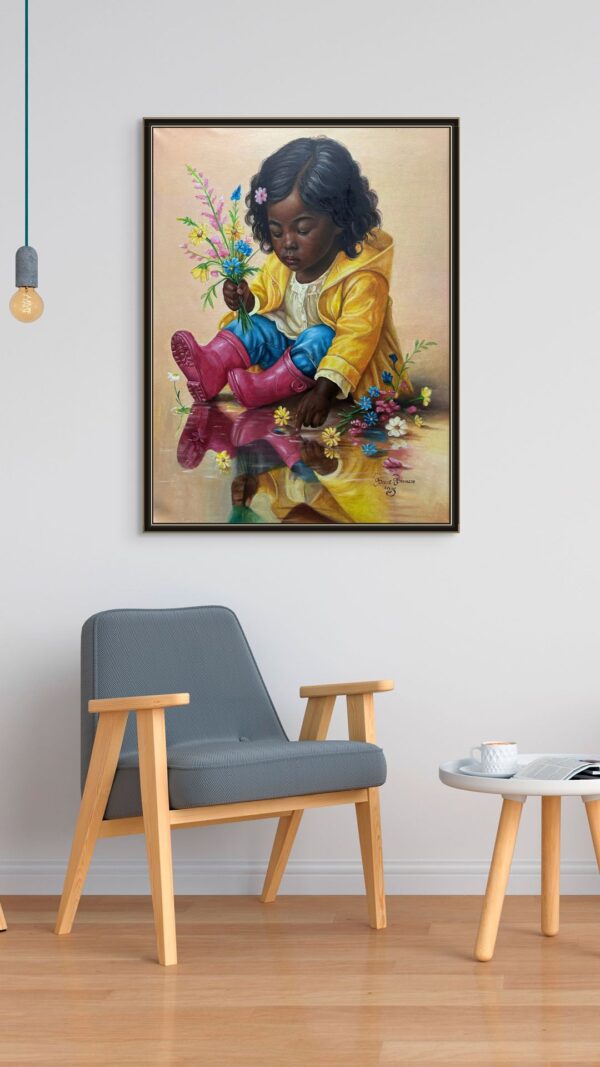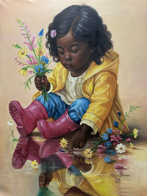 Reflection captures a calm, intimate moment of childhood curiosity and innocence. The painting features a young child sitting quietly, holding a small bunch of wildflowers while gazing into a pool of water. Her focus on the reflection suggests a gentle moment of discovery, where awareness and self-understanding begin to take shape.