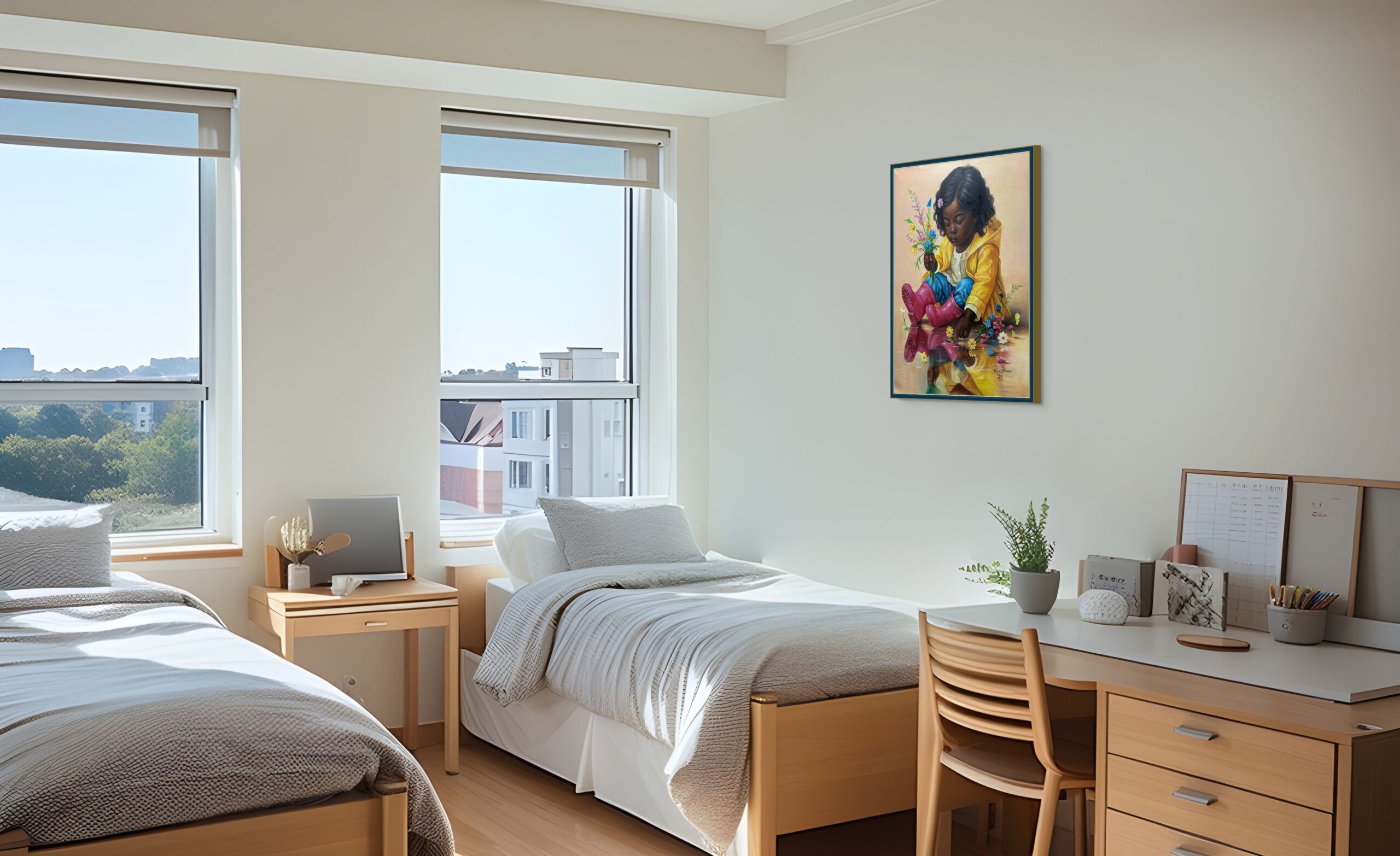 The flowers symbolize purity, growth, and the fragile beauty of childhood, while her hand reaching into the water expresses natural curiosity and wonder. Reflection goes beyond a physical moment; it becomes a quiet meditation on identity, growth, and the tender beginnings of self-discovery.