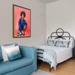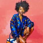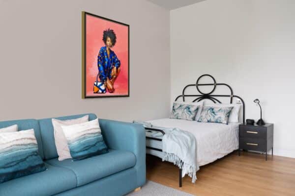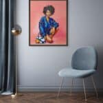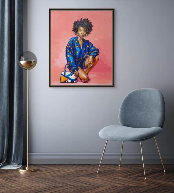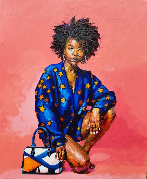 Her voluminous natural hair, rendered in bold impasto strokes, reflects not only the richness of her heritage but the unbounded freedom of her expression. Set against a luminous pink background, her presence is both grounded and ethereal, amplifying her vibrancy as a symbol of both fashion and identity.
